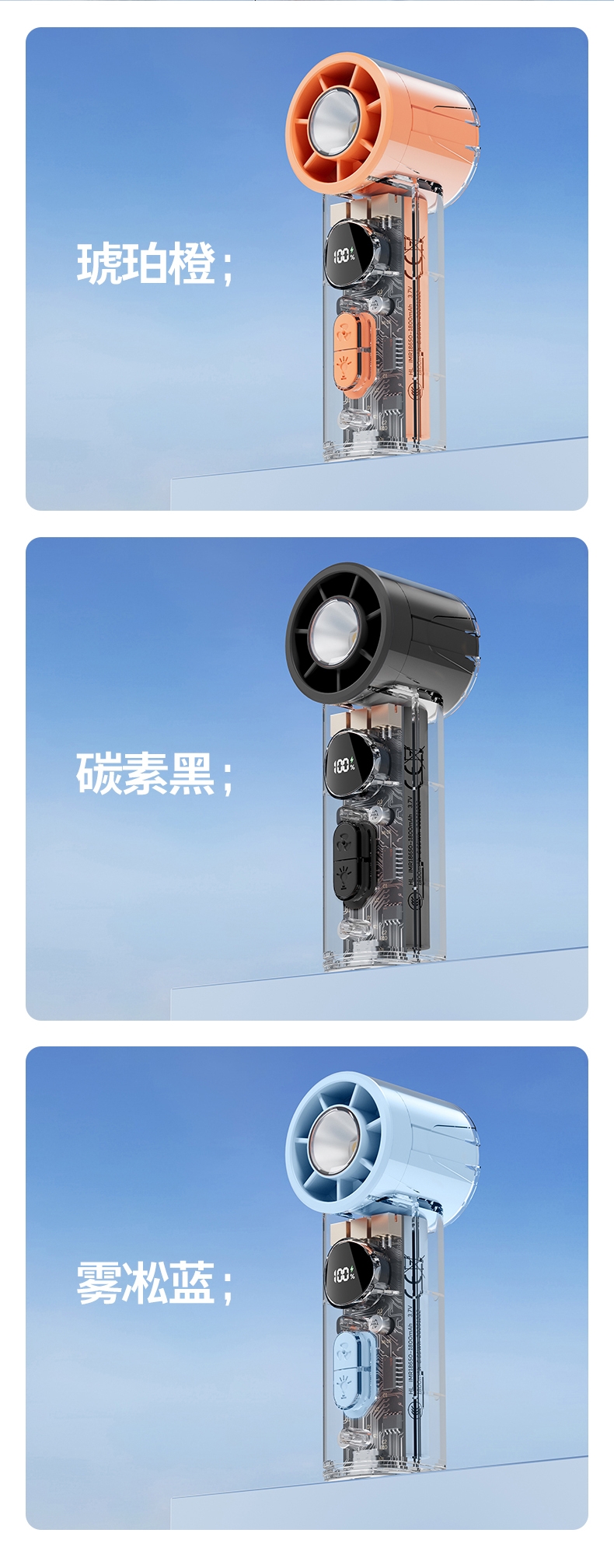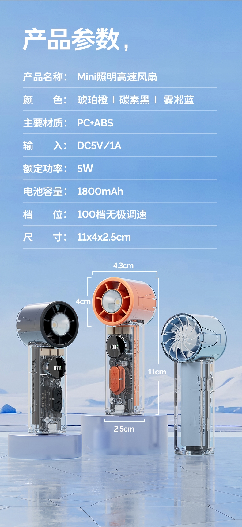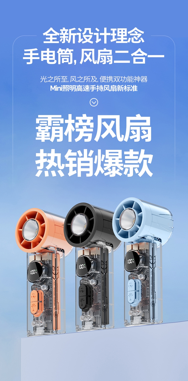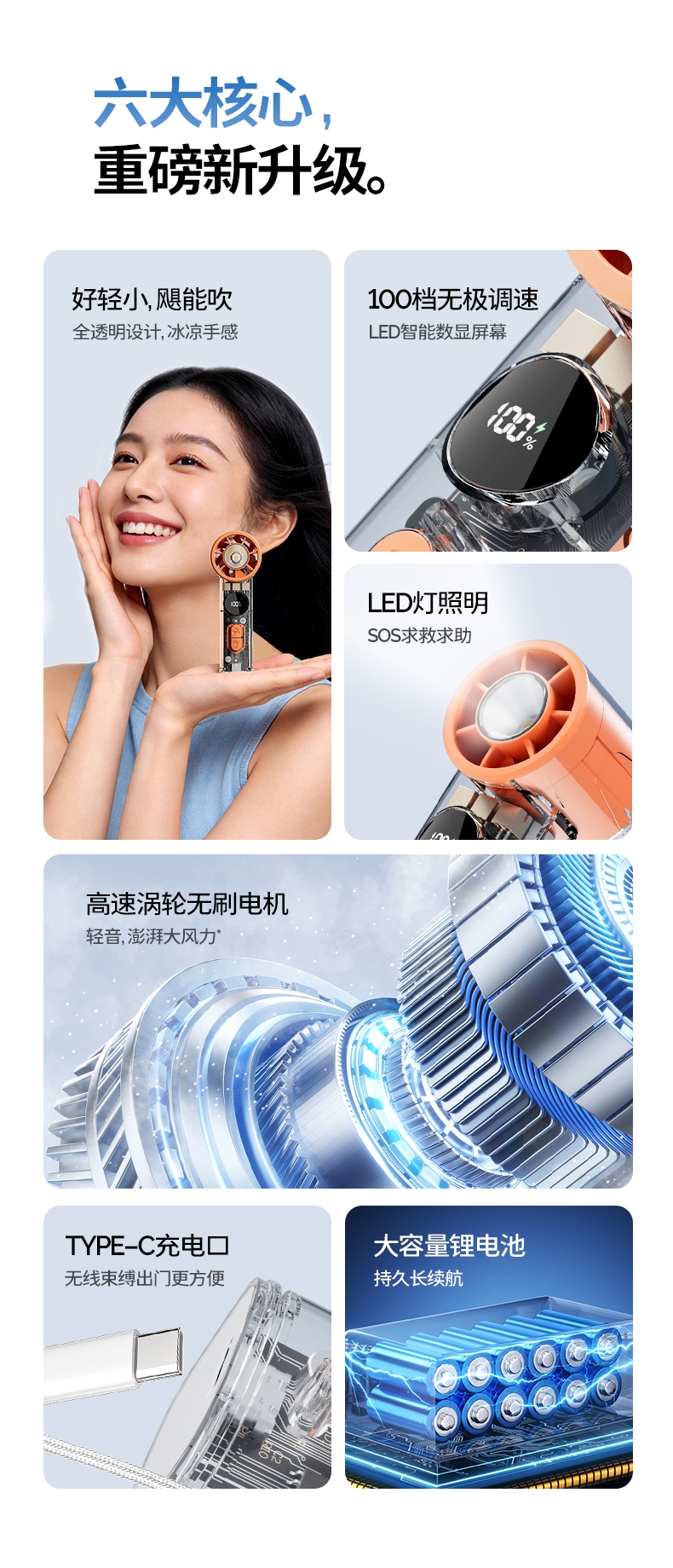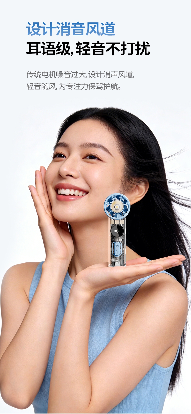 手持+挂壁+手电;无刷电机数显无极调控大容量电池持久续航;高颜值透明机身小巧迷你口袋手持风扇