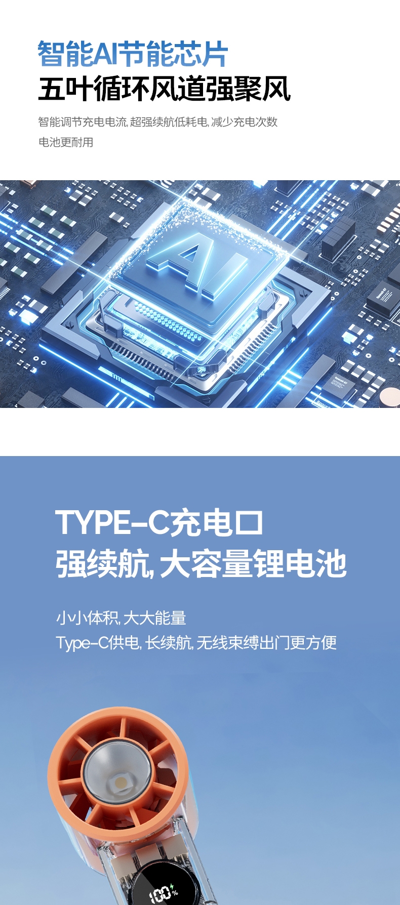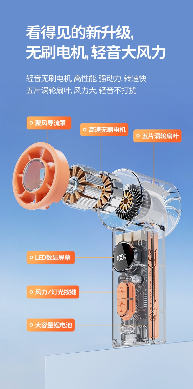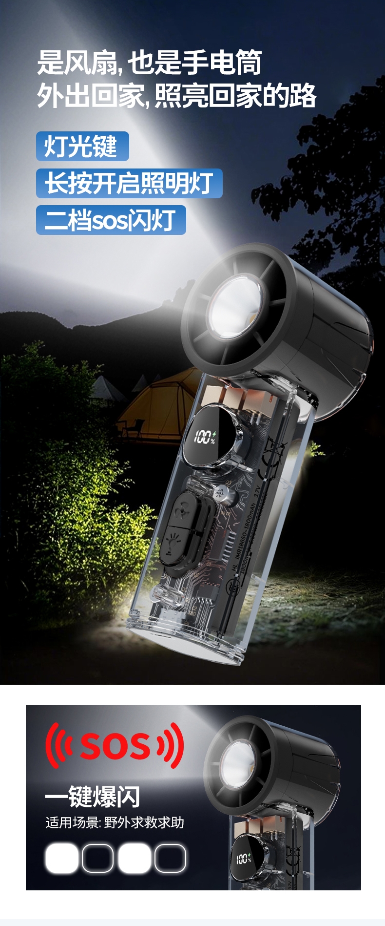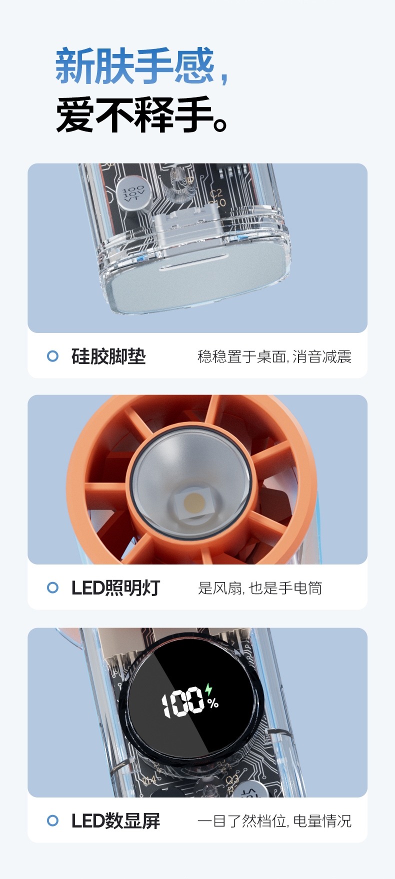 手持+挂壁+手电;无刷电机数显无极调控大容量电池持久续航;高颜值透明机身小巧迷你口袋手持风扇