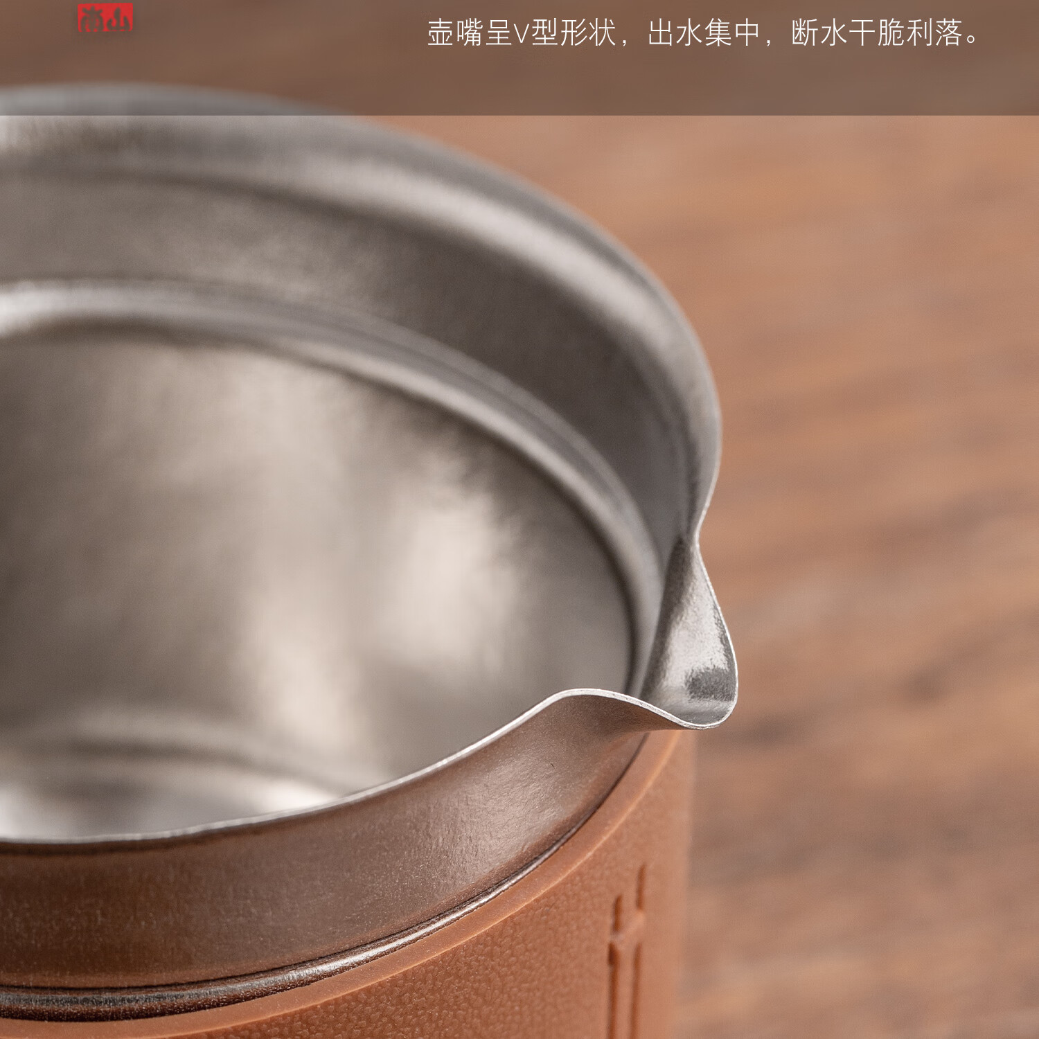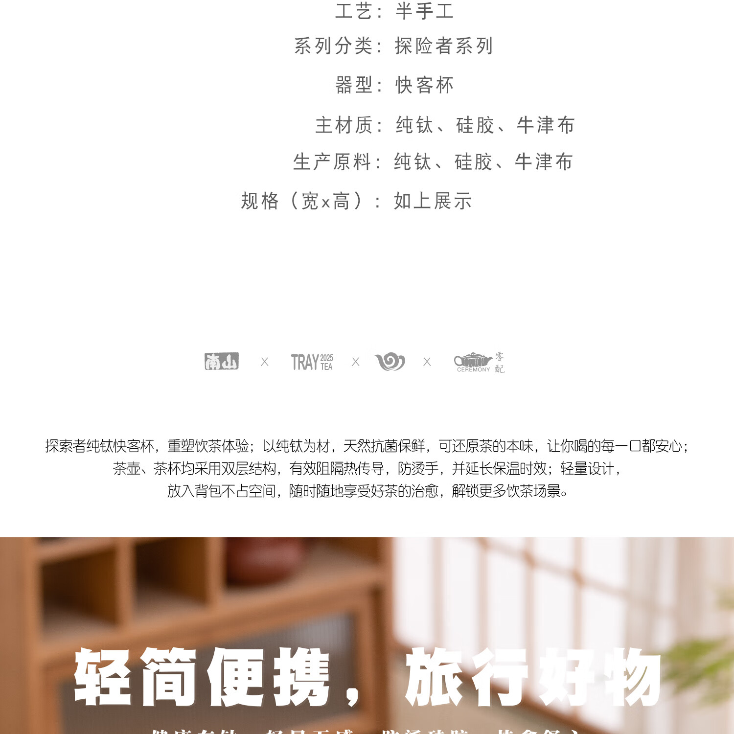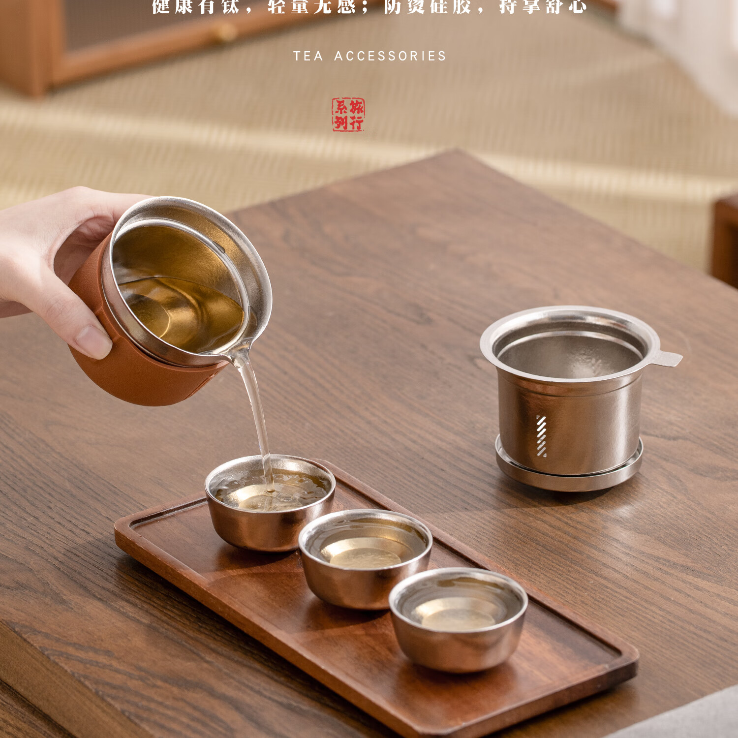 探素者纯钛快客杯,重塑饮茶体验;以纯钛为材;天然抗菌保鲜,可还原茶的本味,让你喝的每一口都安心;茶壶、茶杯均采用双层结构,有效阻隔热传导