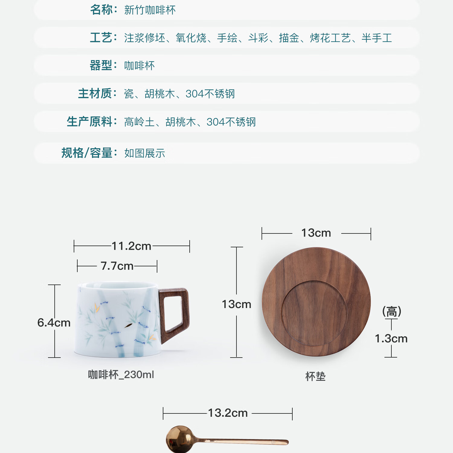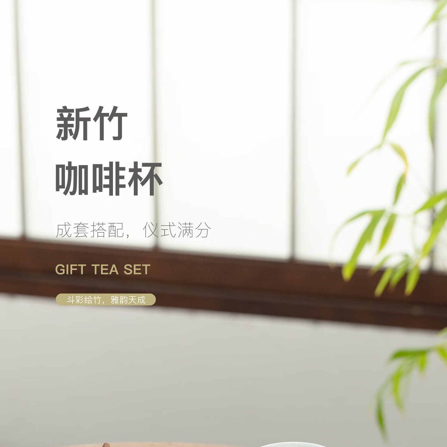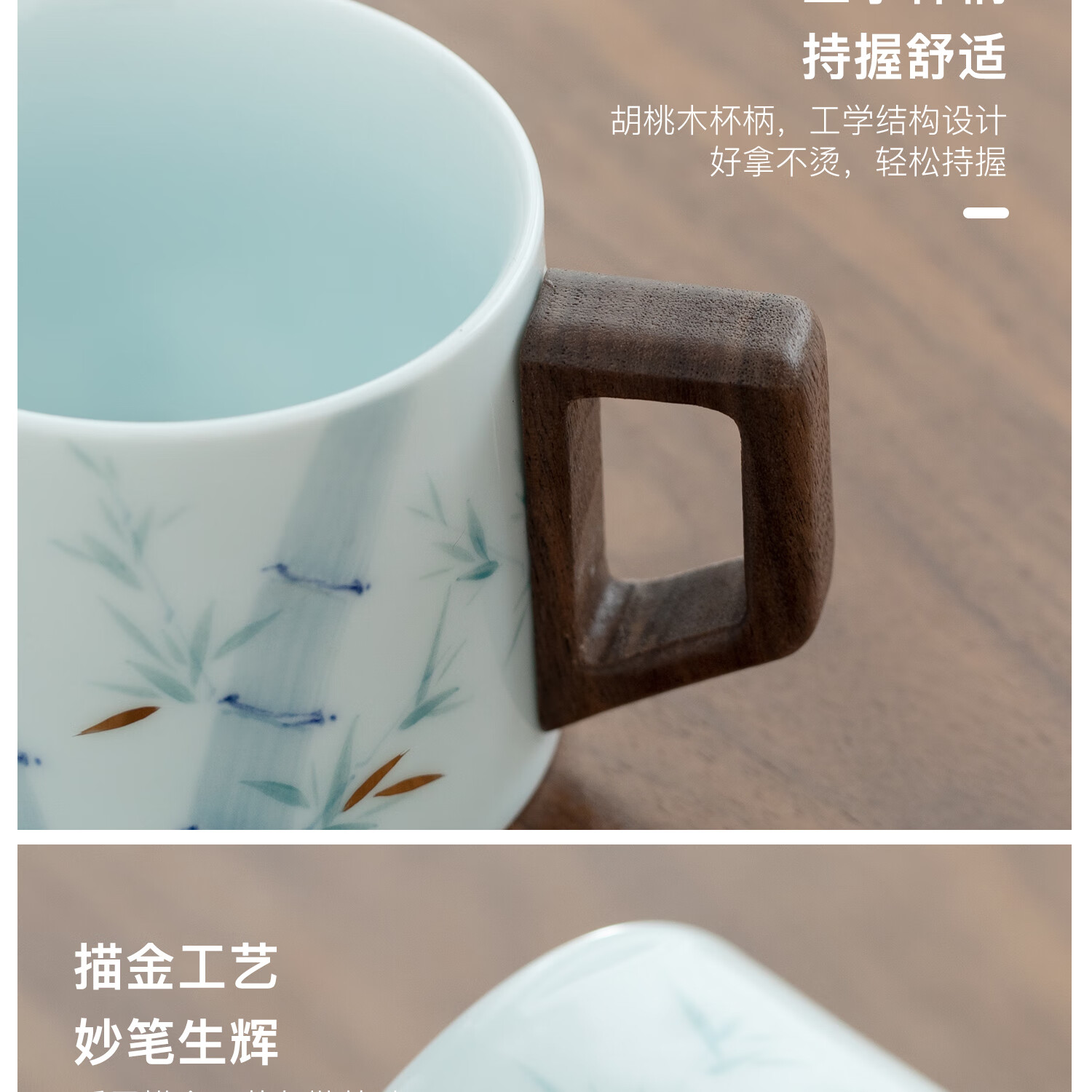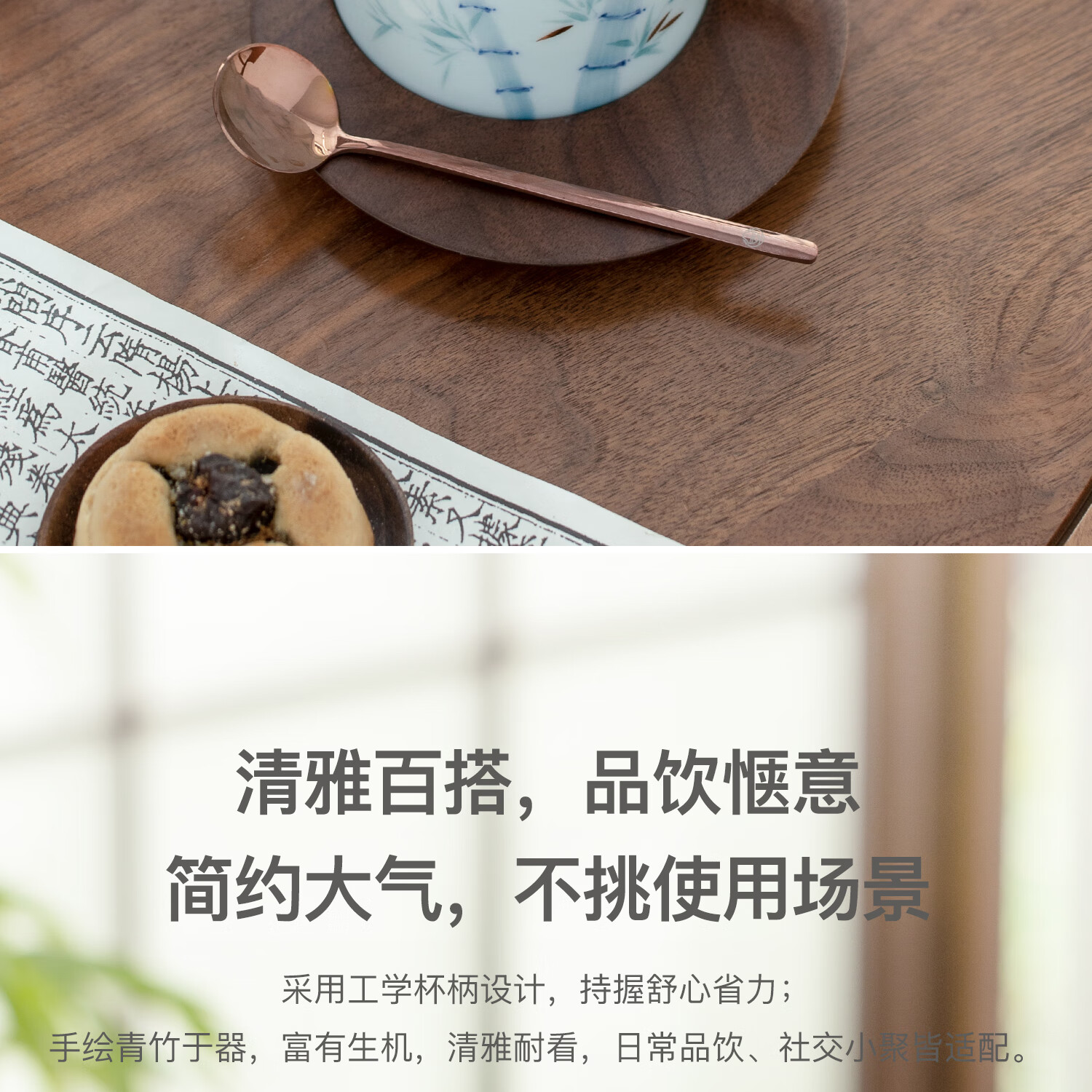 采用工学杯柄设计,持握舒心省力;手绘青竹于器,富有生机,清雅耐看;以白瓷为底,融手绘、斗彩、描金、烤花多重工艺