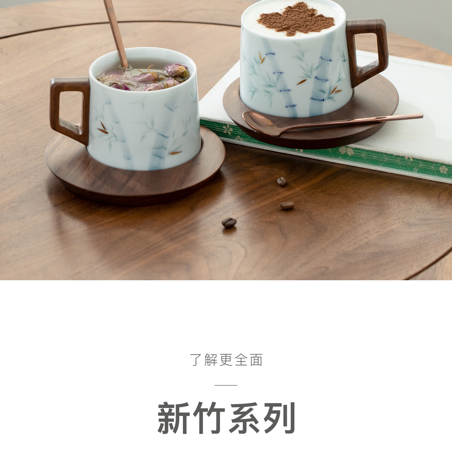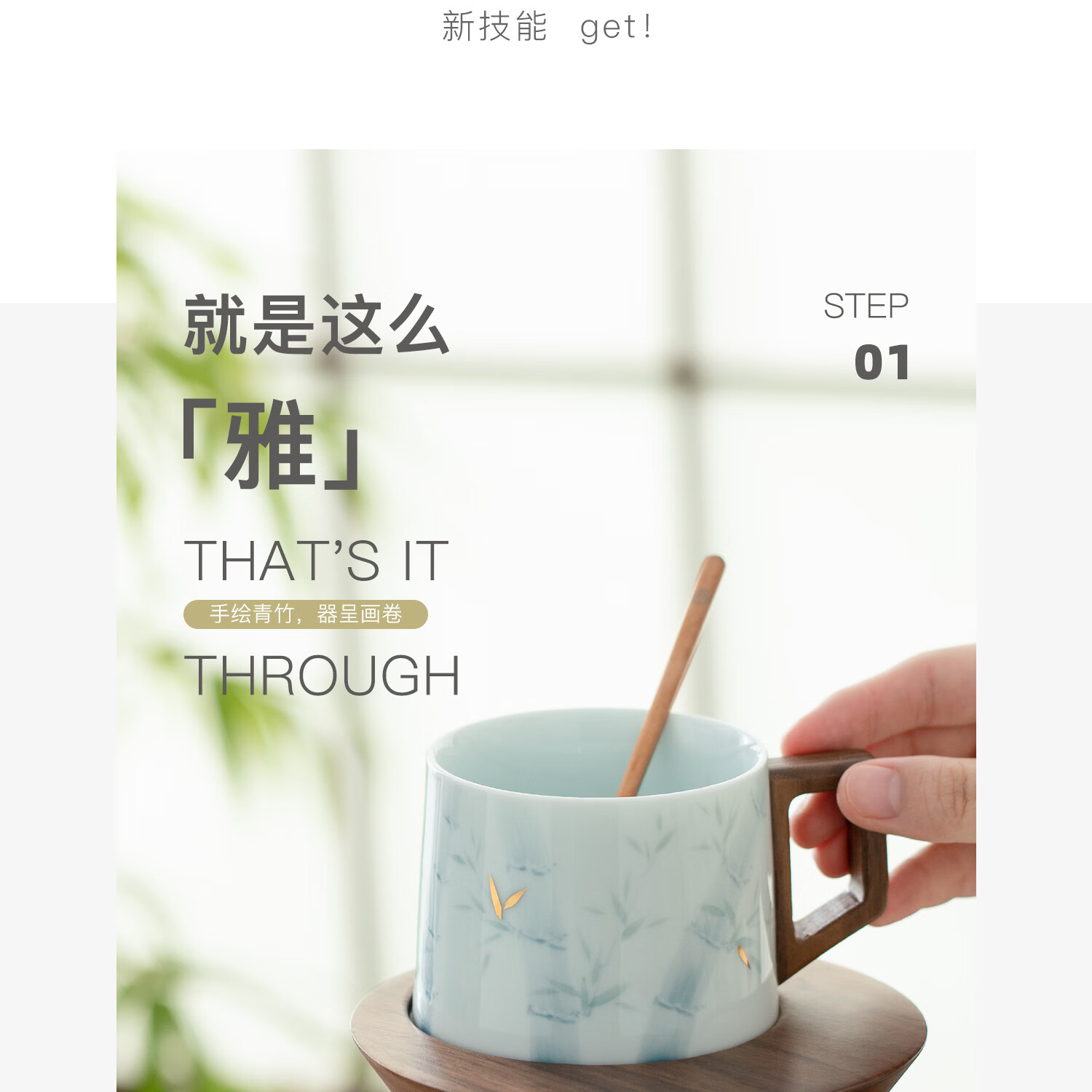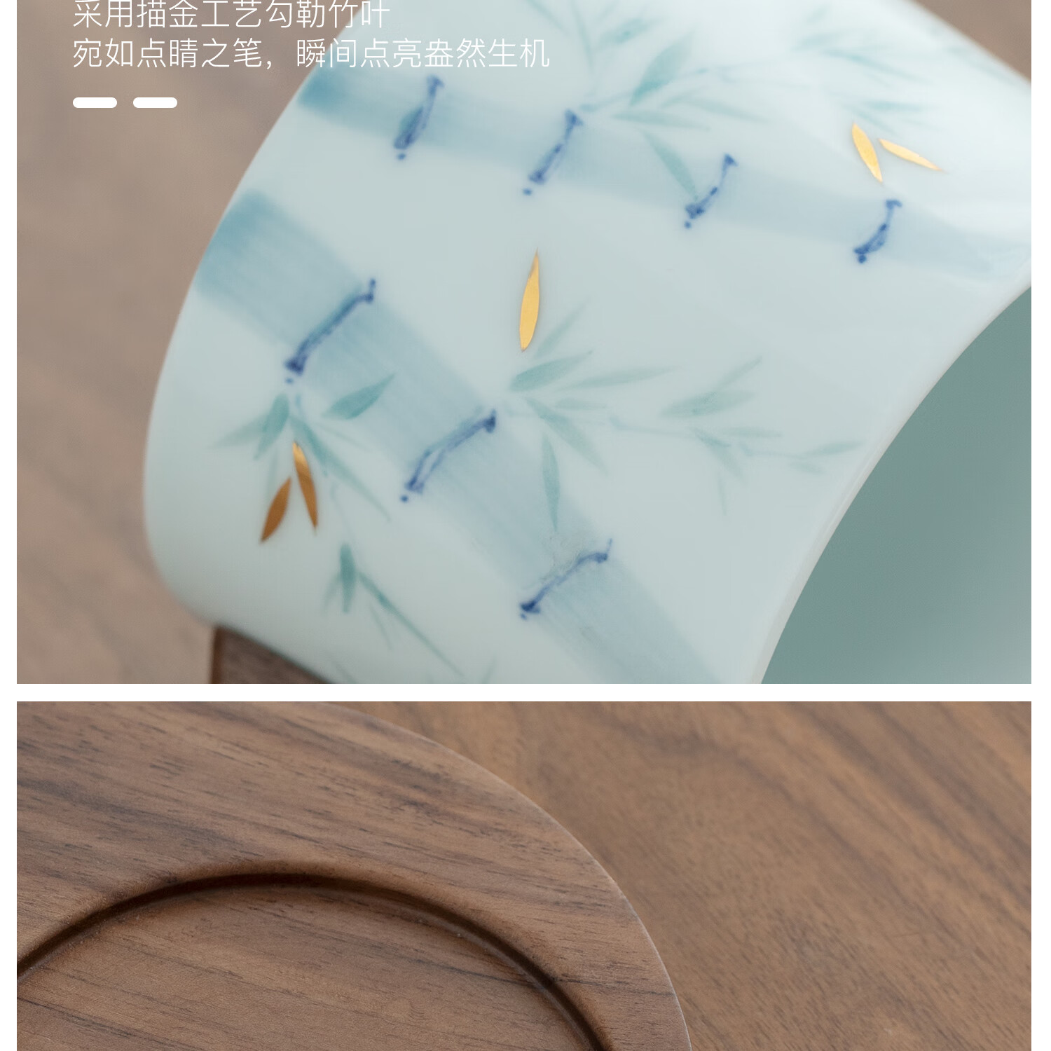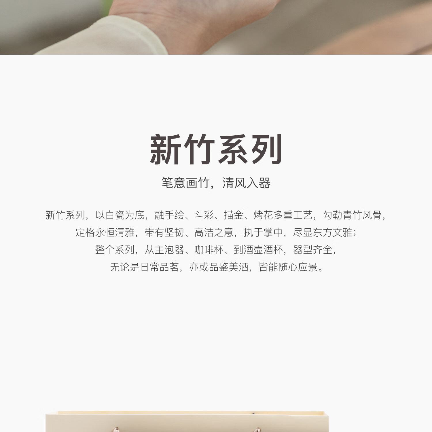 采用工学杯柄设计,持握舒心省力;手绘青竹于器,富有生机,清雅耐看;以白瓷为底,融手绘、斗彩、描金、烤花多重工艺