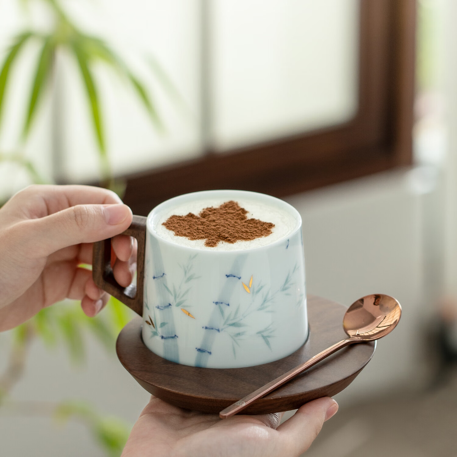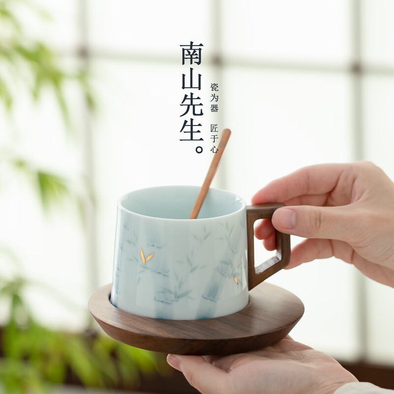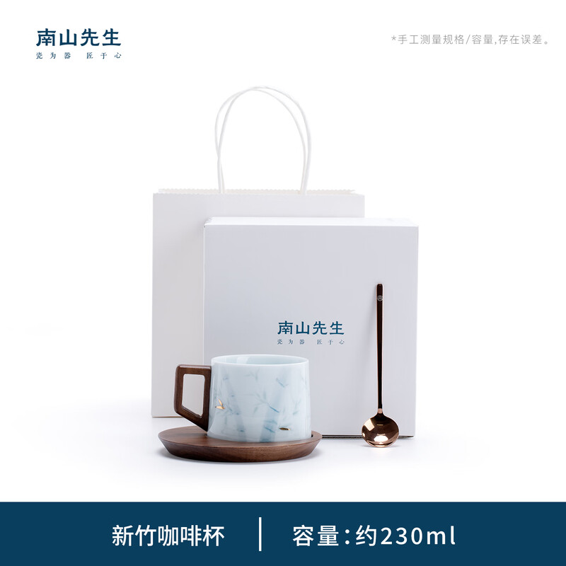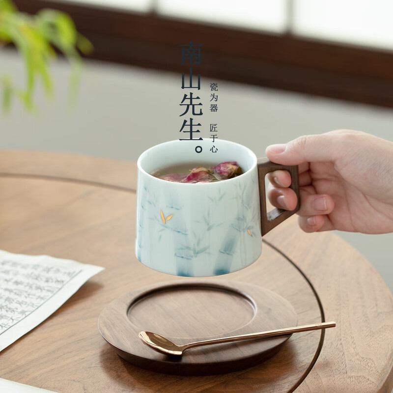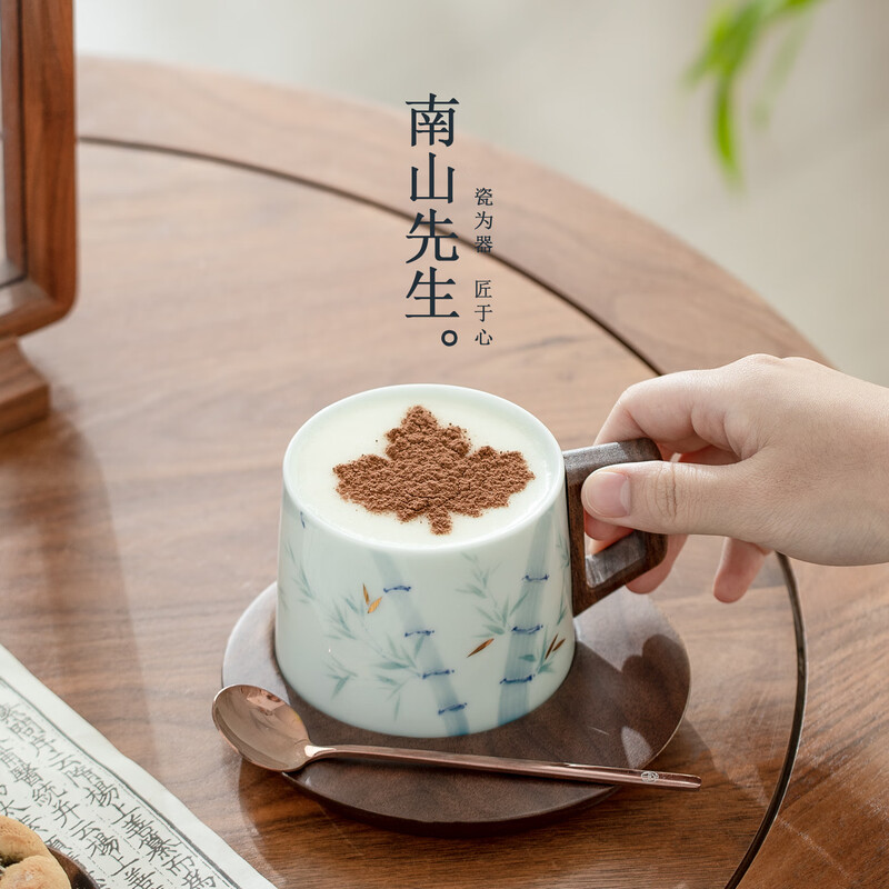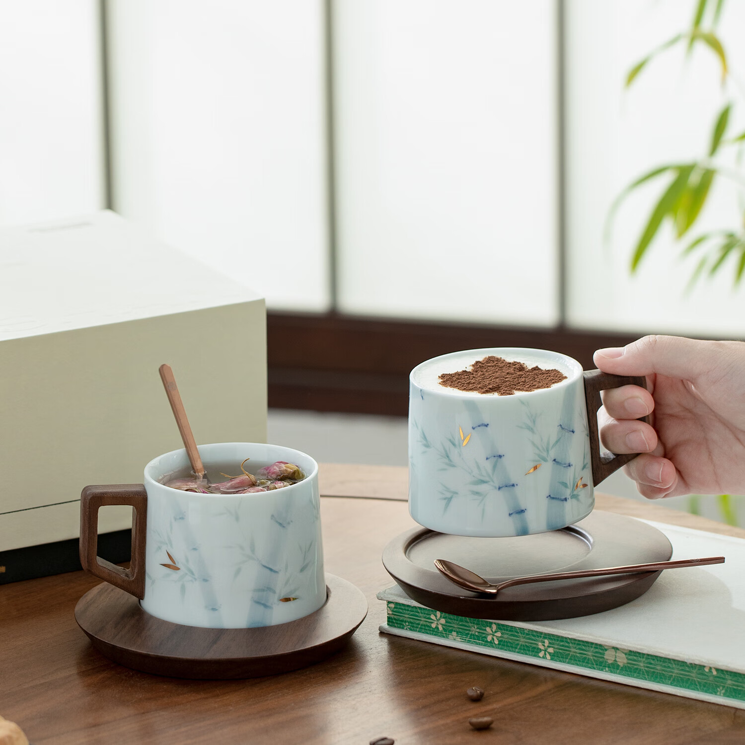 采用工学杯柄设计,持握舒心省力;手绘青竹于器,富有生机,清雅耐看;以白瓷为底,融手绘、斗彩、描金、烤花多重工艺