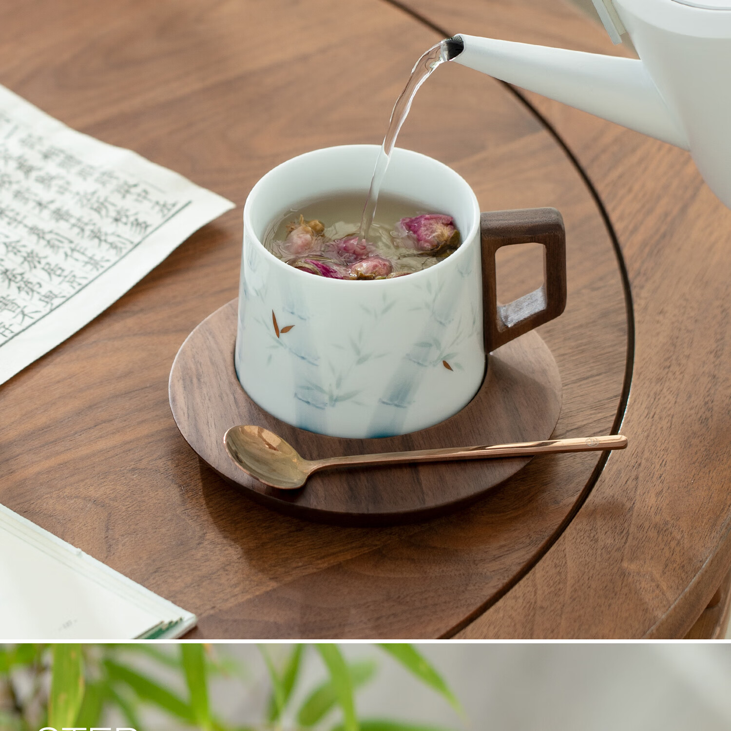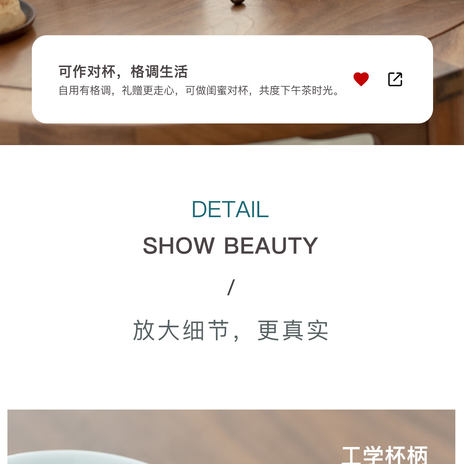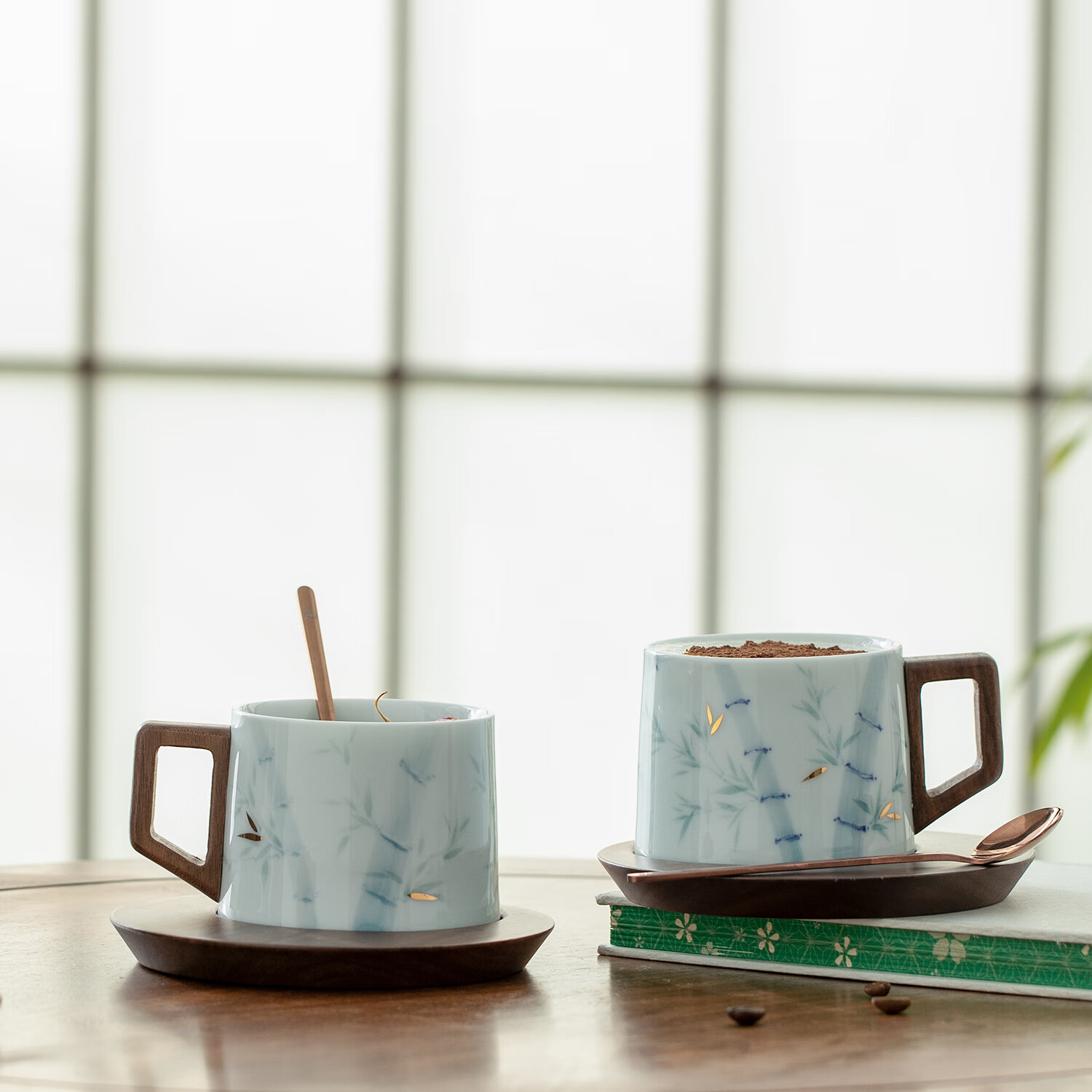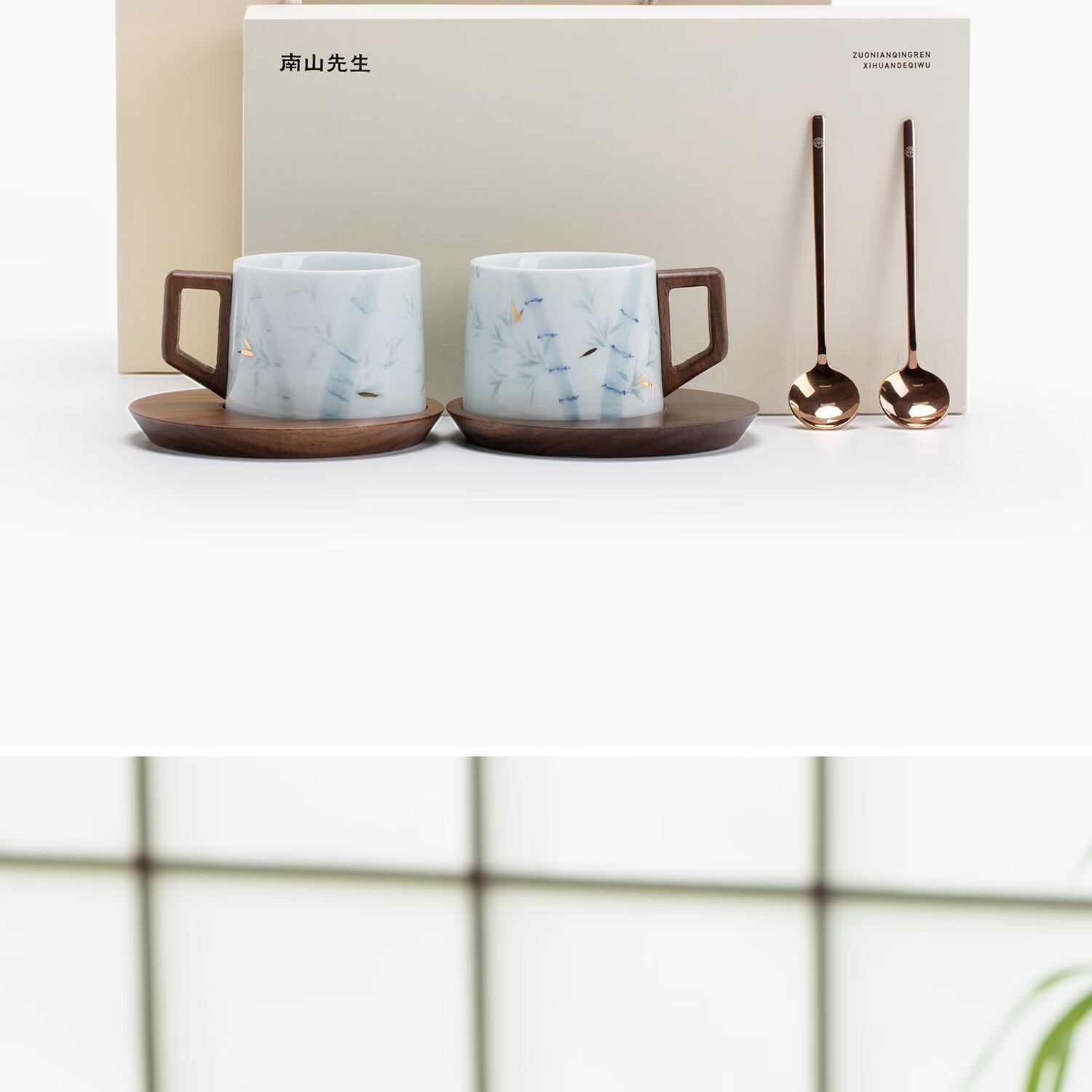 采用工学杯柄设计,持握舒心省力;手绘青竹于器,富有生机,清雅耐看;以白瓷为底,融手绘、斗彩、描金、烤花多重工艺