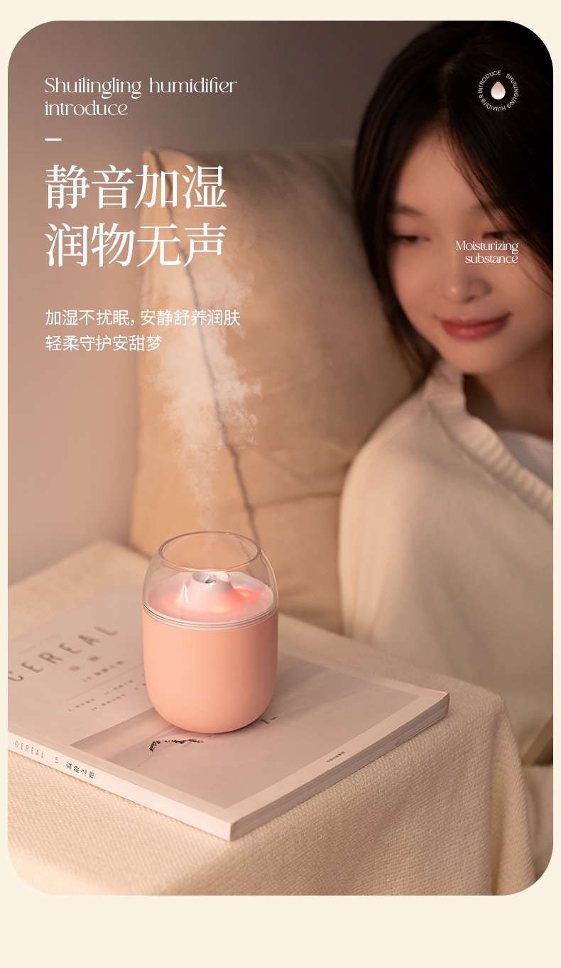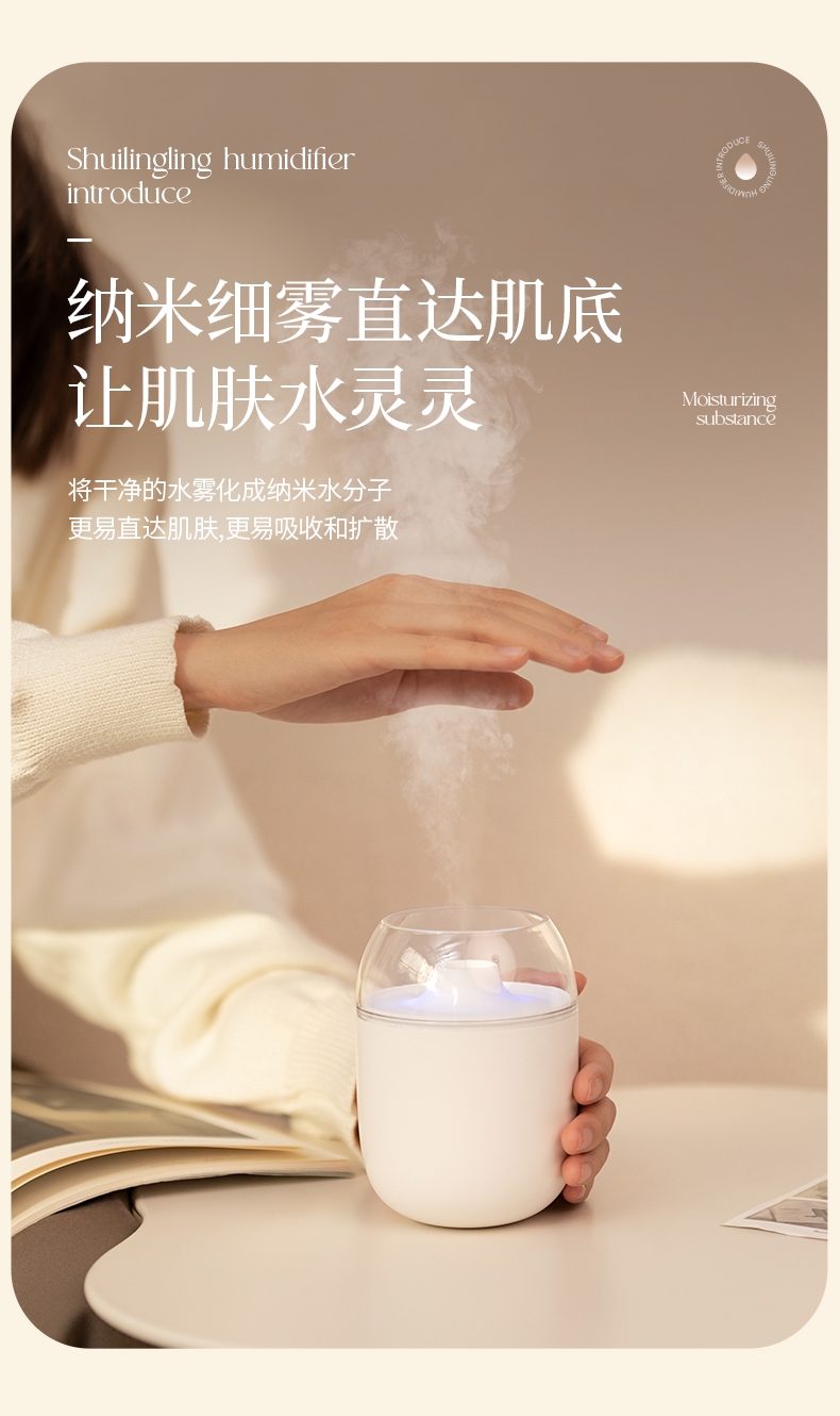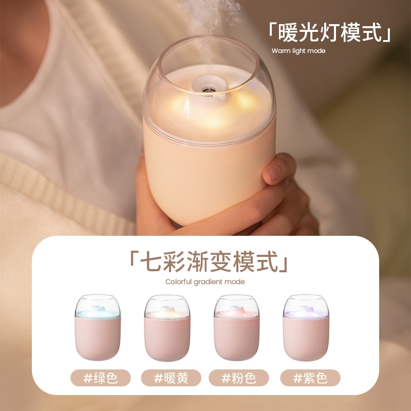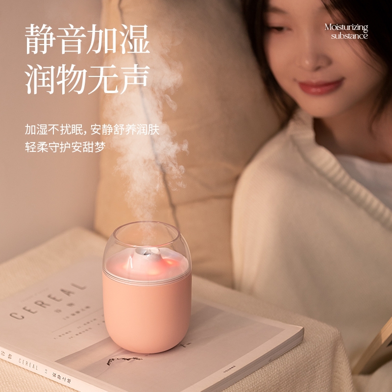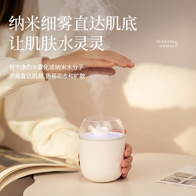多功能加湿器,清凉保湿,静享水润,大喷雾,七彩夜灯;无噪加湿,两档:持续喷雾、间歇喷雾;防干烧,迷你便携,倾倒不漏,易操作