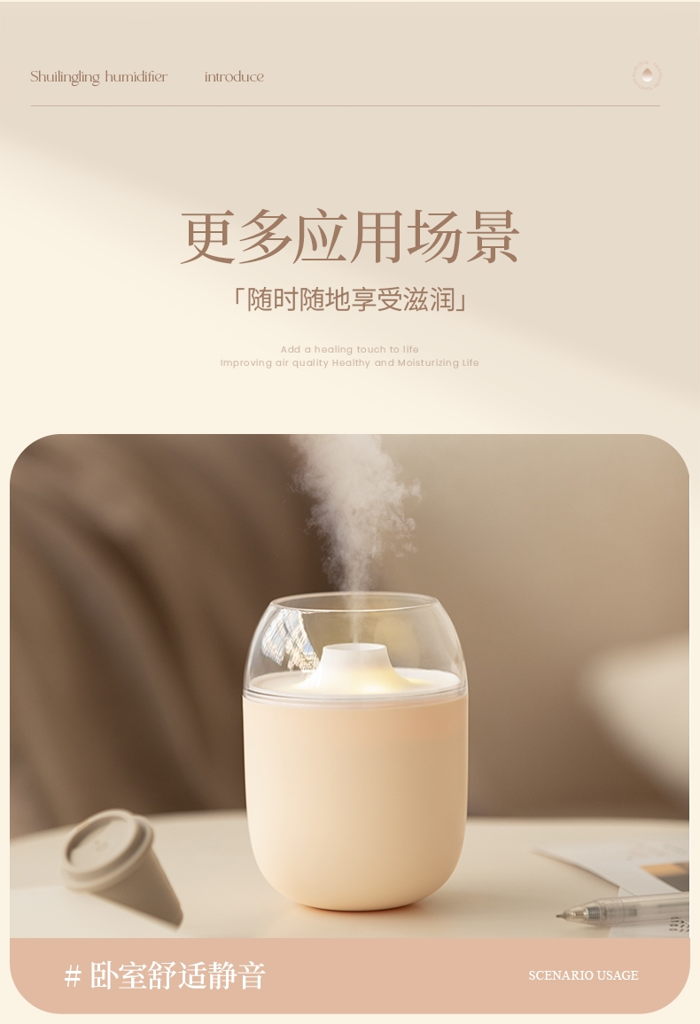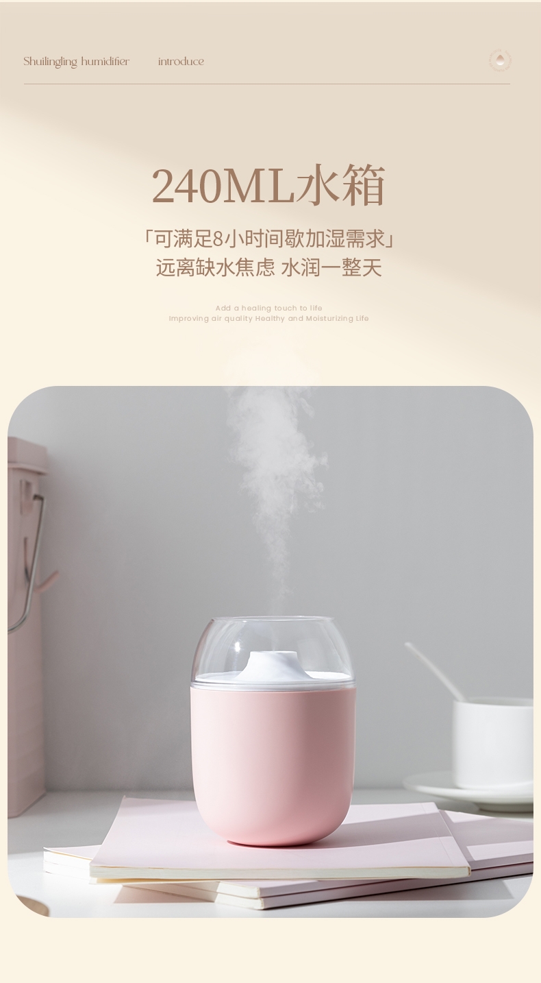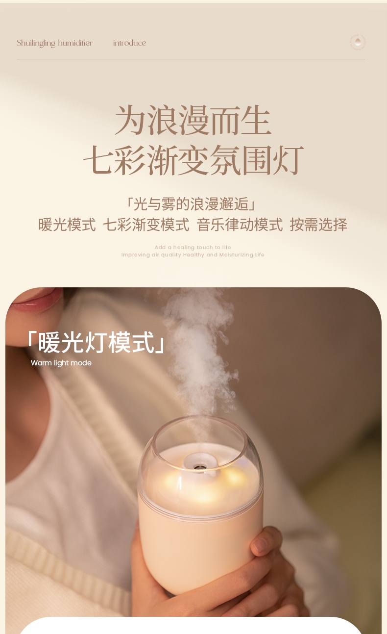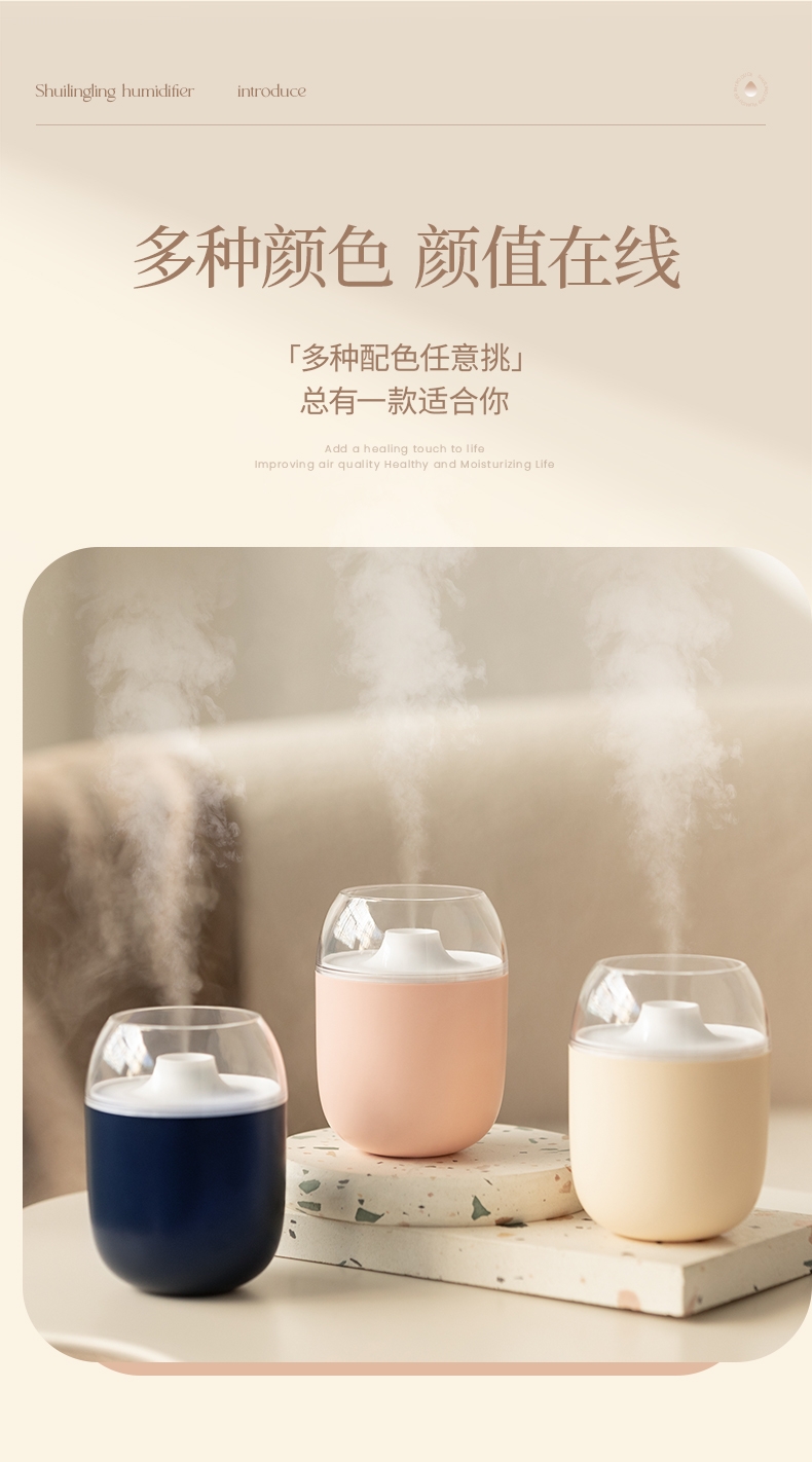 多功能加湿器,清凉保湿,静享水润,大喷雾,七彩夜灯;无噪加湿,两档:持续喷雾、间歇喷雾;防干烧,迷你便携,倾倒不漏,易操作