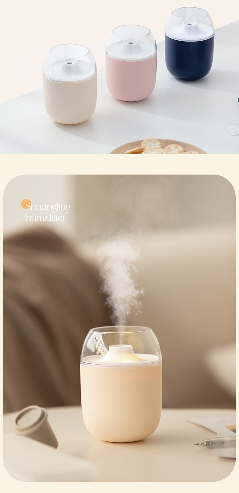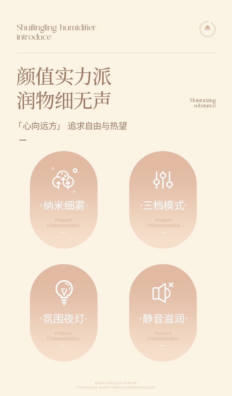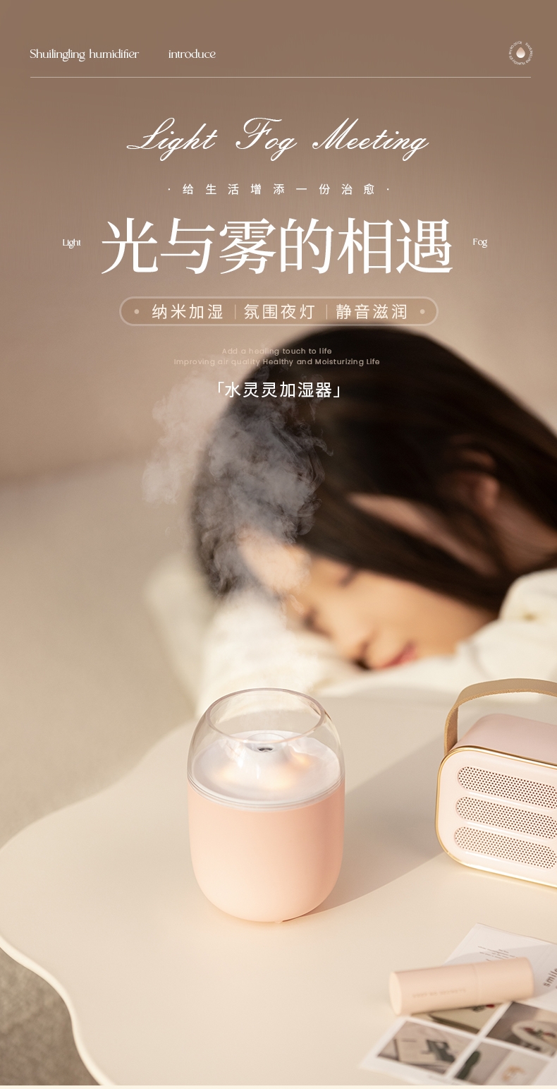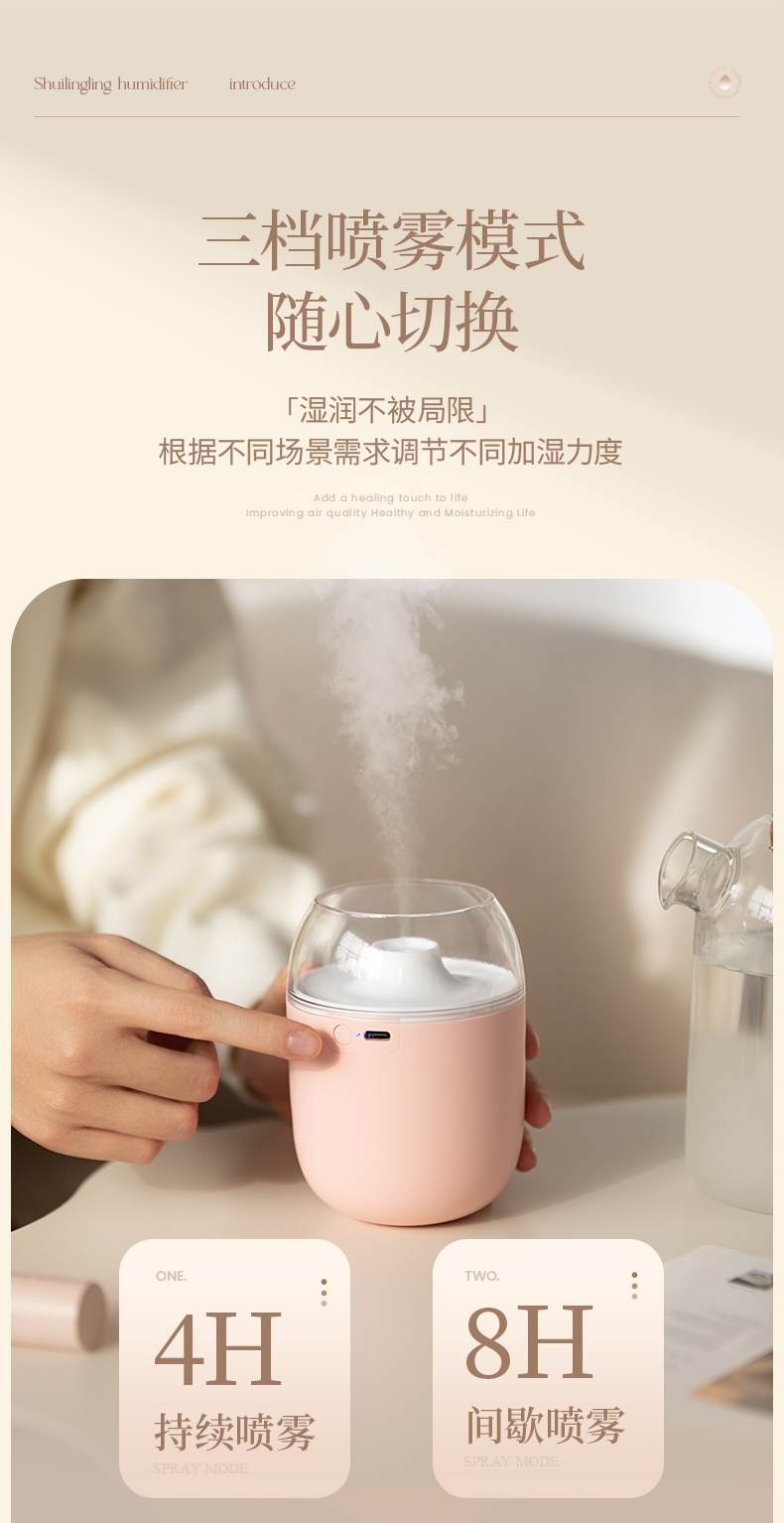 多功能加湿器,清凉保湿,静享水润,大喷雾,七彩夜灯;无噪加湿,两档:持续喷雾、间歇喷雾;防干烧,迷你便携,倾倒不漏,易操作