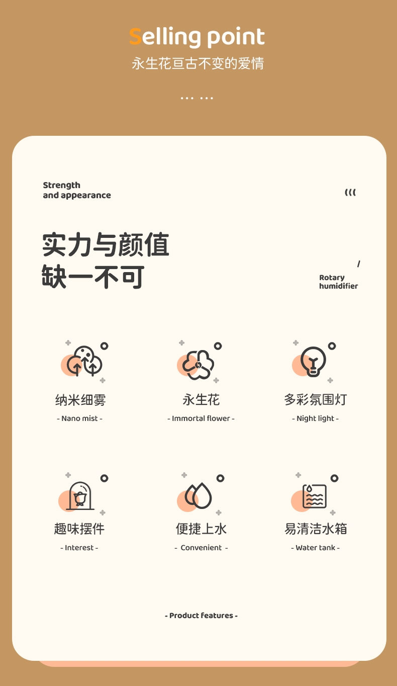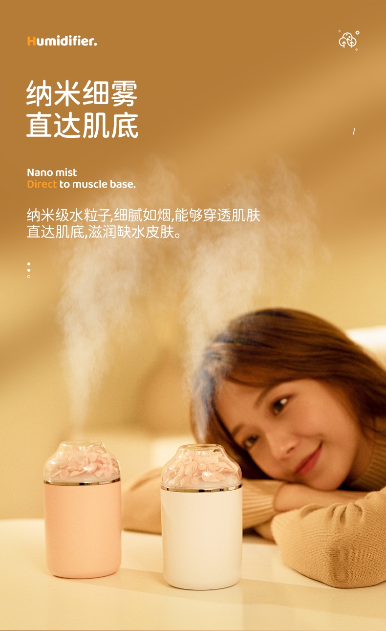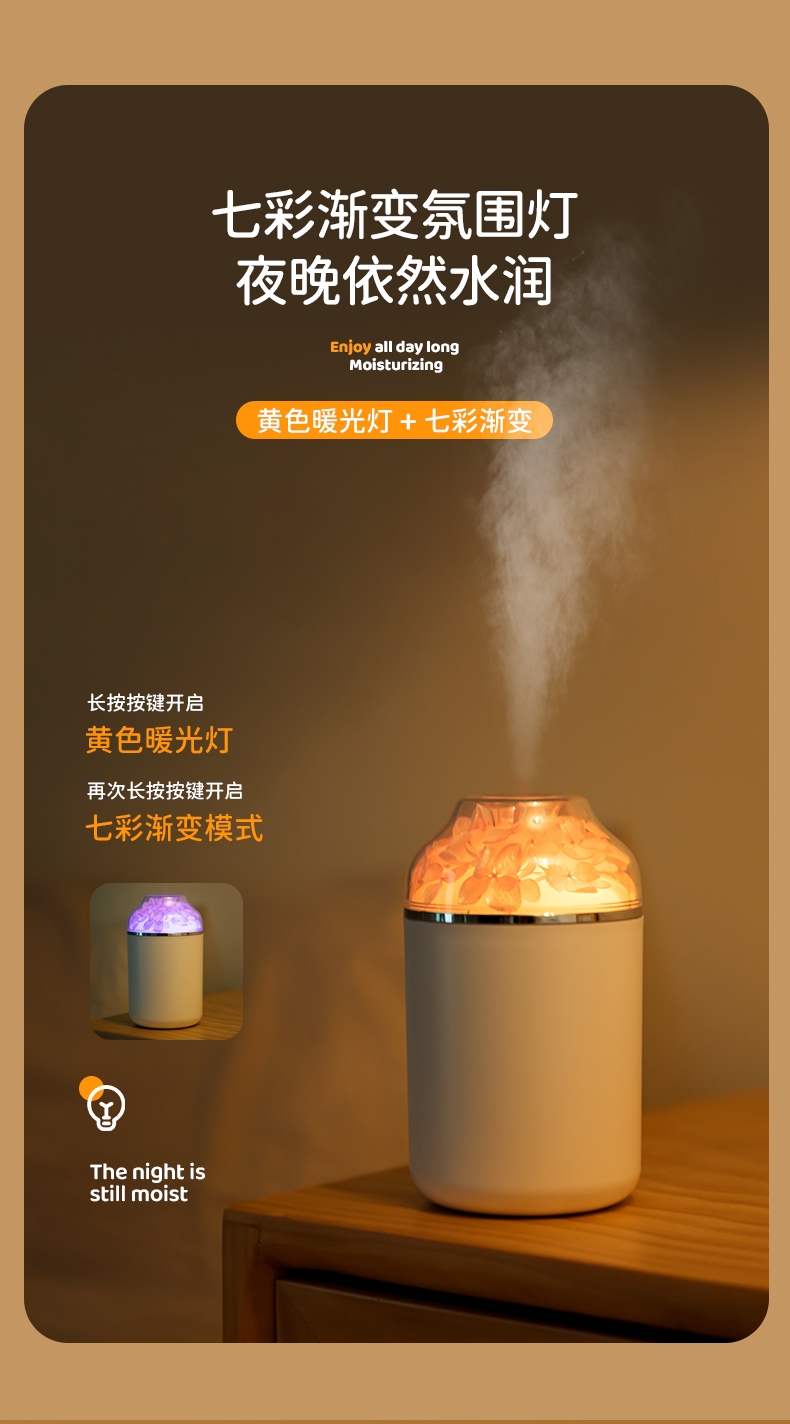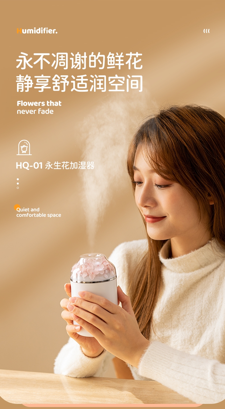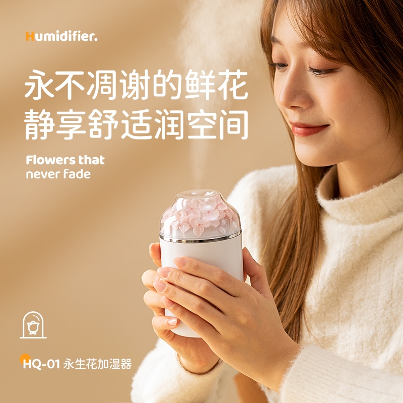 多功能加湿器,清凉保湿,静享水润,大喷雾,七彩夜灯;永生花,无噪加湿,两档:持续喷雾、间歇喷雾;防干烧,迷你便携,倾倒不漏,易操作