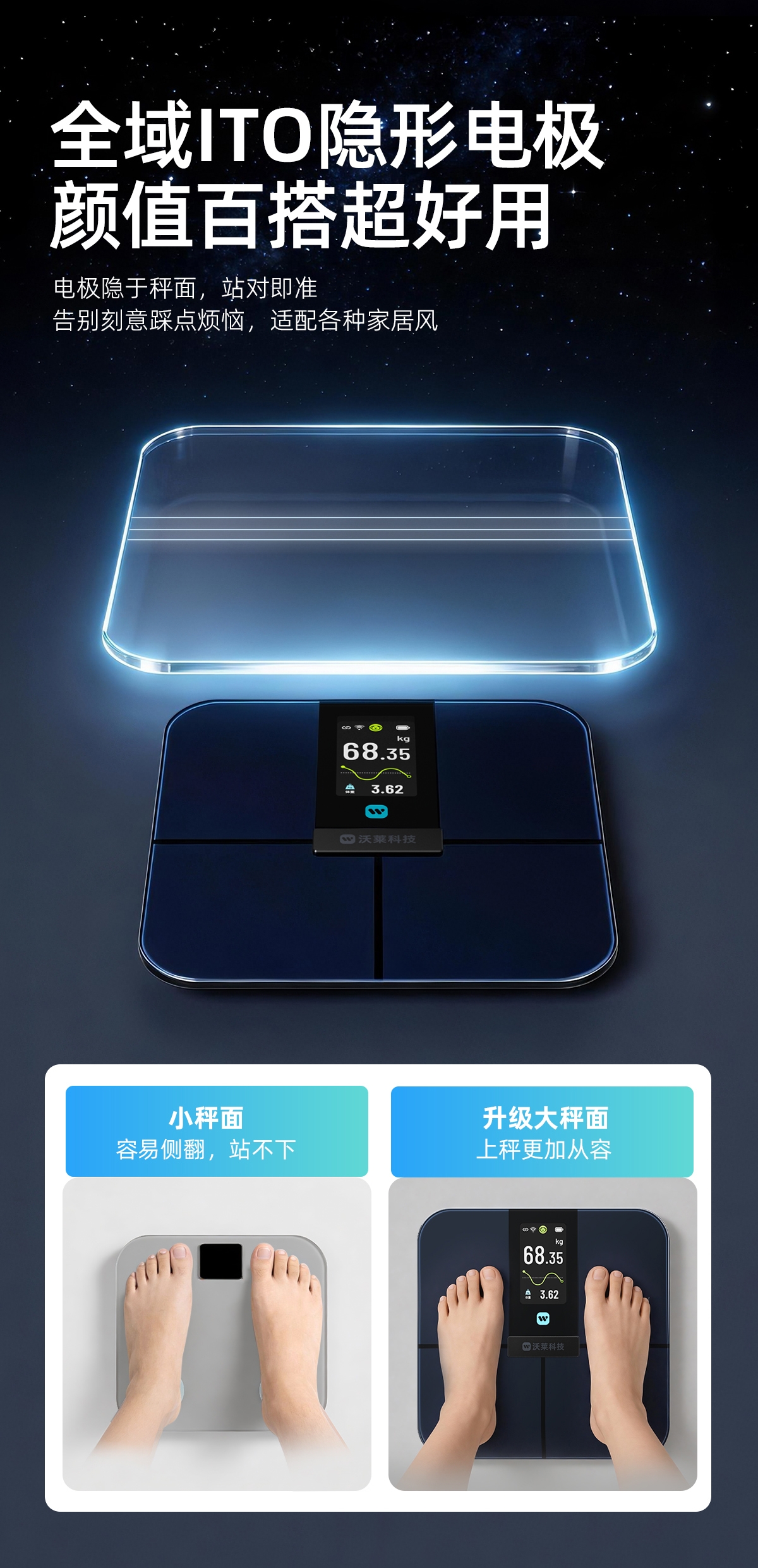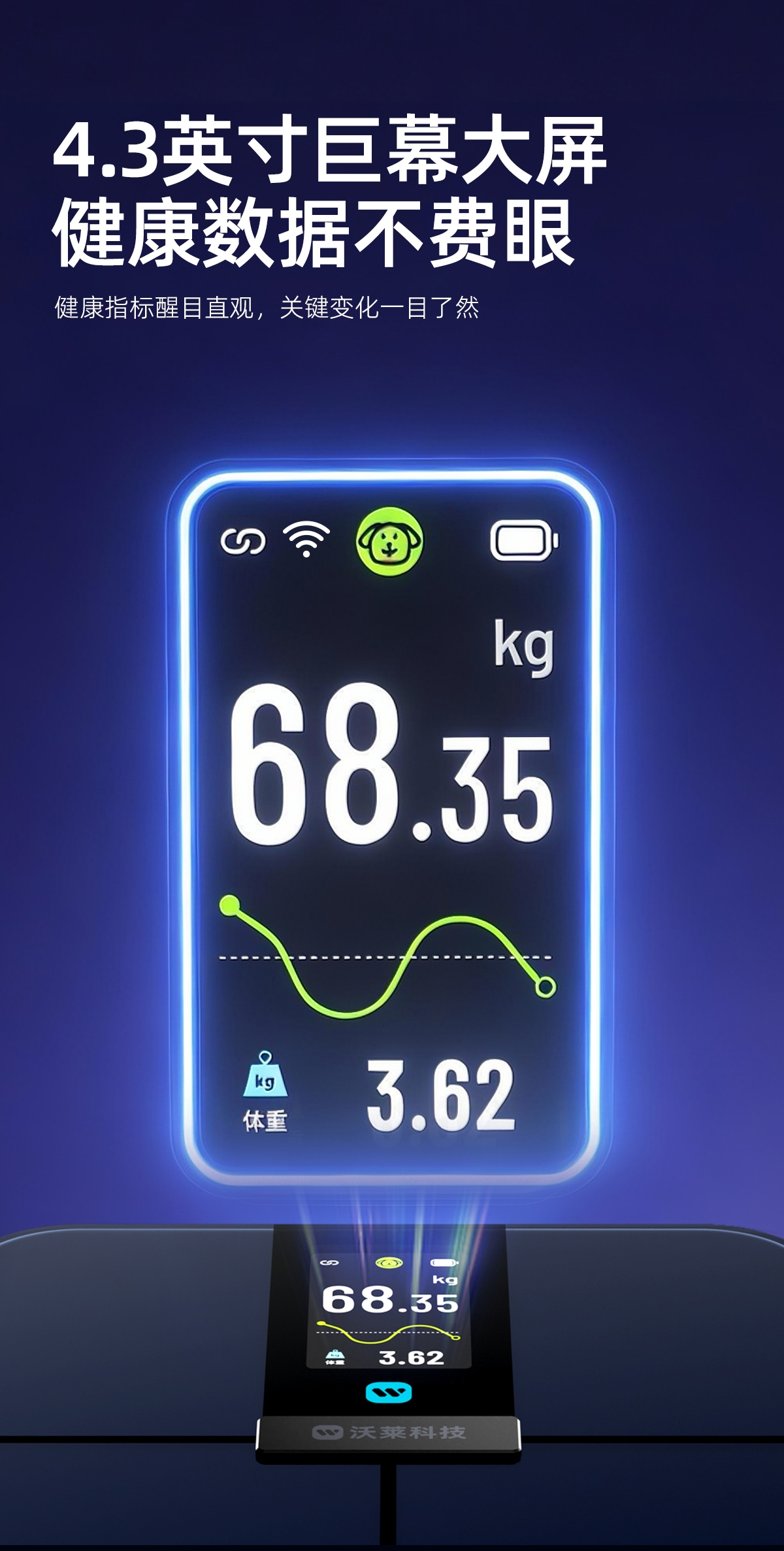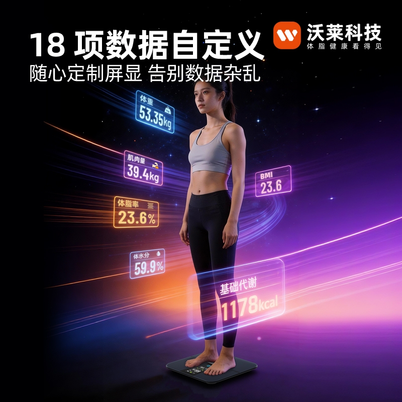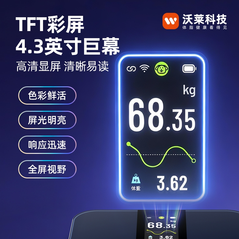 采用行业独有沃莱DEXA实验室金标准同源技术,;4.3英寸TFT巨幕彩屏,测量过程像看动画,;产品采用全域ITO隐形电极,颜值百搭超好用电极