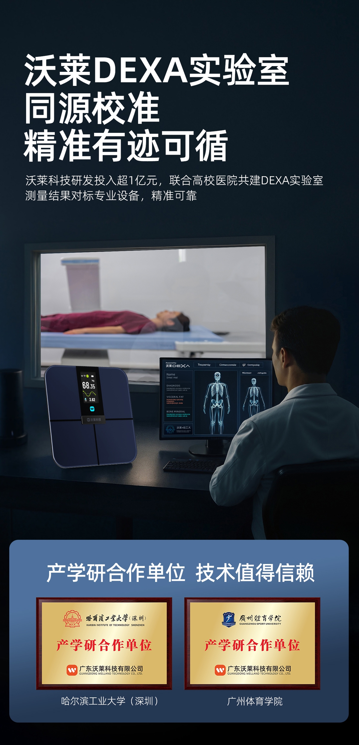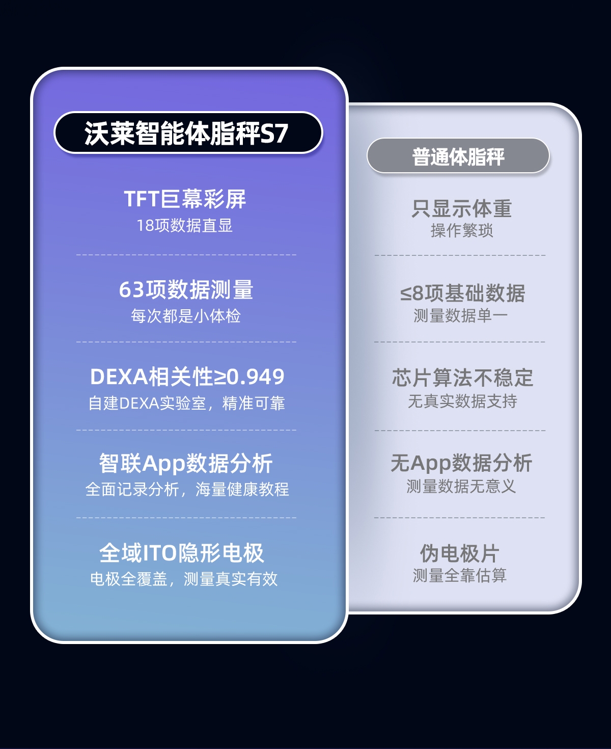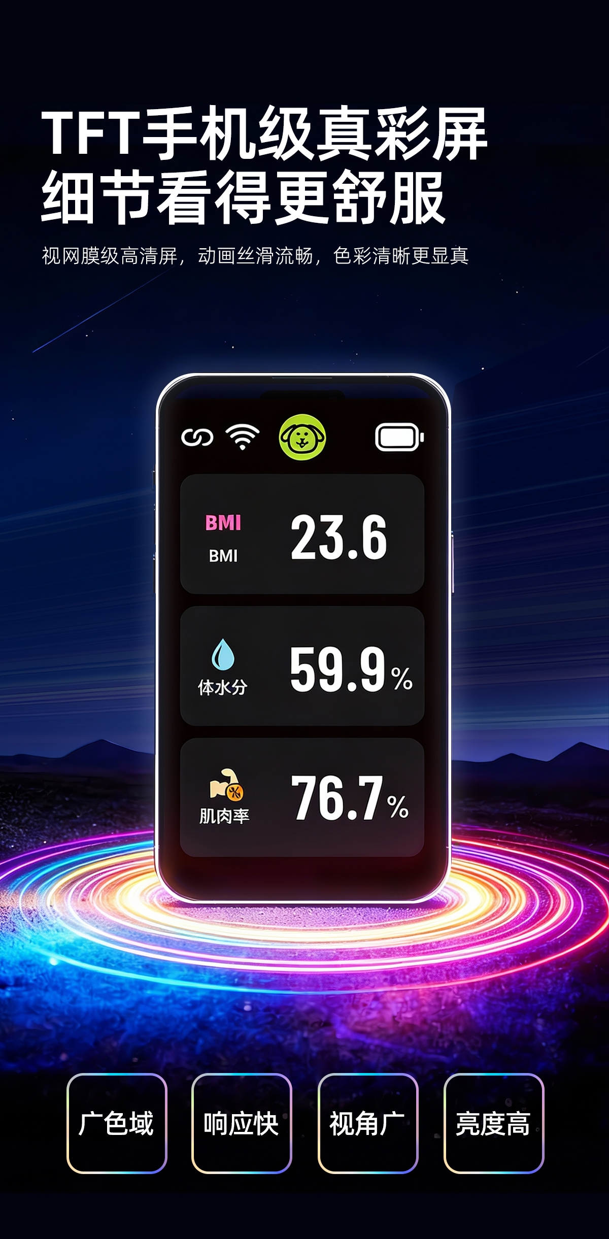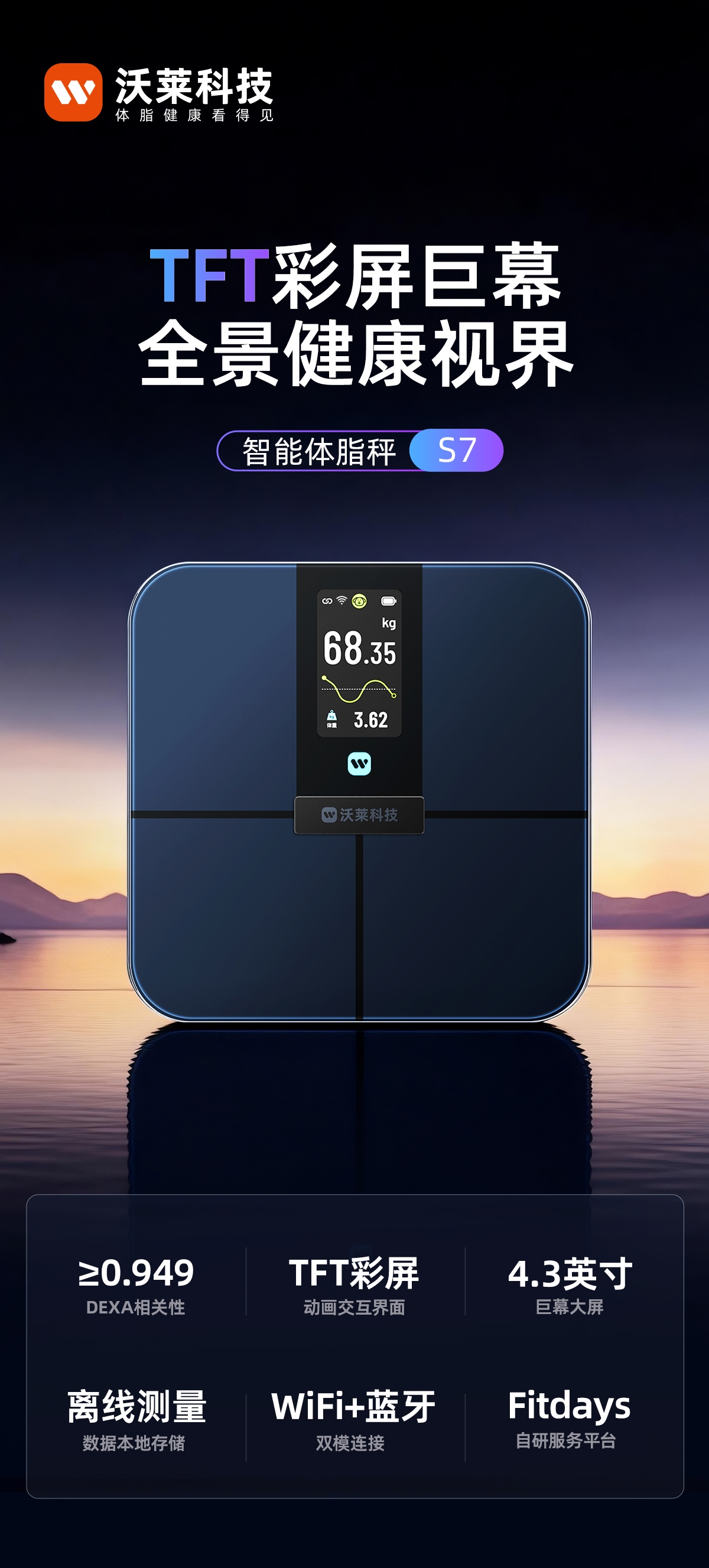 采用行业独有沃莱DEXA实验室金标准同源技术,;4.3英寸TFT巨幕彩屏,测量过程像看动画,;产品采用全域ITO隐形电极,颜值百搭超好用电极