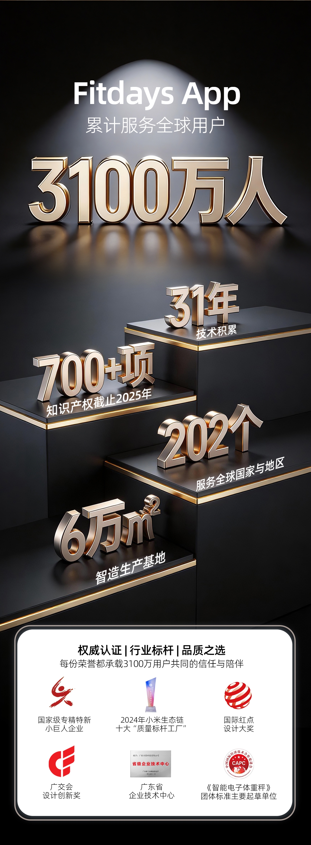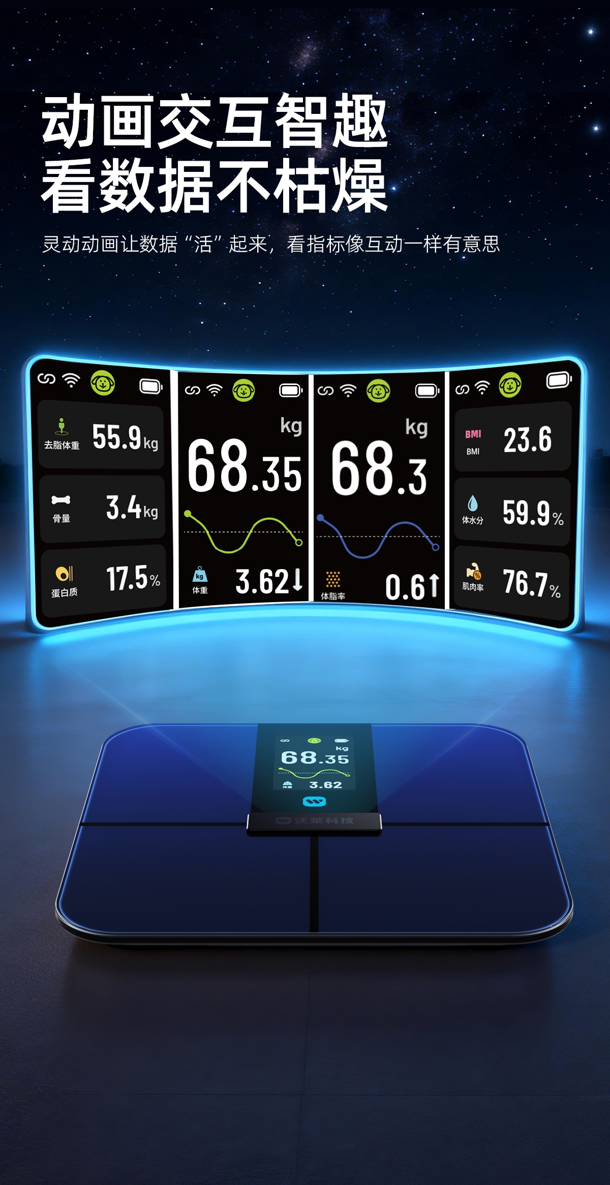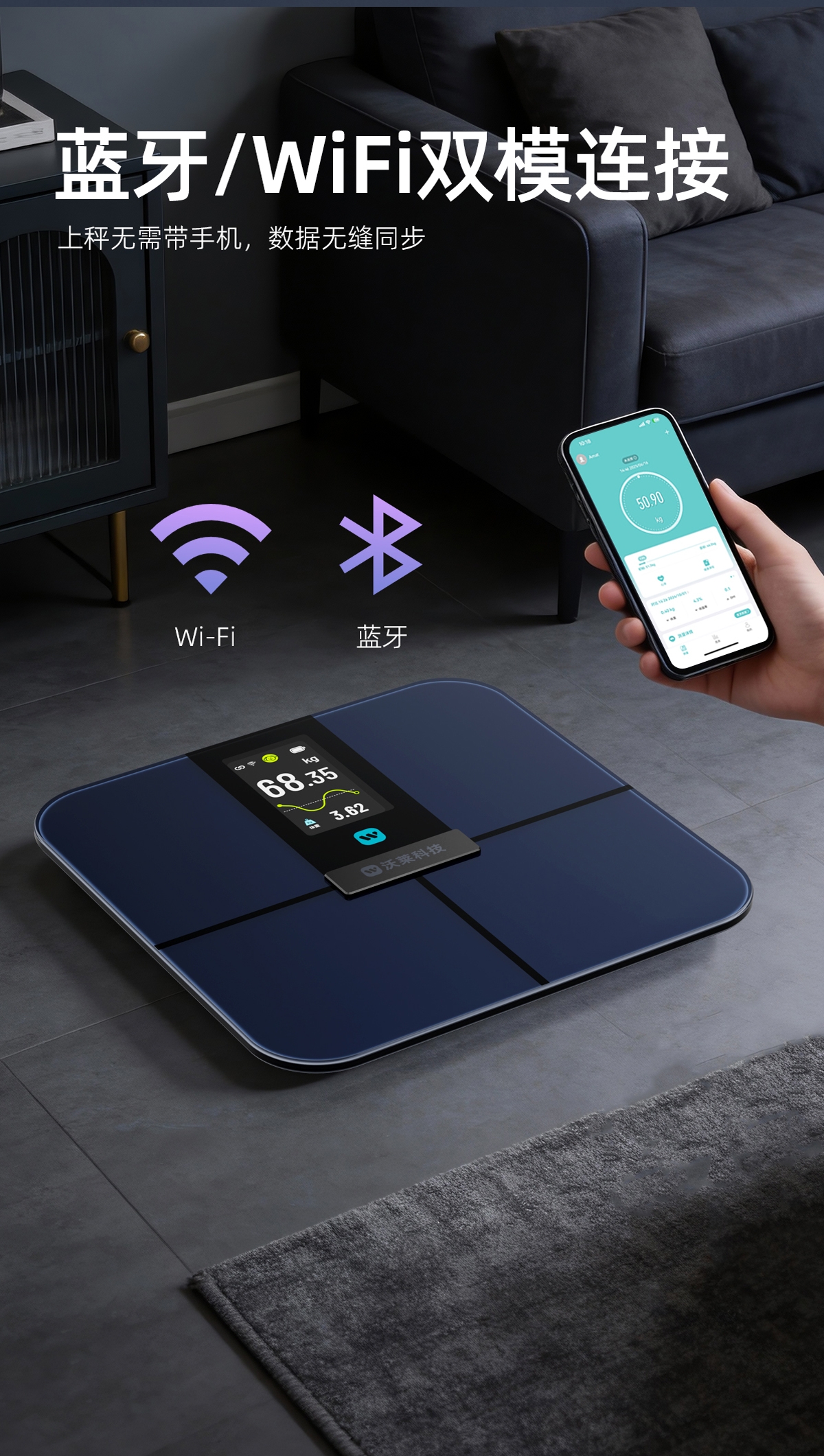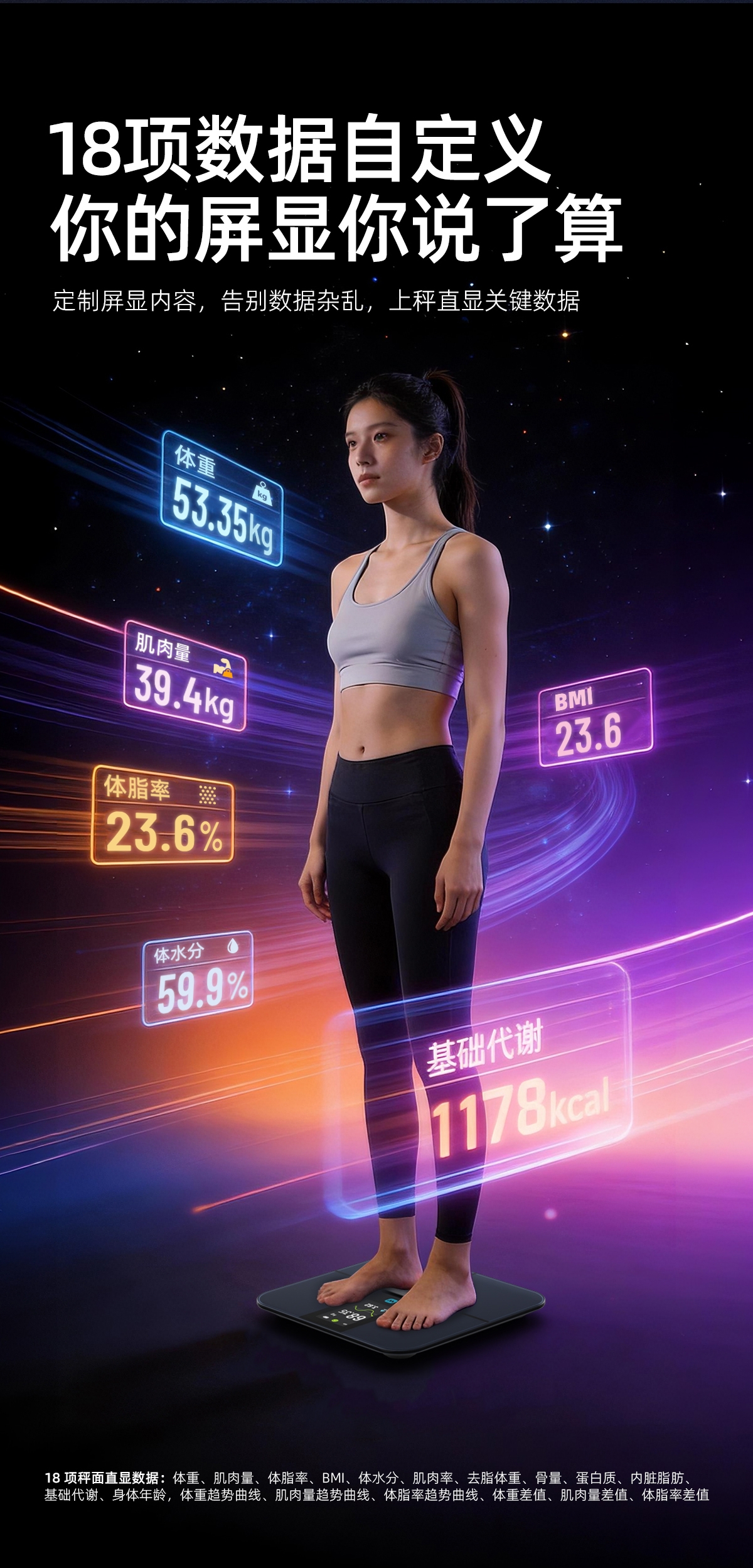配置清单:材质:高精度耐久性传感器+高强度钢化玻璃+ABS+不锈钢电极片 底部结构:全包底结构 显示:4.6寸LCD彩屏,6项数据变化动效屏显 电源:4节7号电池 通讯方案:蓝牙 测脂方案:交流 产品尺寸:348*320*30mm 产品净重:2kg 称量范围:5-180kg ; 分度值:50g 包装方式:彩盒+珍珠棉(内保护)