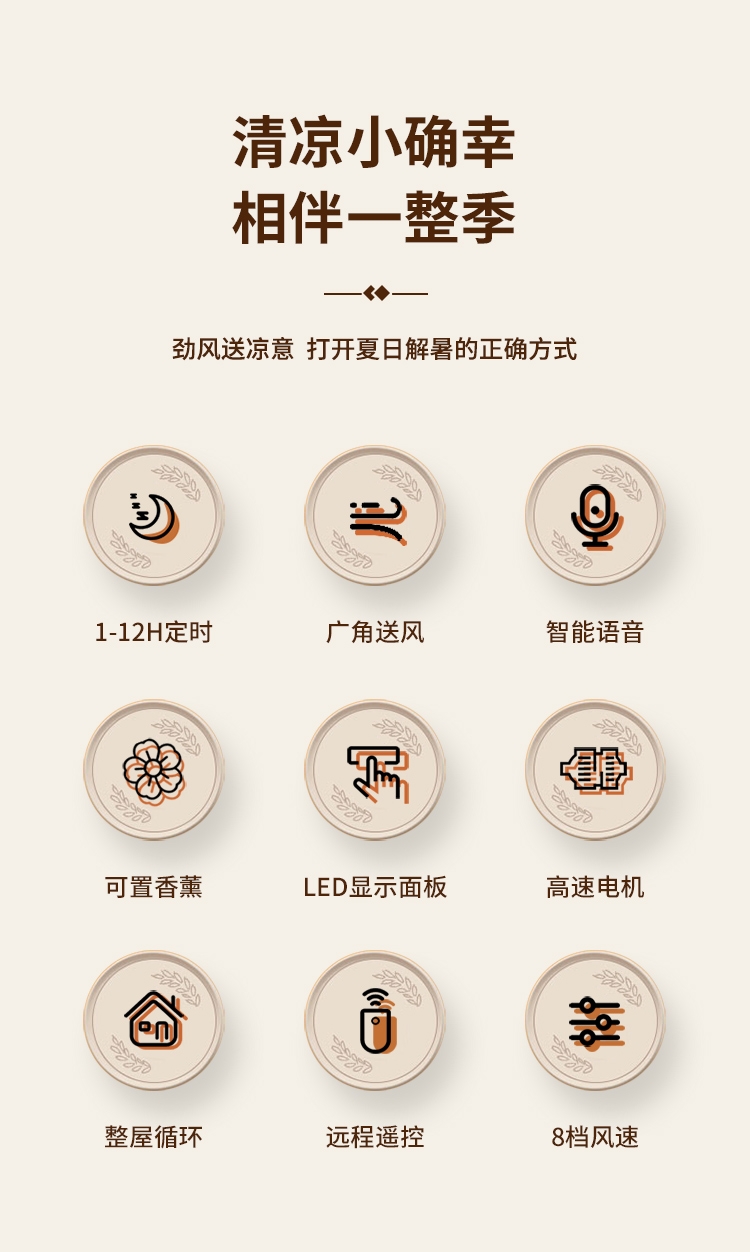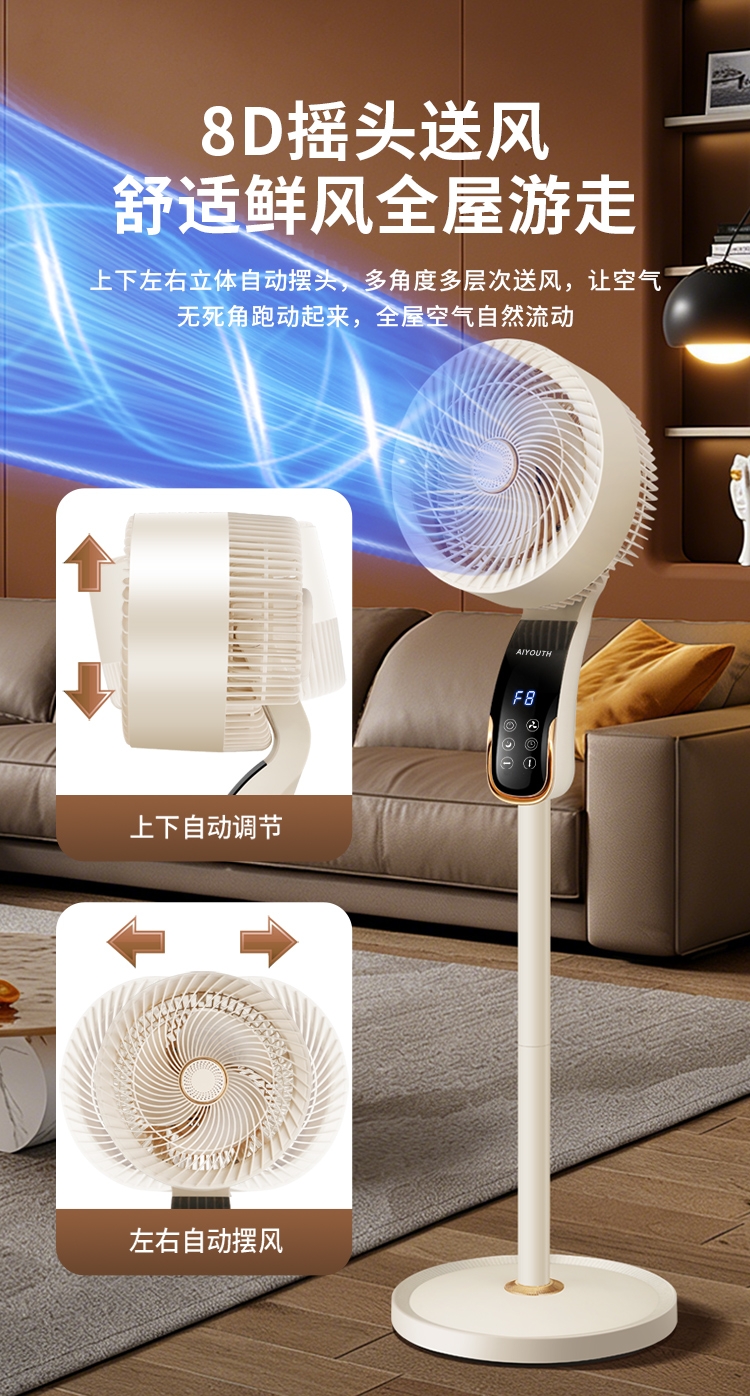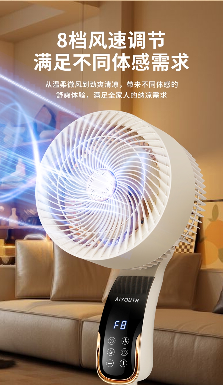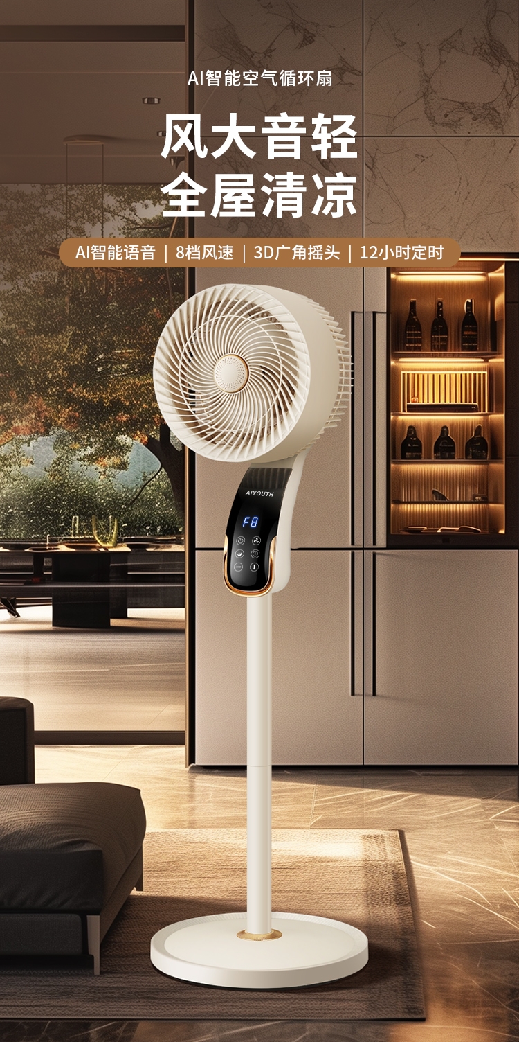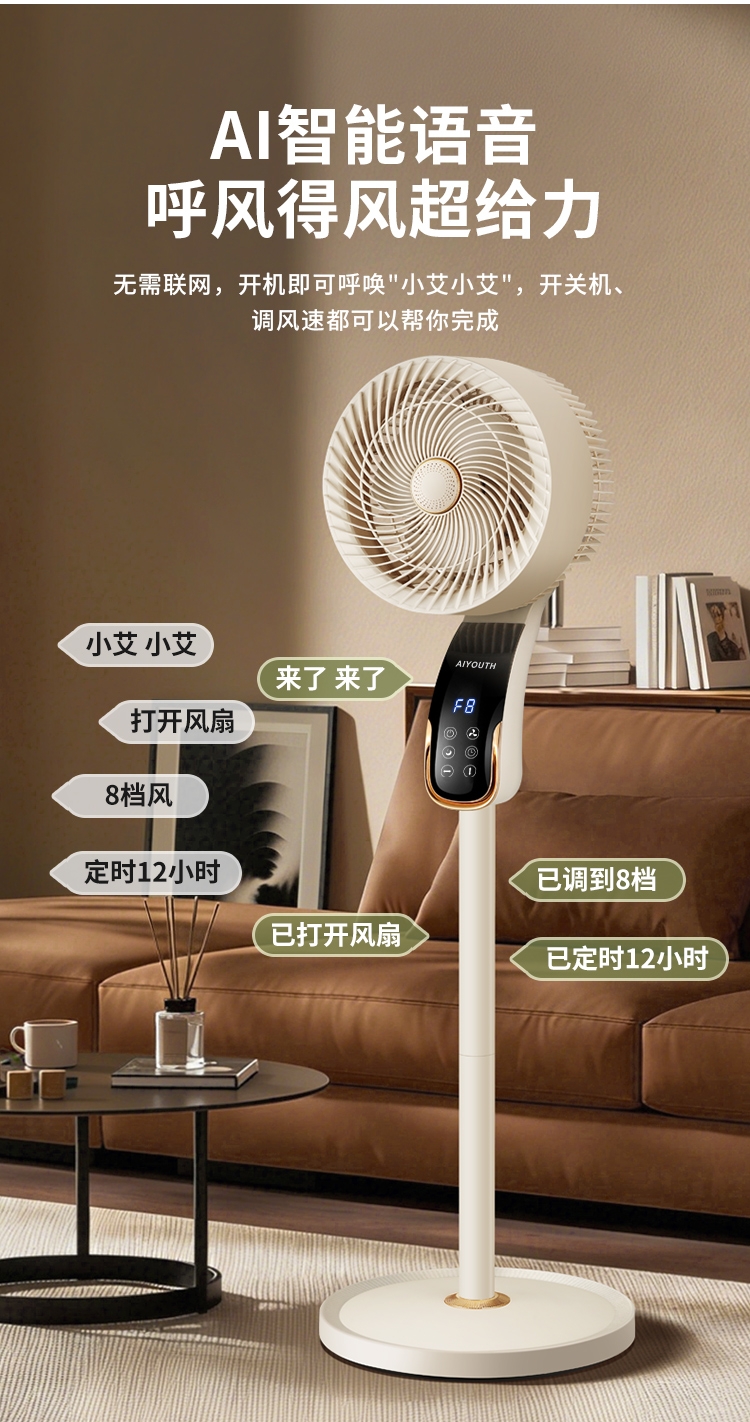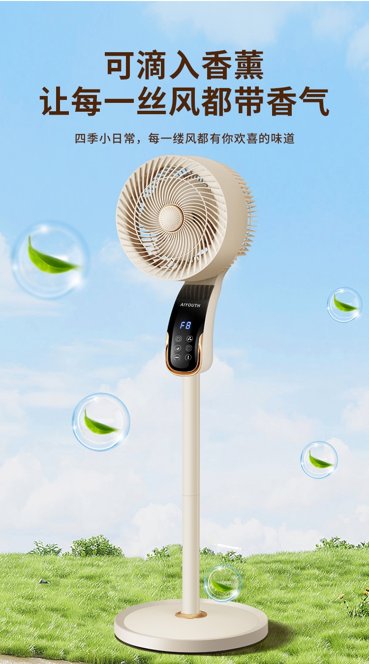 8档风速可调,柔风至强风,适配多场景需求;智能语音交互,解放双手,老人小孩轻松使用;三重操控系统:语音、遥控、LED触屏,随心选择;内置香薰功能,送风同时清新空气,升级使用体验;台地两用设计,三档高度调节,桌面/落地自由切换