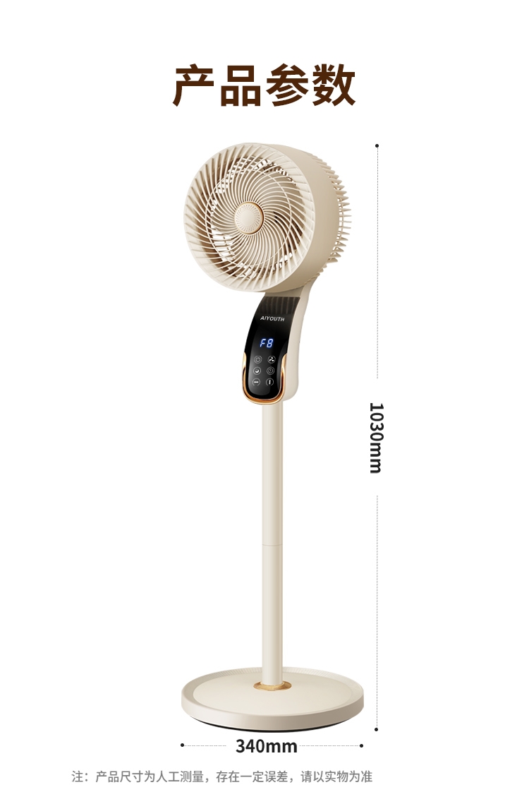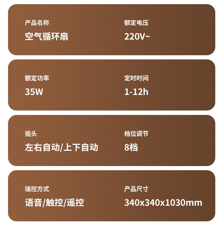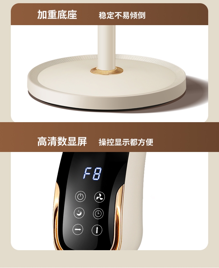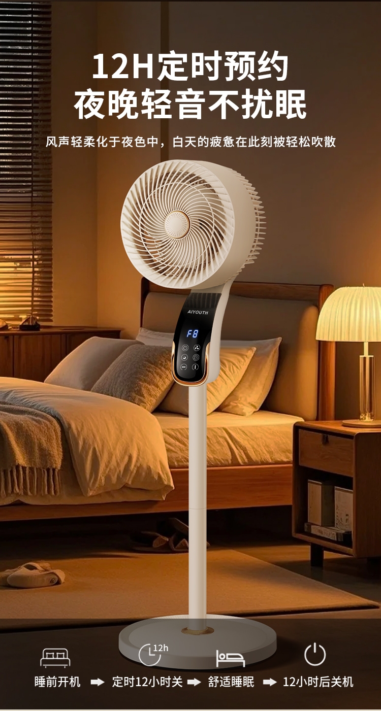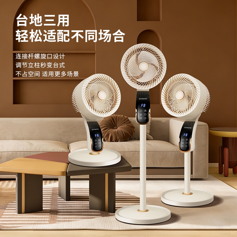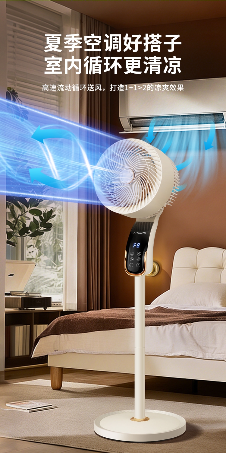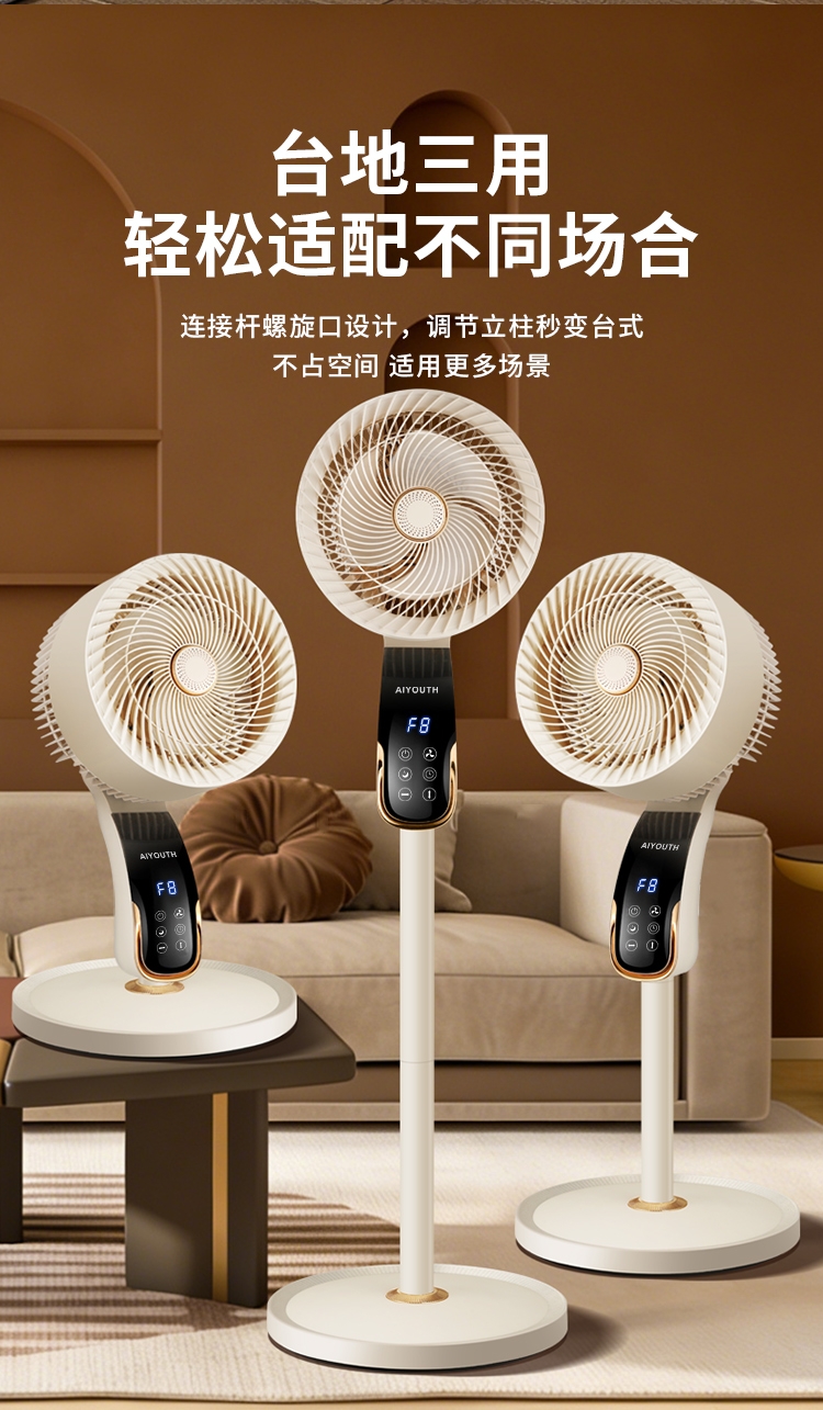 8档风速可调,柔风至强风,适配多场景需求;智能语音交互,解放双手,老人小孩轻松使用;三重操控系统:语音、遥控、LED触屏,随心选择;内置香薰功能,送风同时清新空气,升级使用体验;台地两用设计,三档高度调节,桌面/落地自由切换