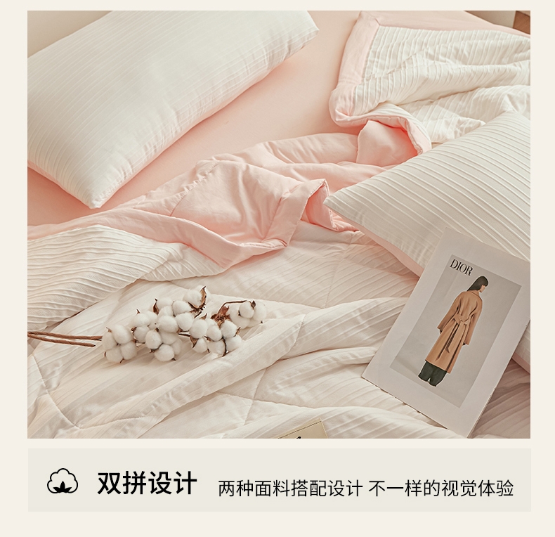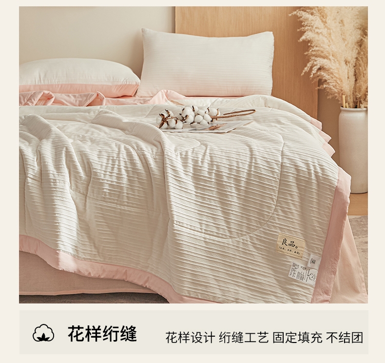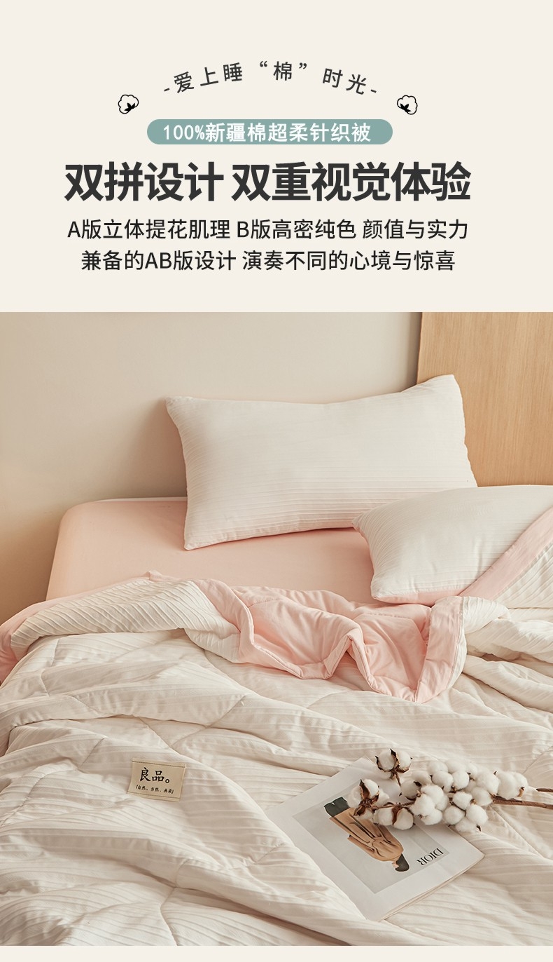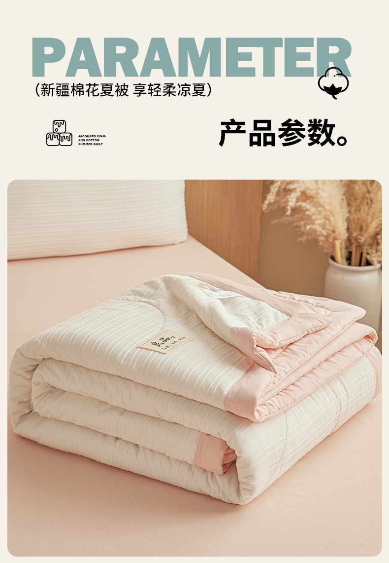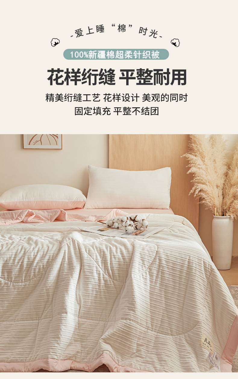 针织提花面料,立体柔弹舒适透气;填充可机洗100%新疆棉,为健康护航;温馨粉和米白AB面撞色,简约美观
