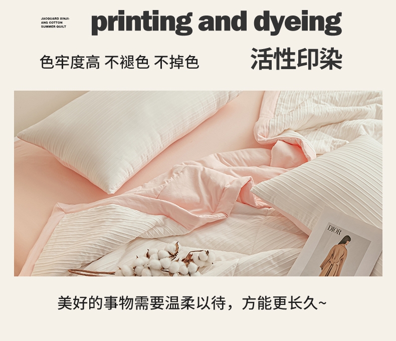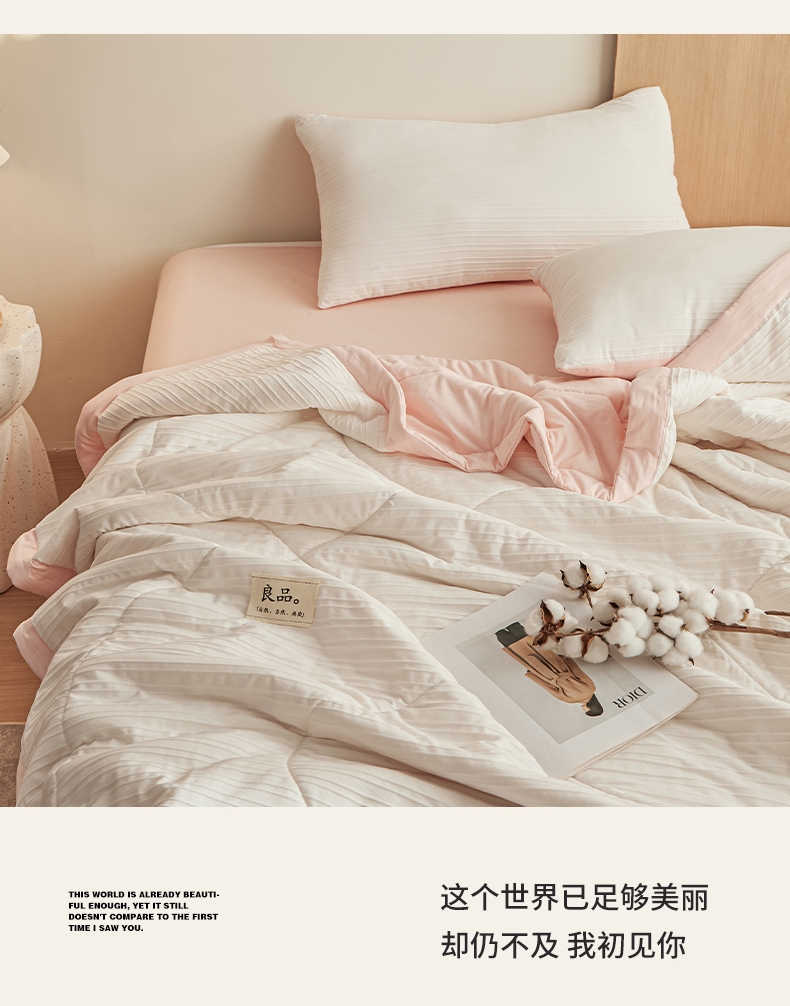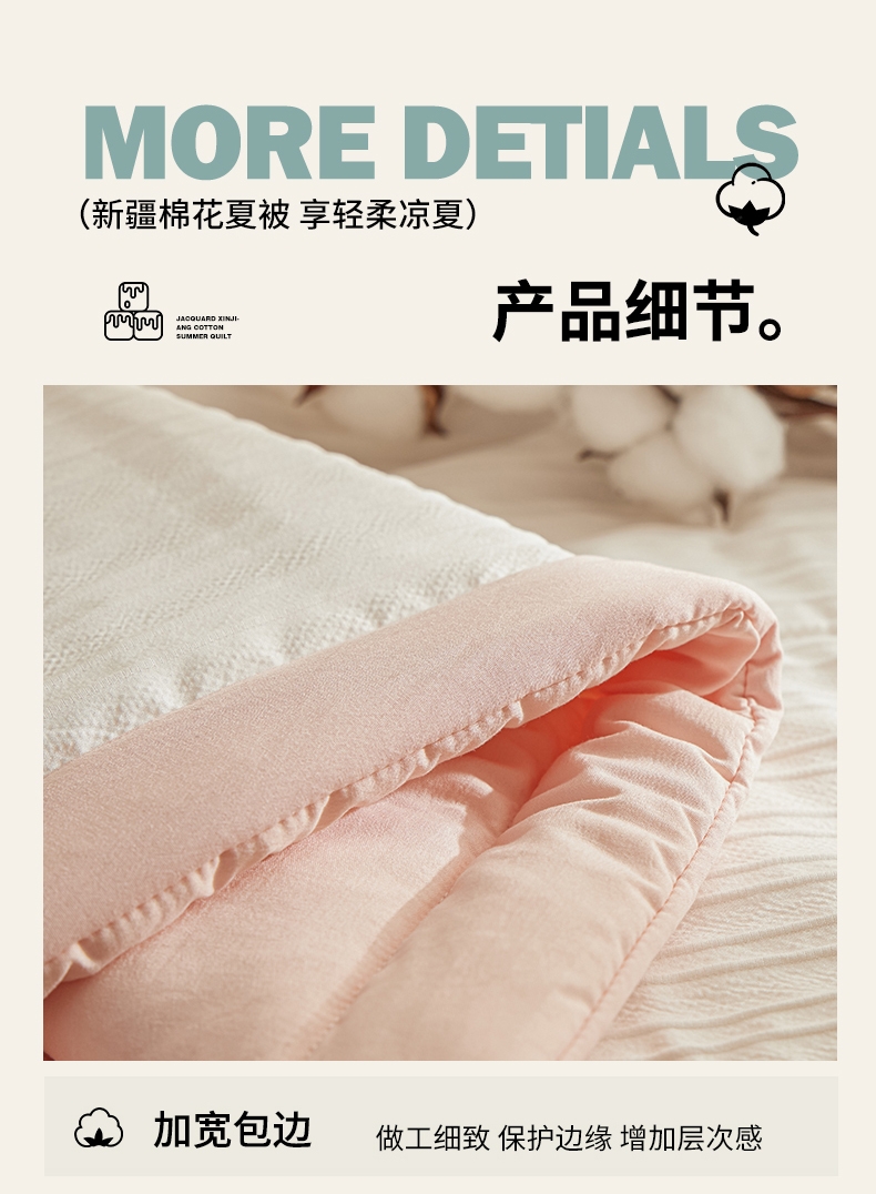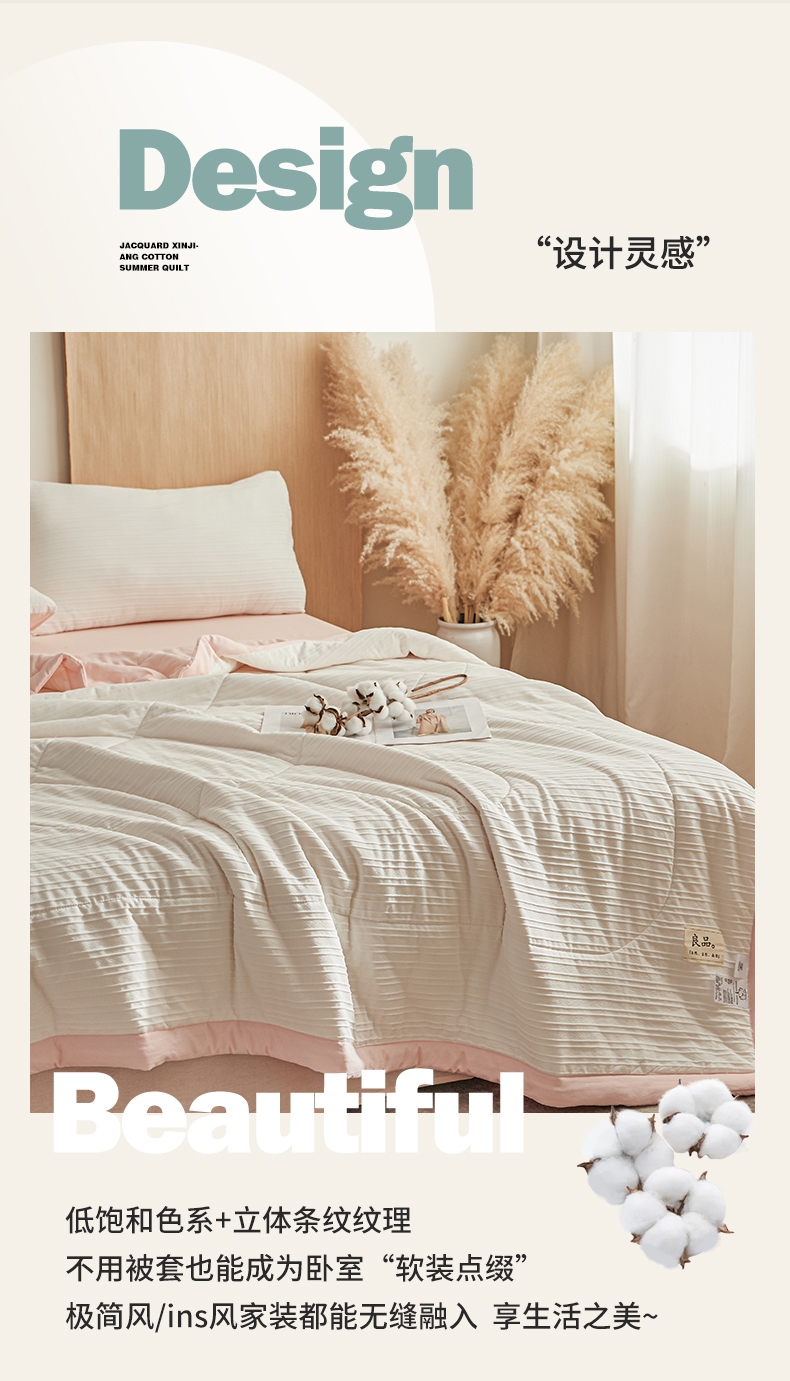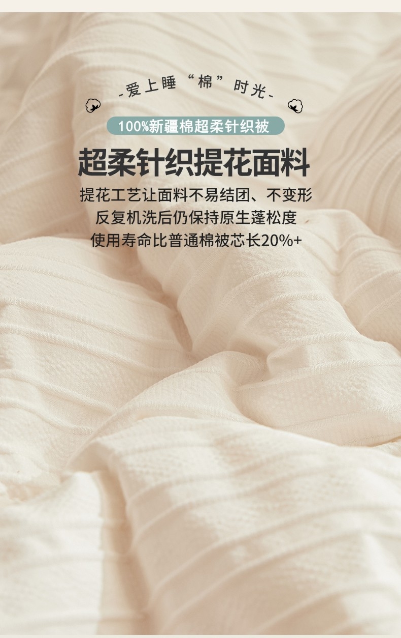 针织提花面料,立体柔弹舒适透气;填充可机洗100%新疆棉,为健康护航;温馨粉和米白AB面撞色,简约美观