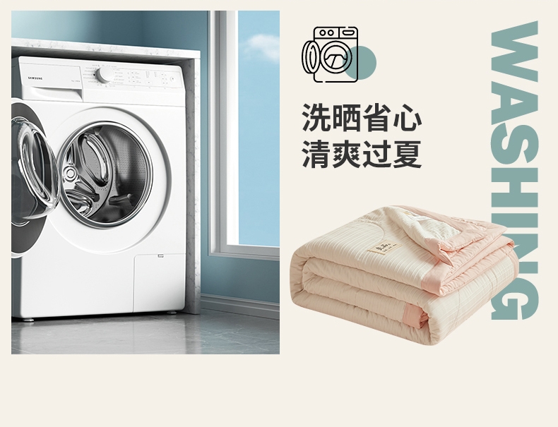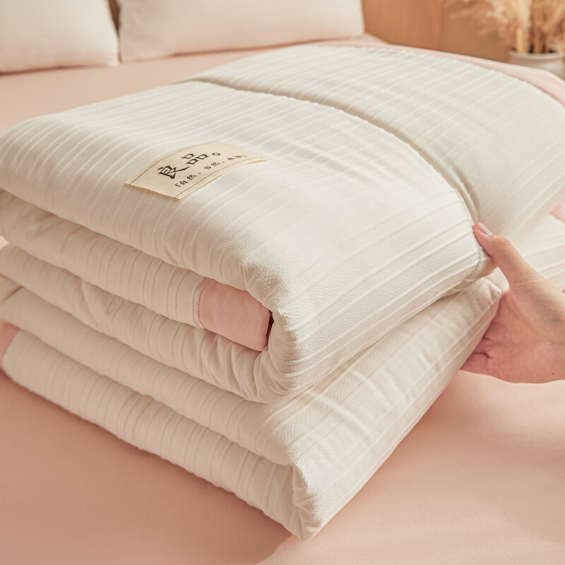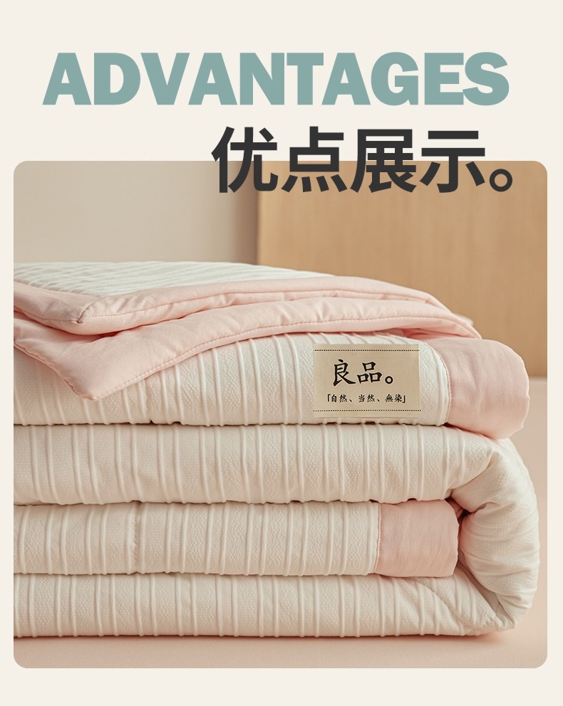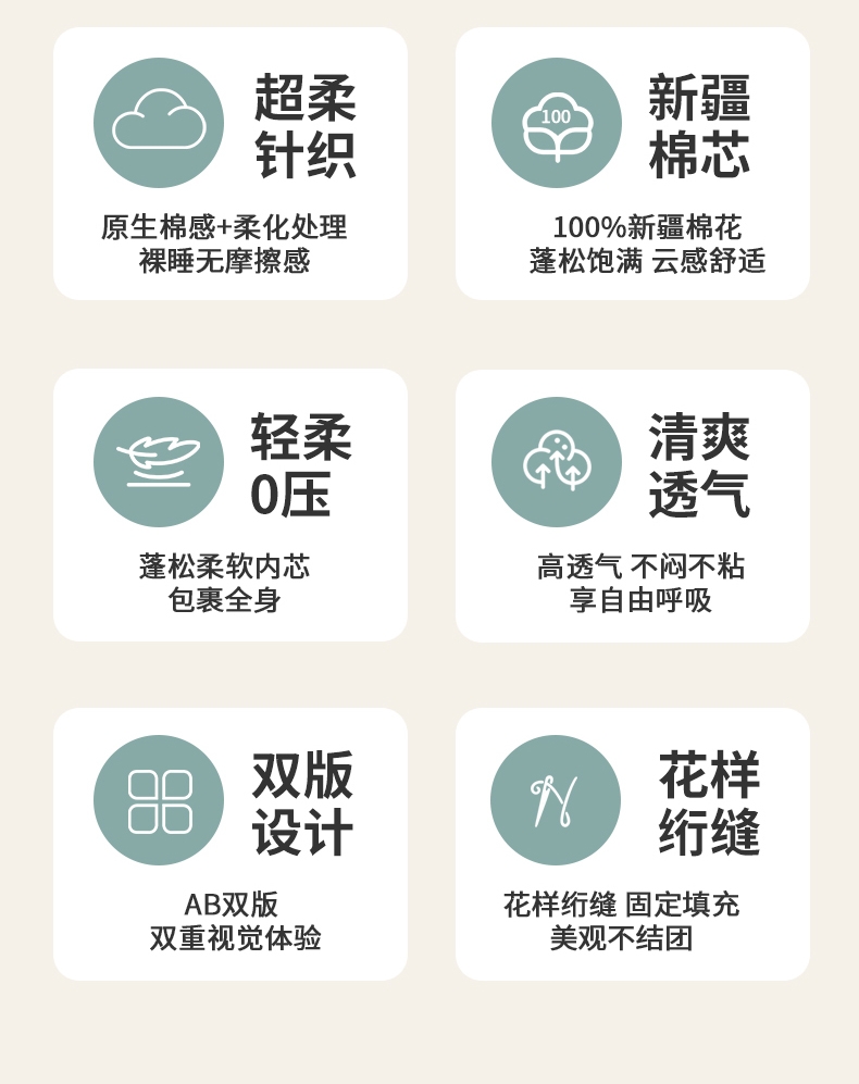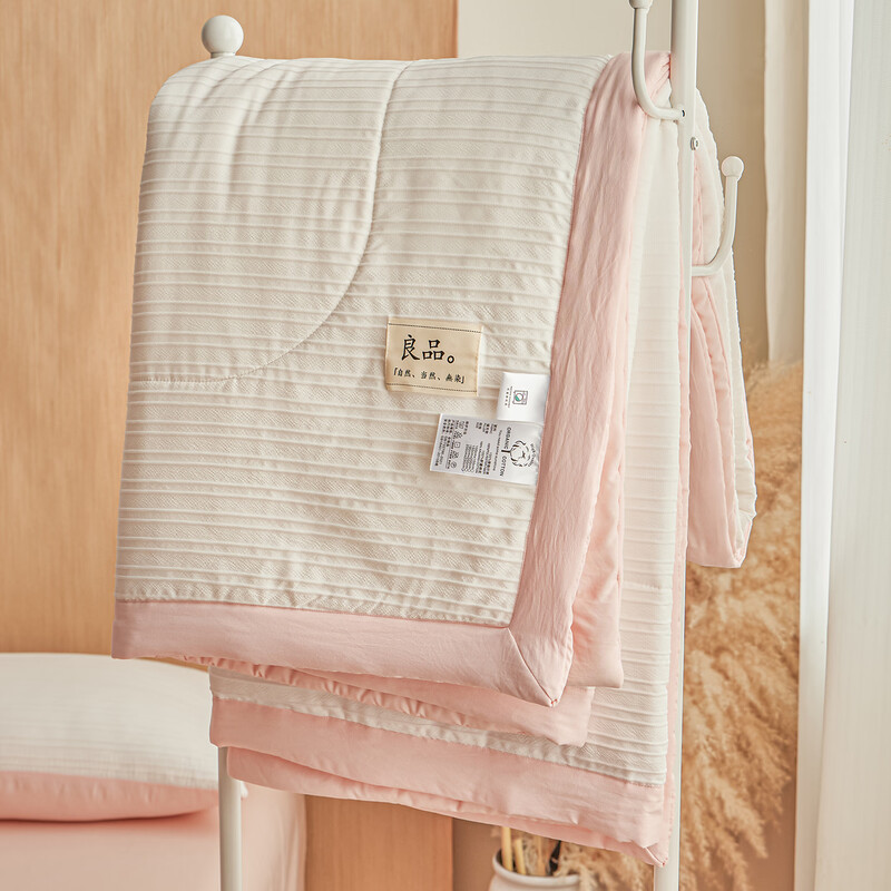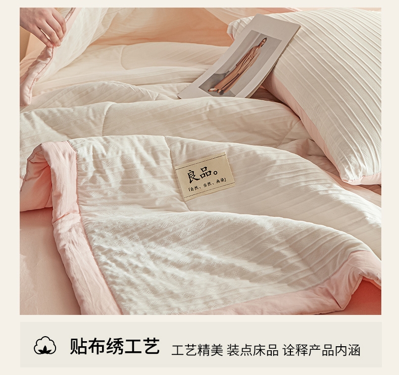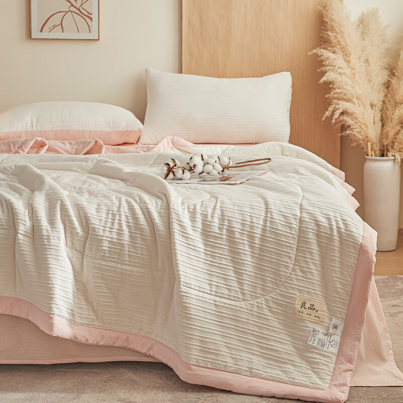针织提花面料,立体柔弹舒适透气;填充可机洗100%新疆棉,为健康护航;温馨粉和米白AB面撞色,简约美观