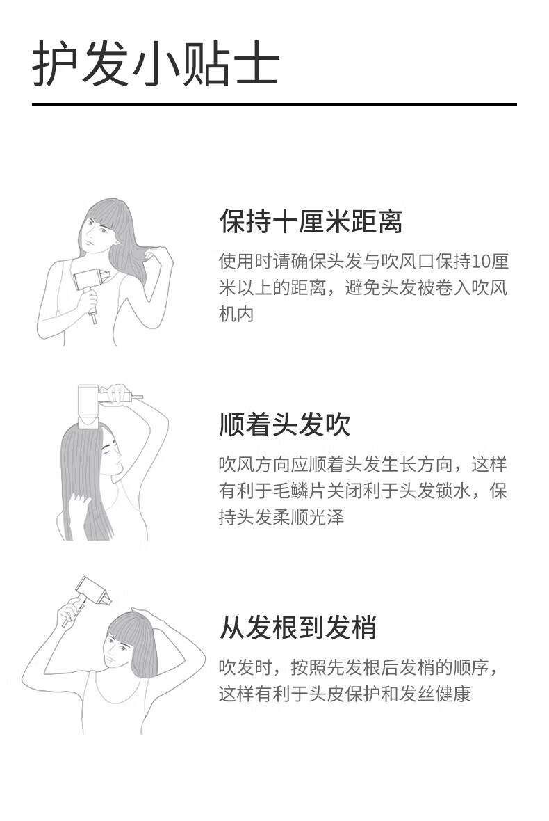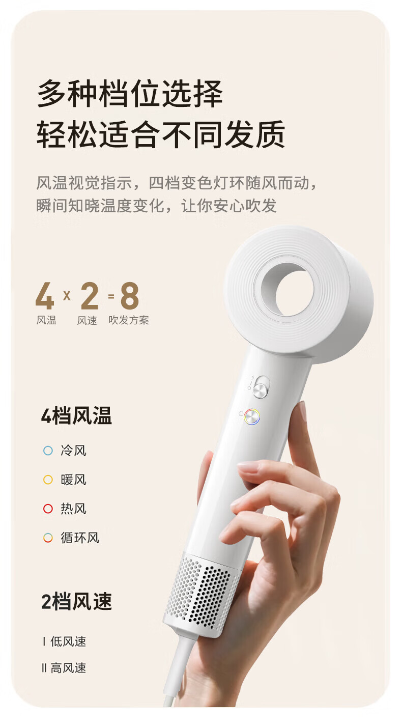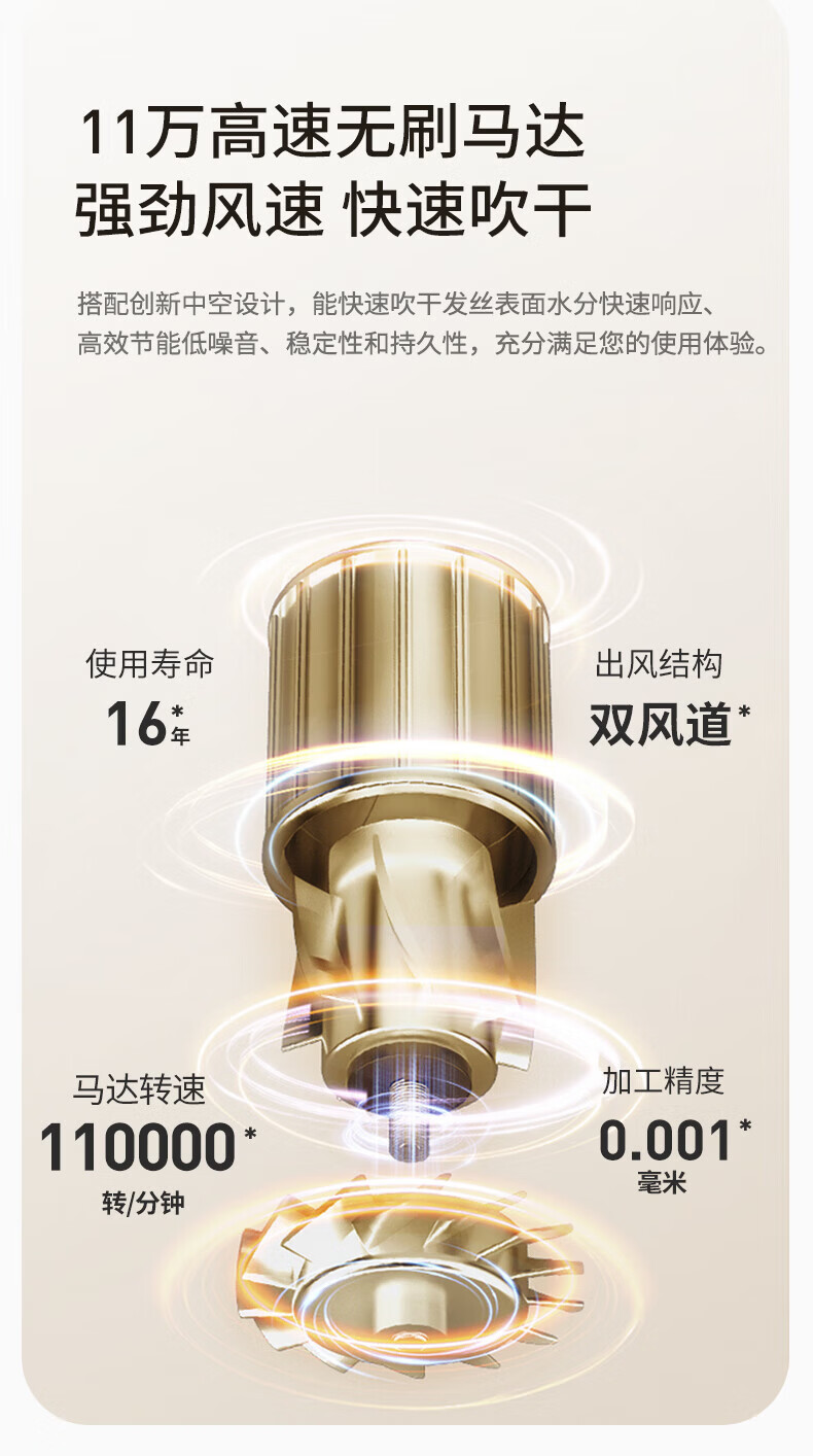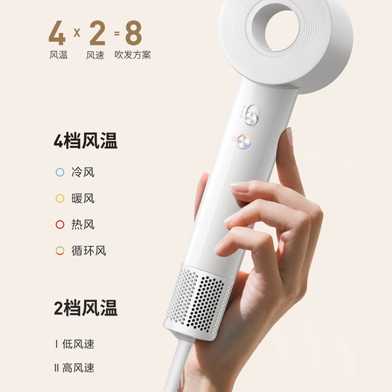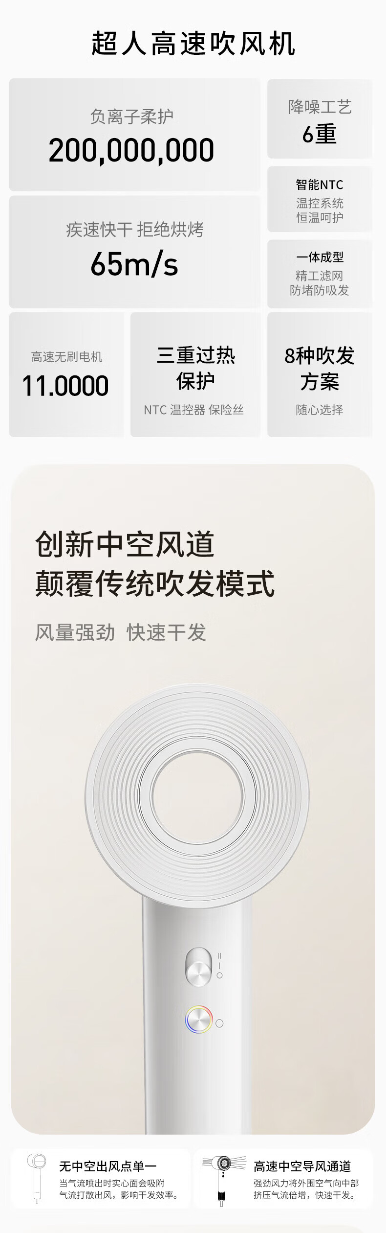 11万转高速无刷马达,2亿级负离子护发;三重过热保护、中空式风筒设计,磁吸式下沉拆卸网罩;两档风速调节,冷、温、热、冷热循环四档风温模式