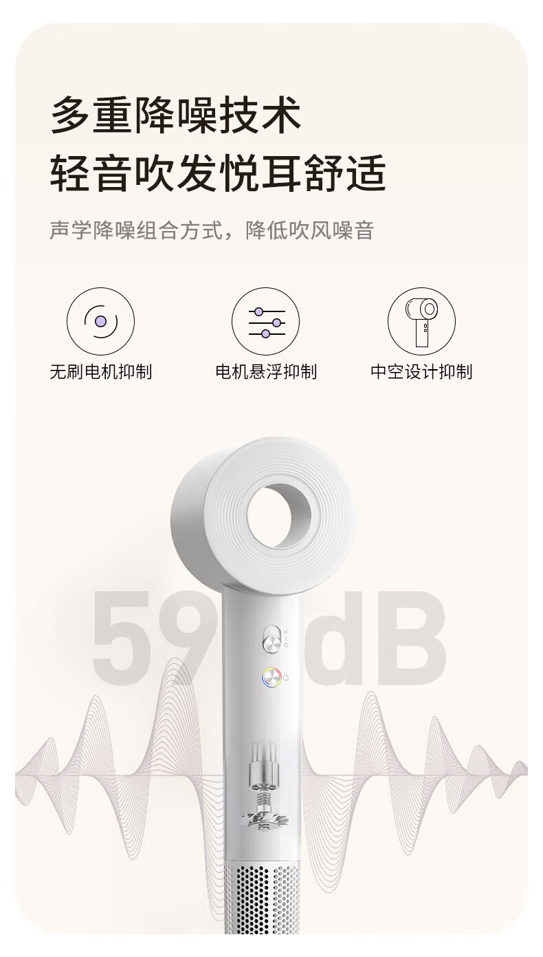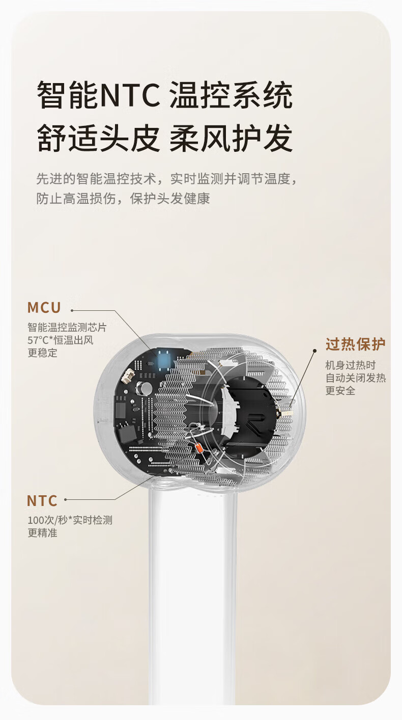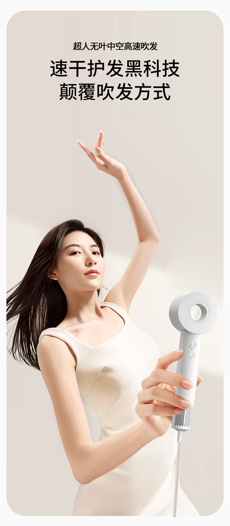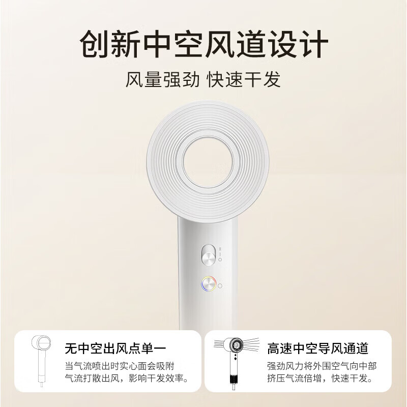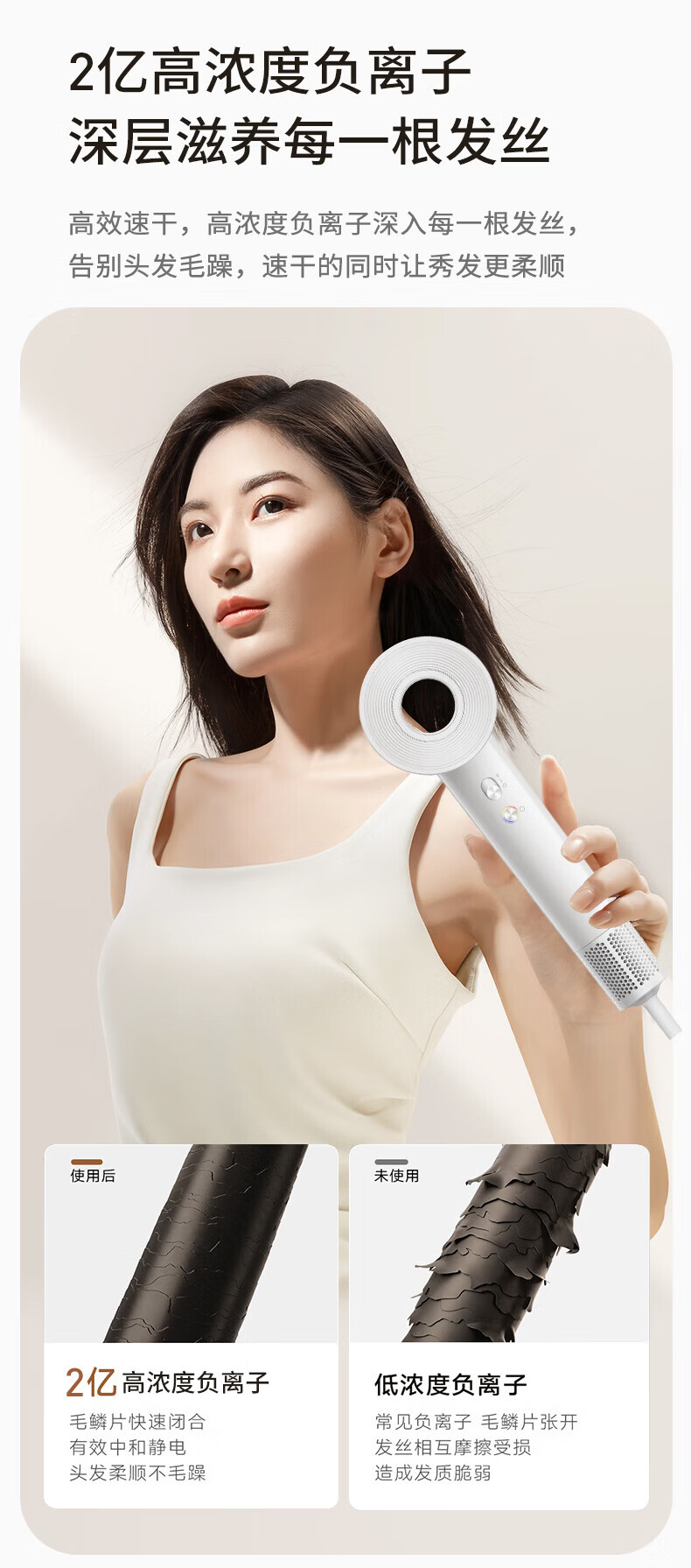11万转高速无刷马达,2亿级负离子护发;三重过热保护、中空式风筒设计,磁吸式下沉拆卸网罩;两档风速调节,冷、温、热、冷热循环四档风温模式