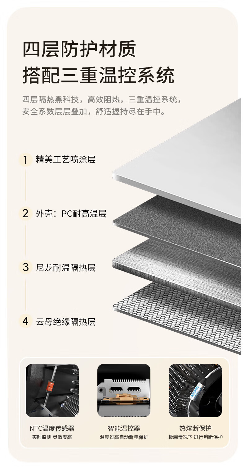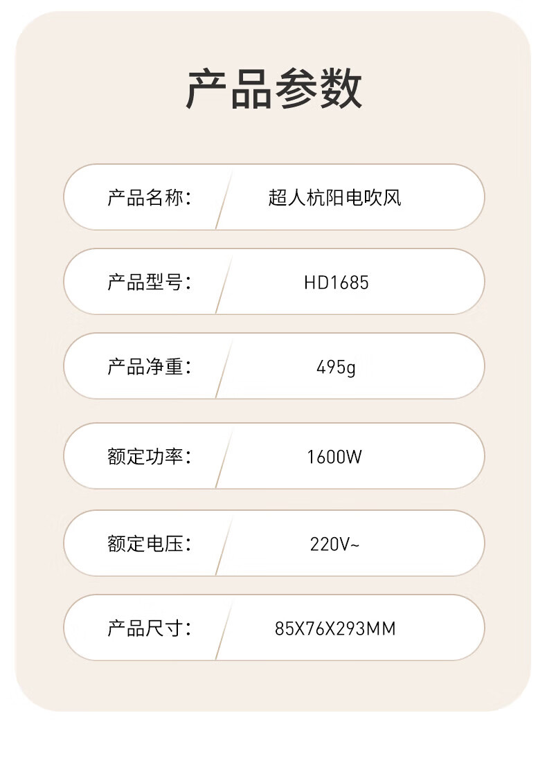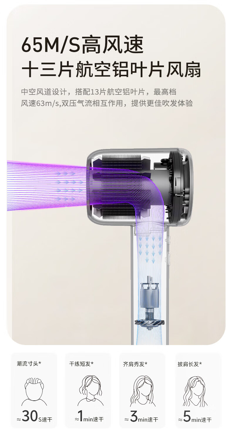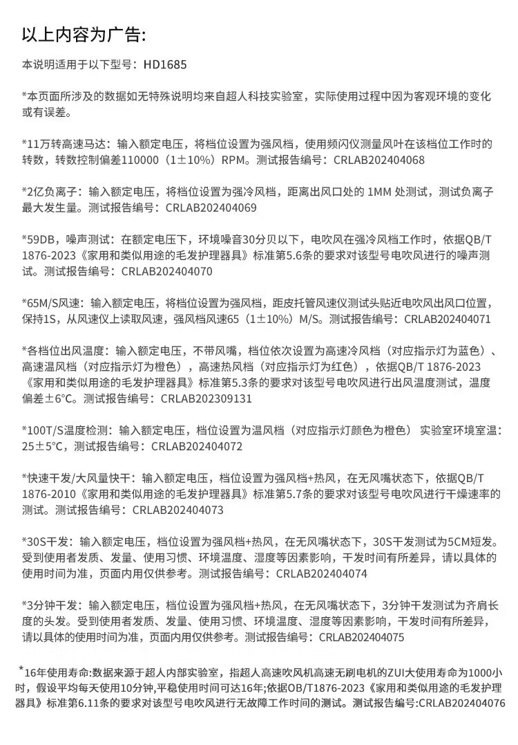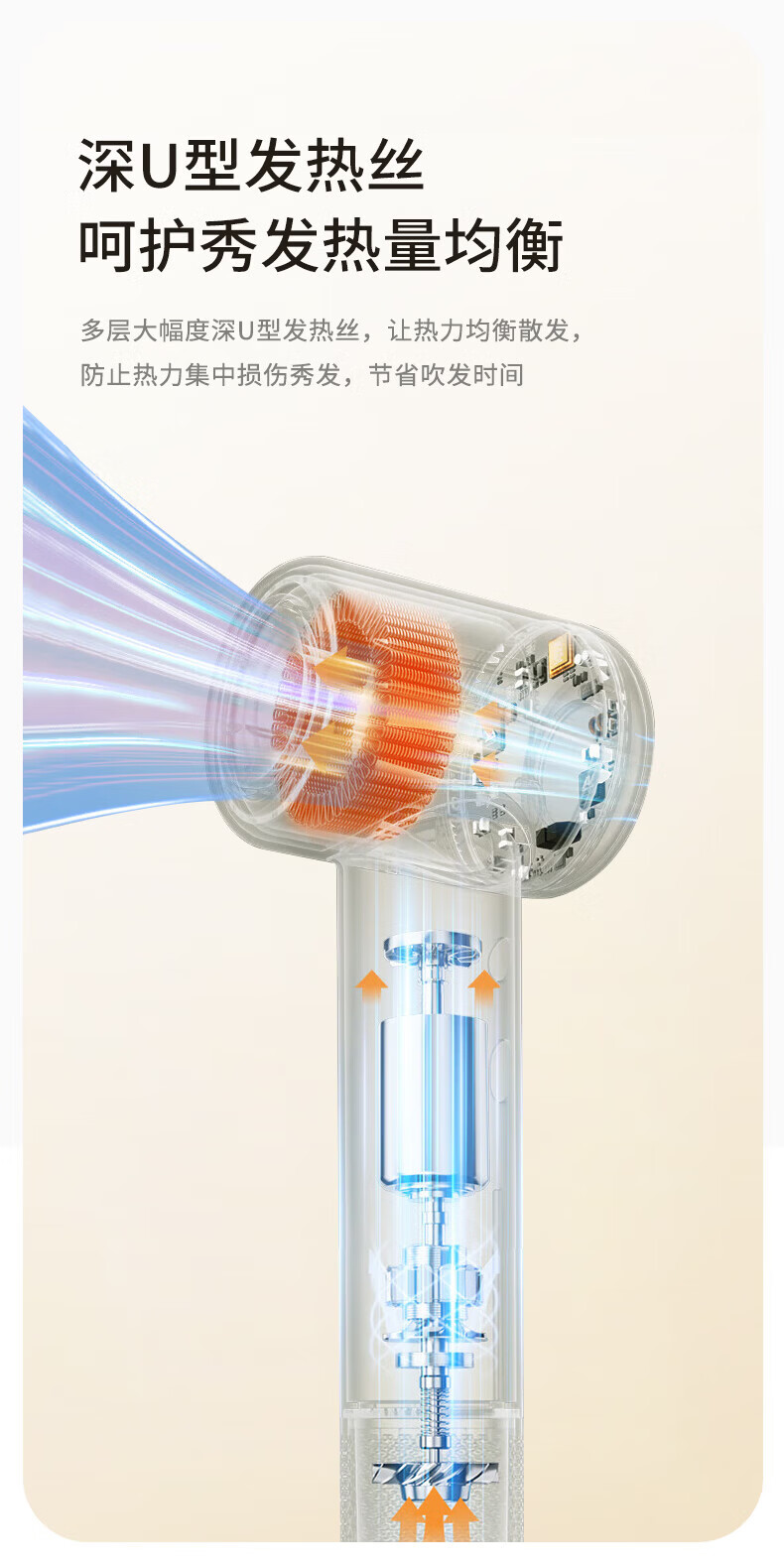 11万转高速无刷马达,2亿级负离子护发;三重过热保护、中空式风筒设计,磁吸式下沉拆卸网罩;两档风速调节,冷、温、热、冷热循环四档风温模式