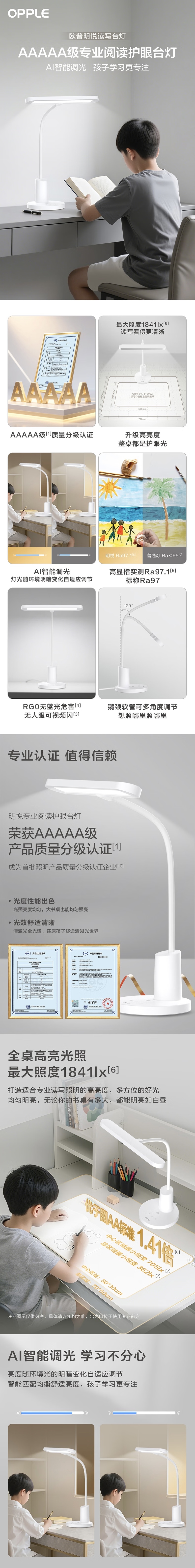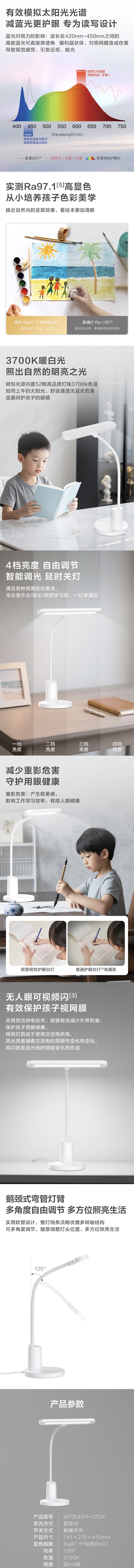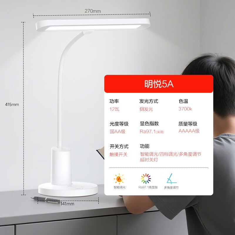 AAAAA级护眼,光照范围广,光线明亮柔和;4档亮度+AI智能感光亮度,延时关灯功能;RA97高显色指数,还原物体真实色彩;鹅颈弯管灯臂,多角度自由调节