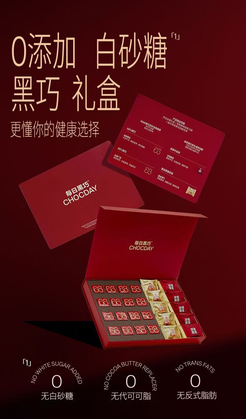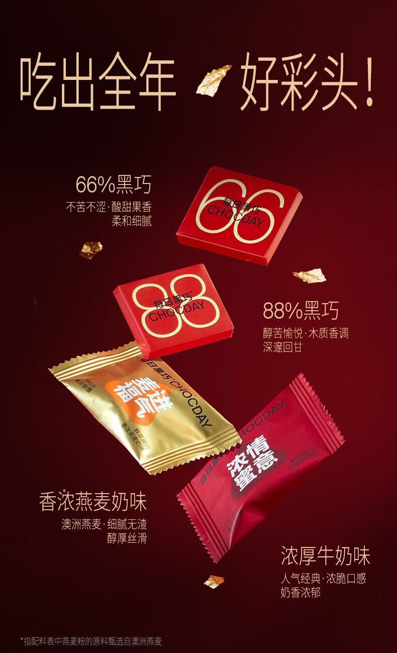 配置:88%黑巧克力52g,66%黑巧克力52g,鲜萃黑巧浓厚牛奶味巧克力制品25g,鲜萃黑巧香浓燕麦奶味巧克力制品25g