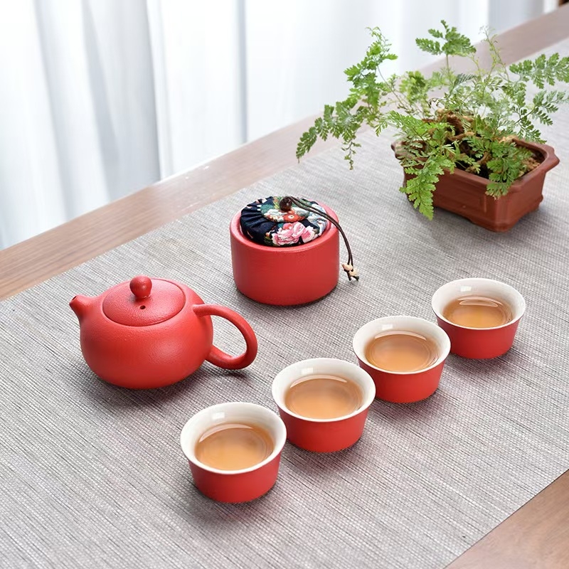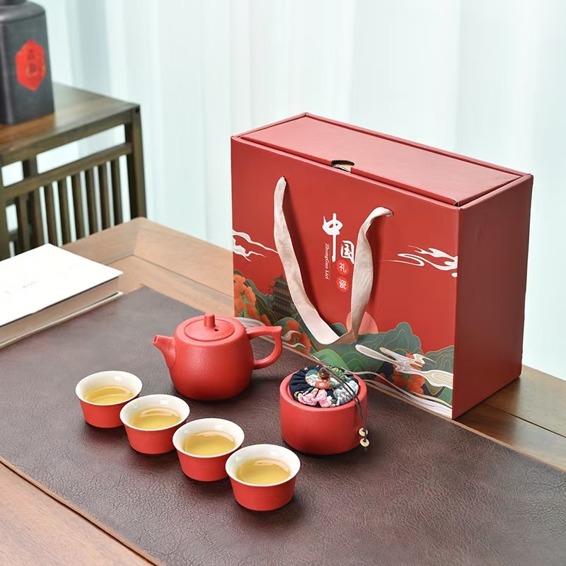 亚光磨砂釉茶具,手感舒适,一壶一茶叶罐四杯。;茶具上可以雕刻LOGO,礼盒可以UV定制;高性价比随手礼