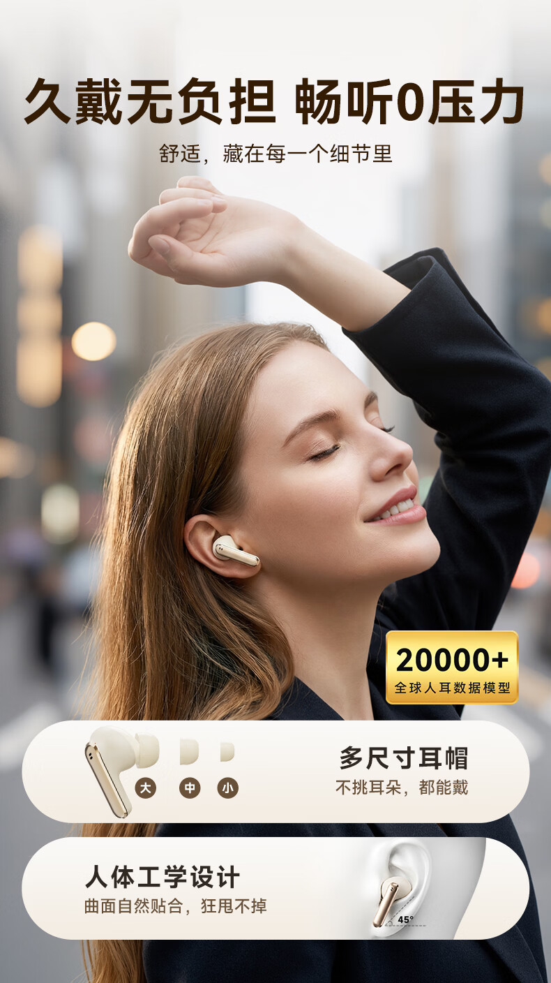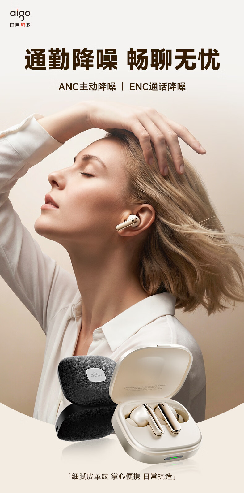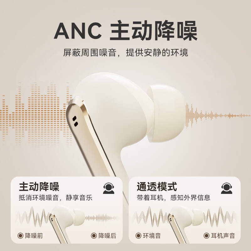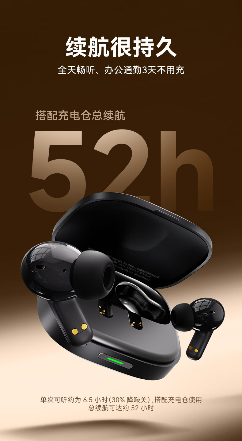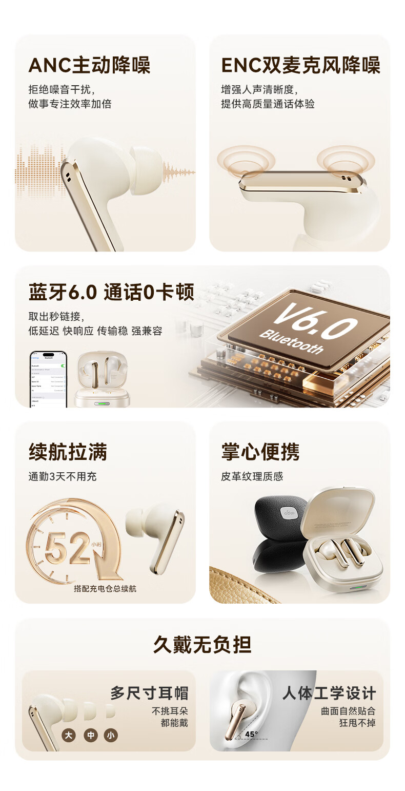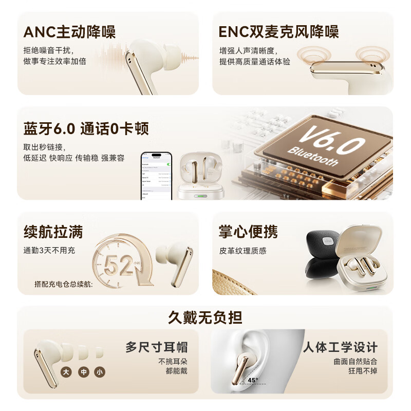 ANC主动降噪;掌心便携 ,皮革纹理质感;续航拉满, 通勤3天不用充