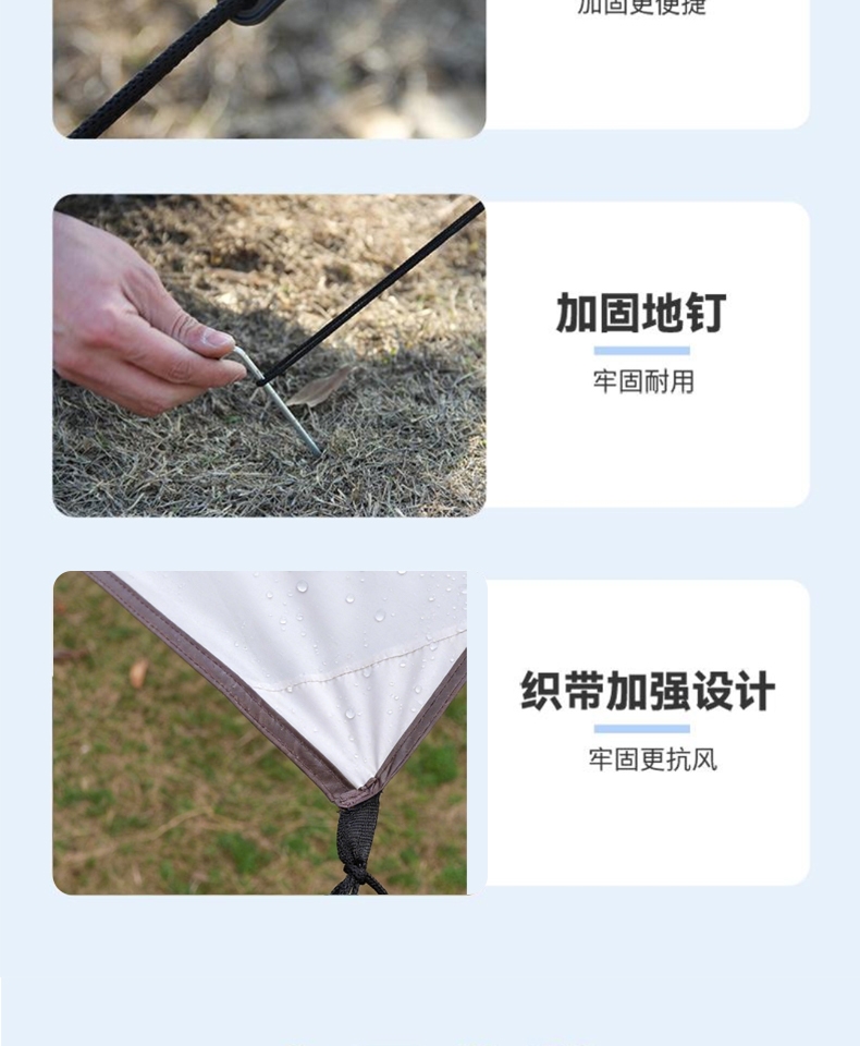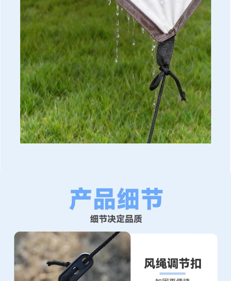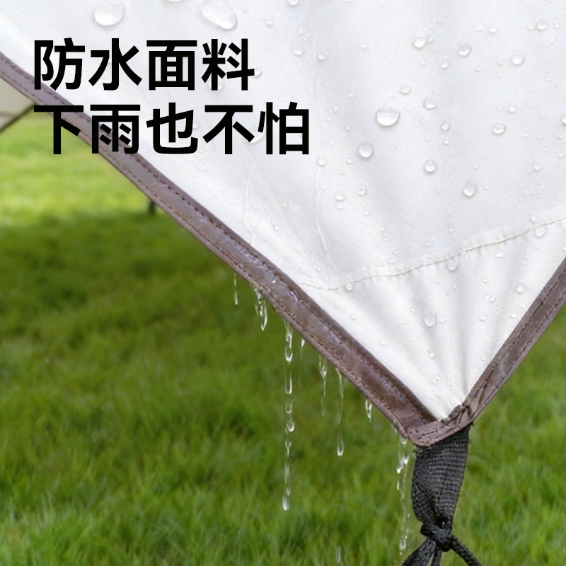 更轻便易携,可容4-6人使用;190T涤丝纺,布丝更细布面更防水防晒;配备粗壮天幕杆,杆壁更厚更牢固耐用;配牛津布收纳袋,收纳小巧,携带方便