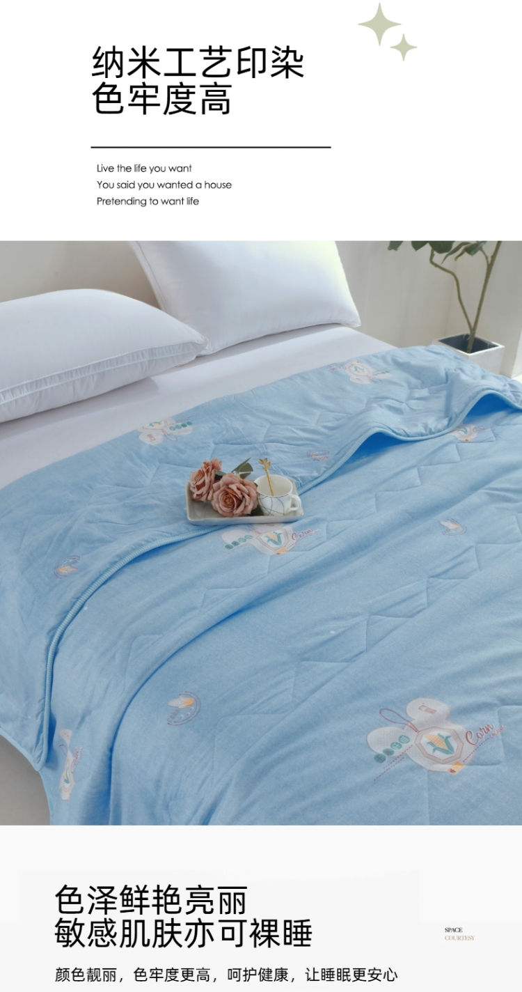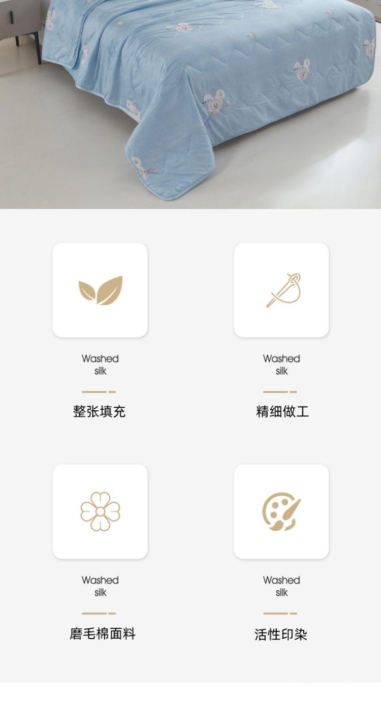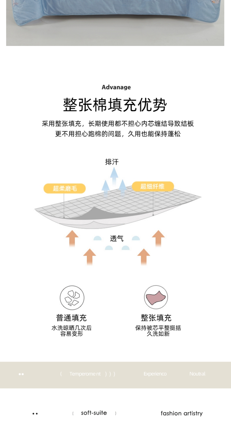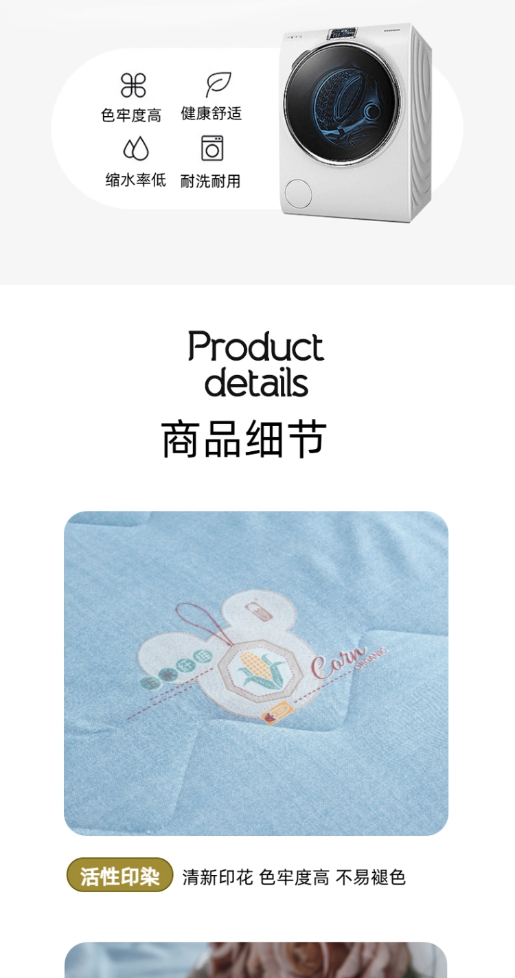 面料专版设计,纳米工艺印染,不掉色,可水洗;填充多孔纤维,柔软舒适,透气性好;采用多针绗绣工艺,做工精细,产品舒爽透气