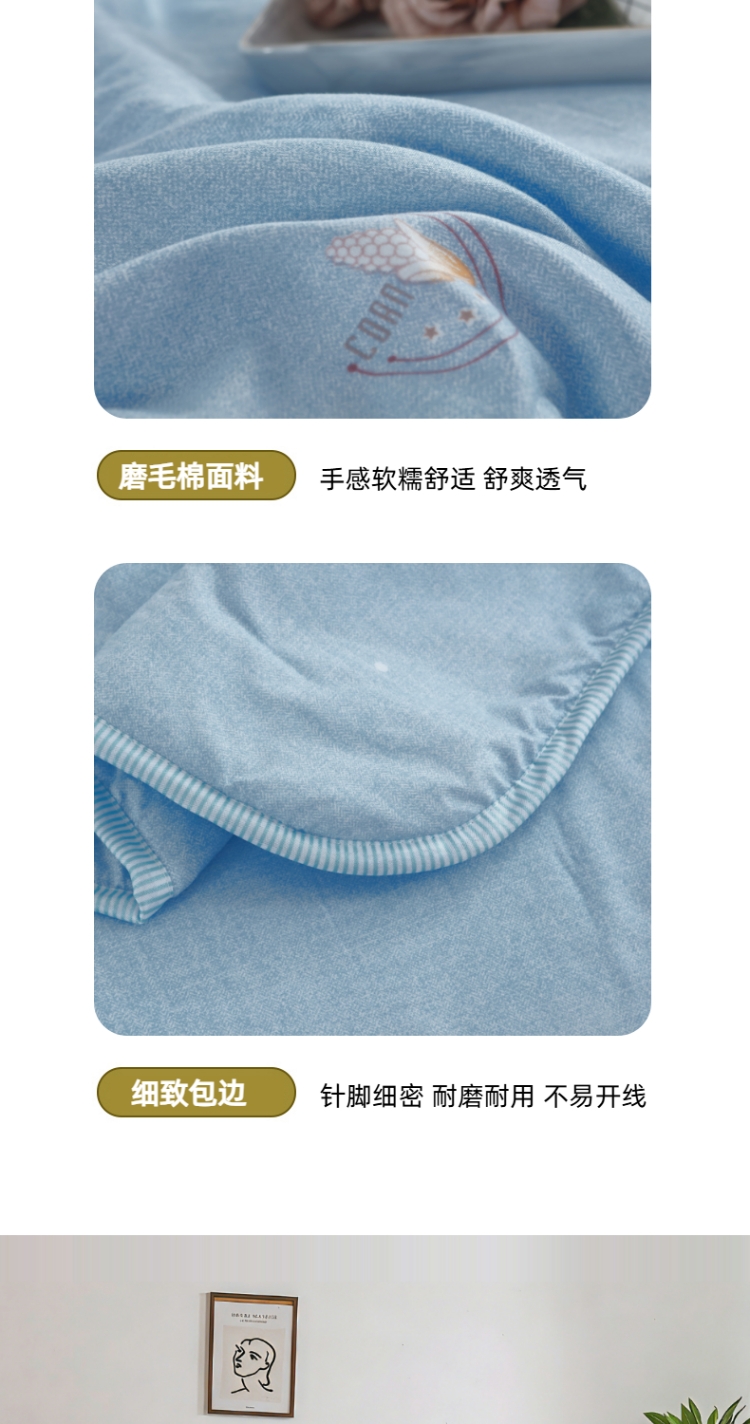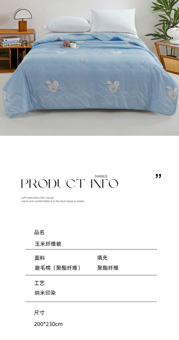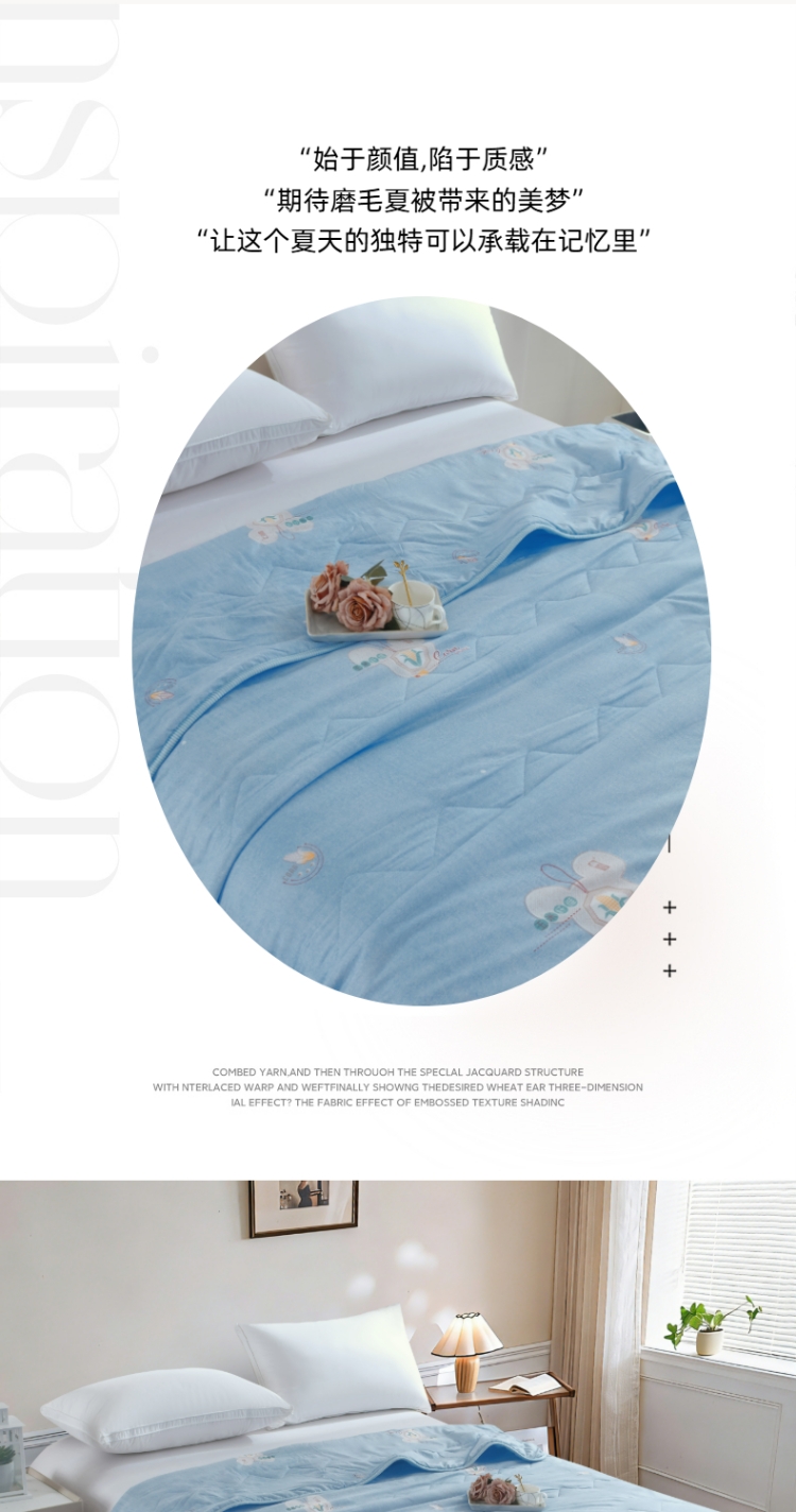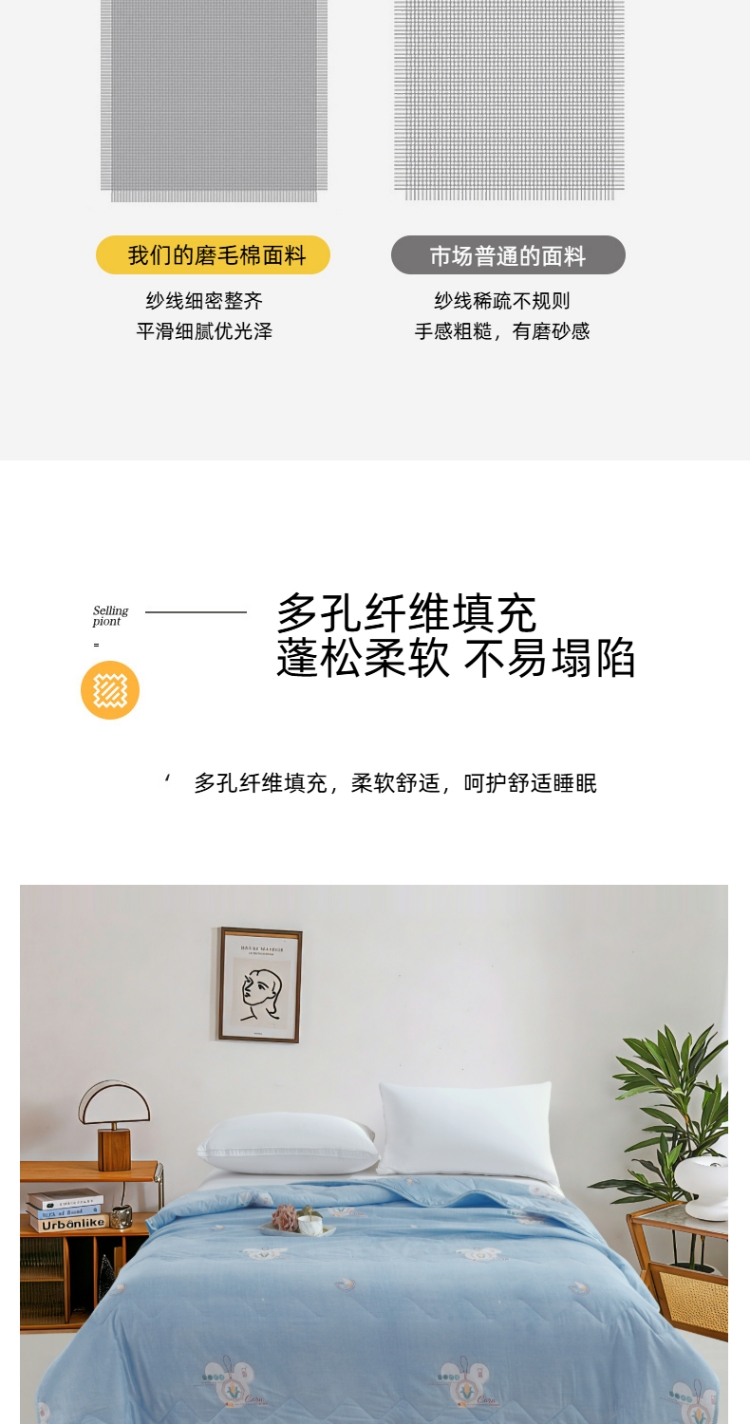 面料专版设计,纳米工艺印染,不掉色,可水洗;填充多孔纤维,柔软舒适,透气性好;采用多针绗绣工艺,做工精细,产品舒爽透气
