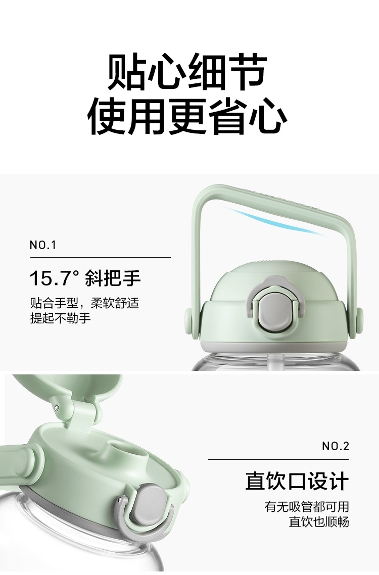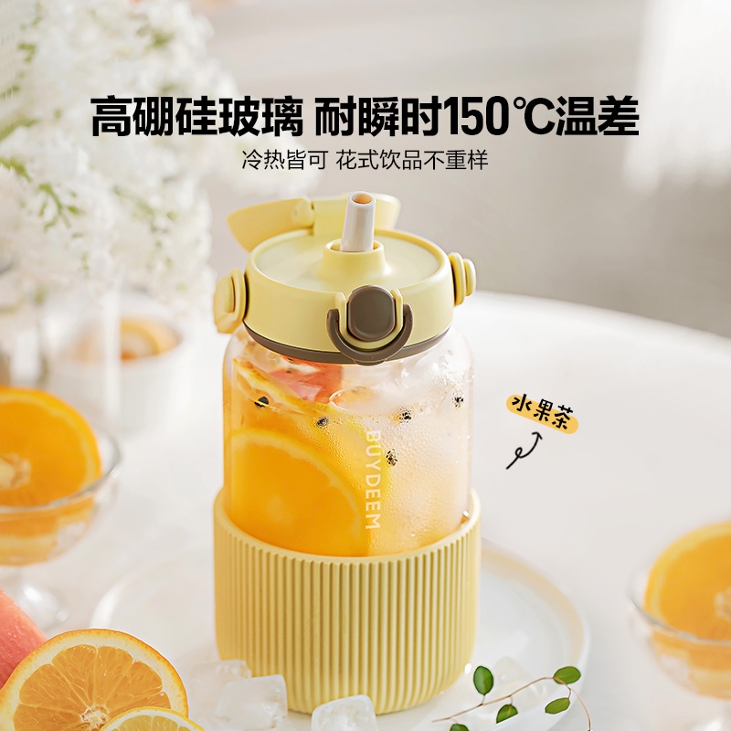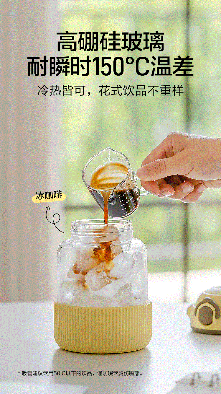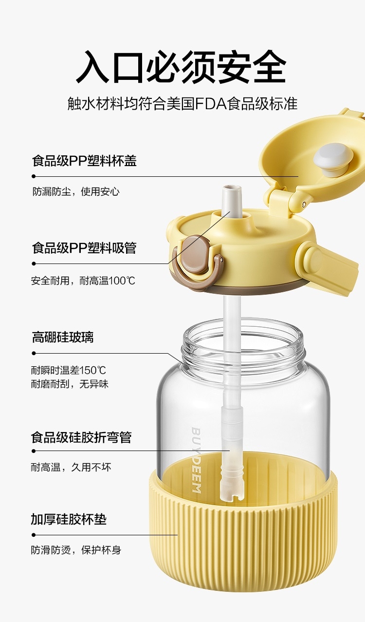 高硼硅玻璃冷热皆宜四季能用,耐瞬时温差150℃;大容量畅快吨,轻松喝水;轻松吸畅快饮,单手开盖轻松喝水