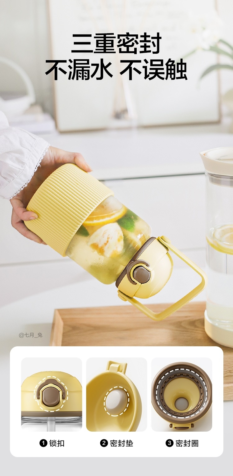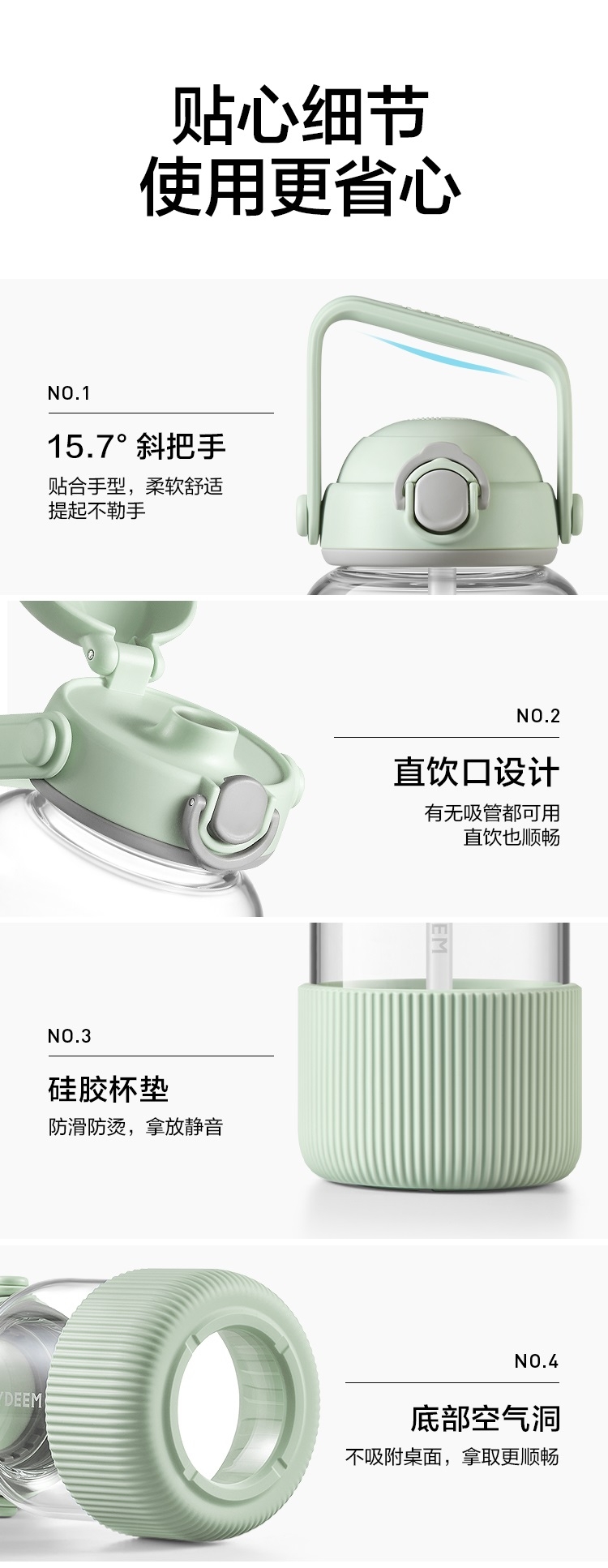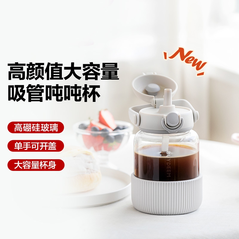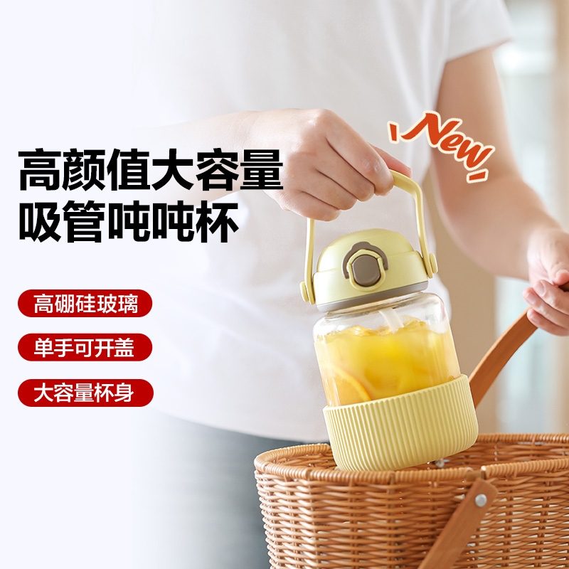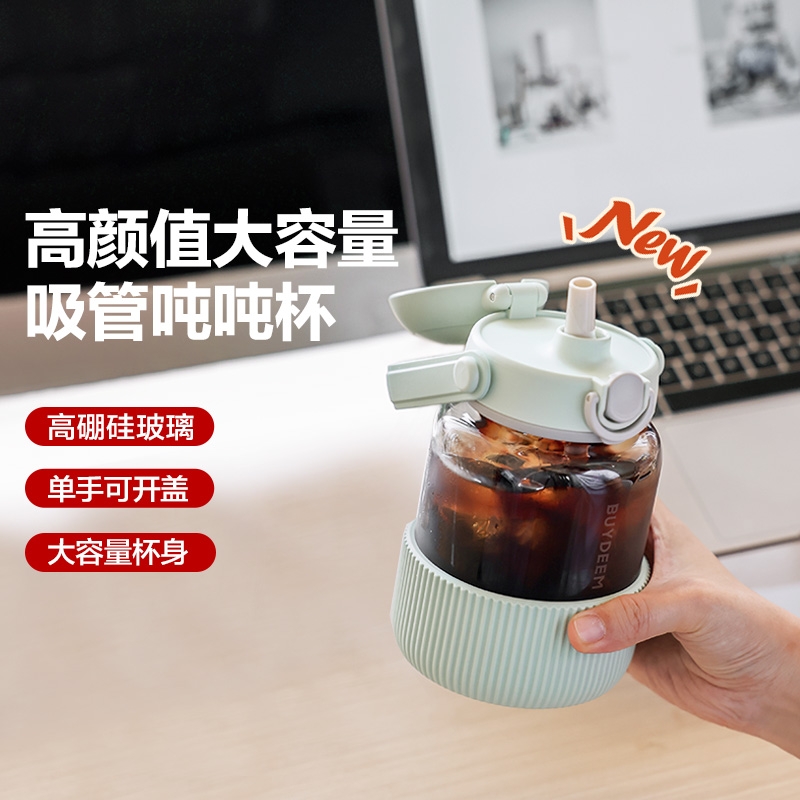 高硼硅玻璃冷热皆宜四季能用,耐瞬时温差150℃;大容量畅快吨,轻松喝水(办公/居家/户外均适用);轻松吸畅快饮,单手开盖轻松喝水;