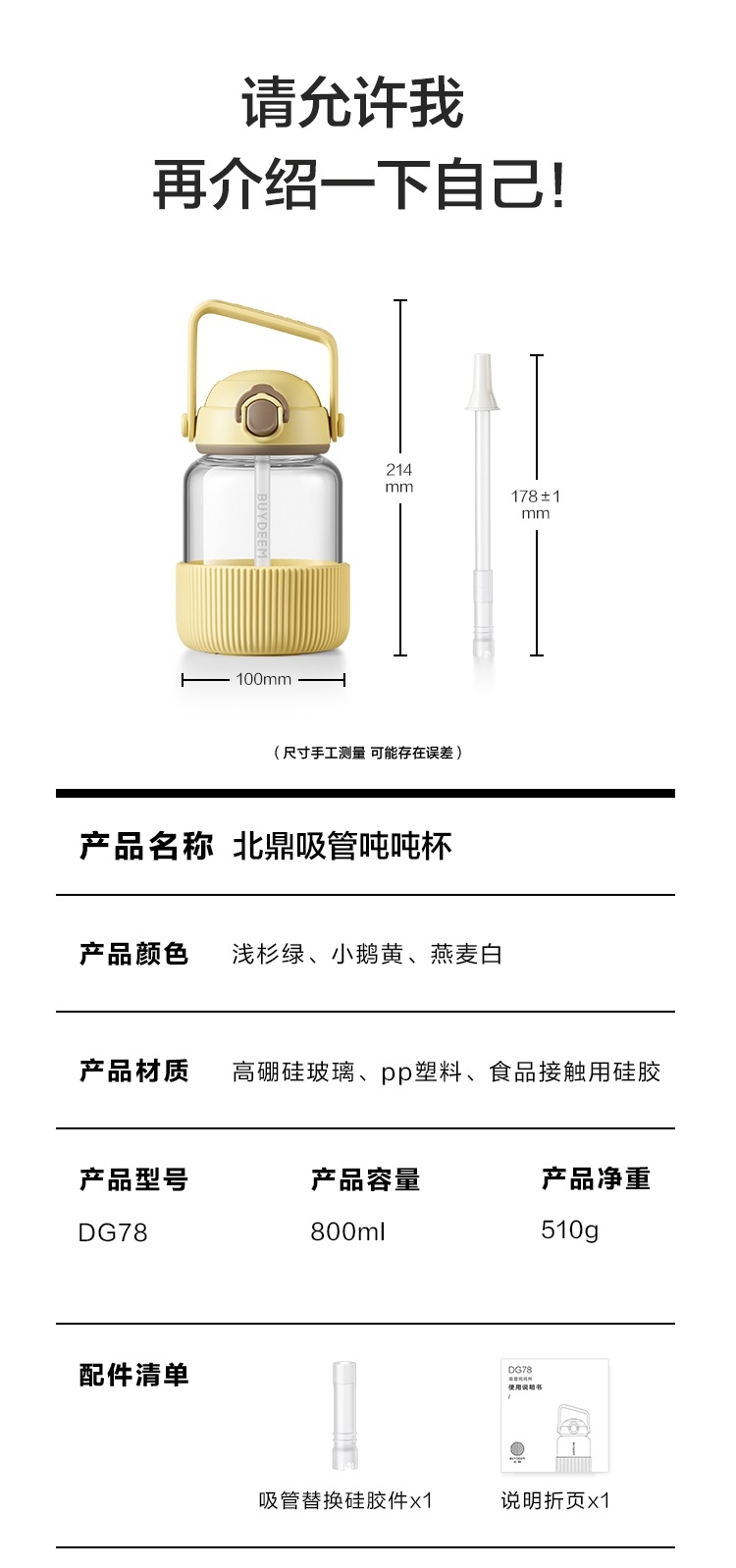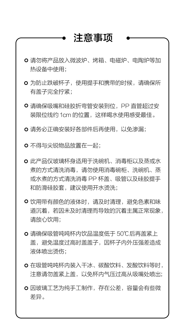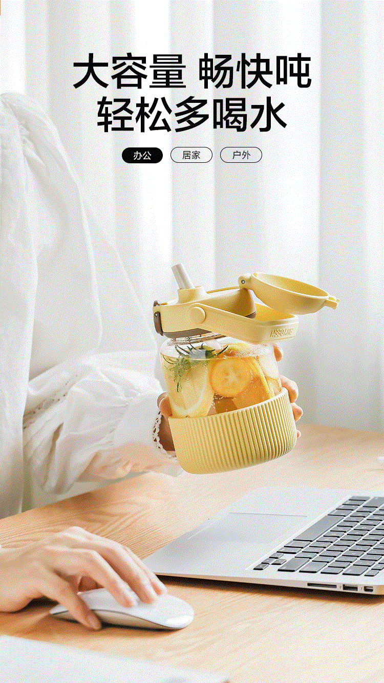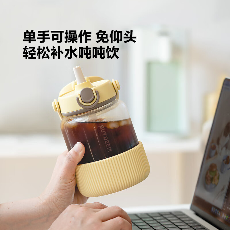 高硼硅玻璃冷热皆宜四季能用,耐瞬时温差150℃;大容量畅快吨,轻松喝水(办公/居家/户外均适用);轻松吸畅快饮,单手开盖轻松喝水;