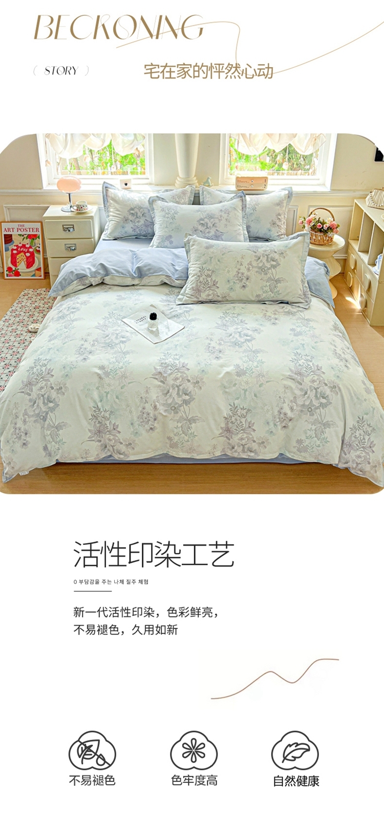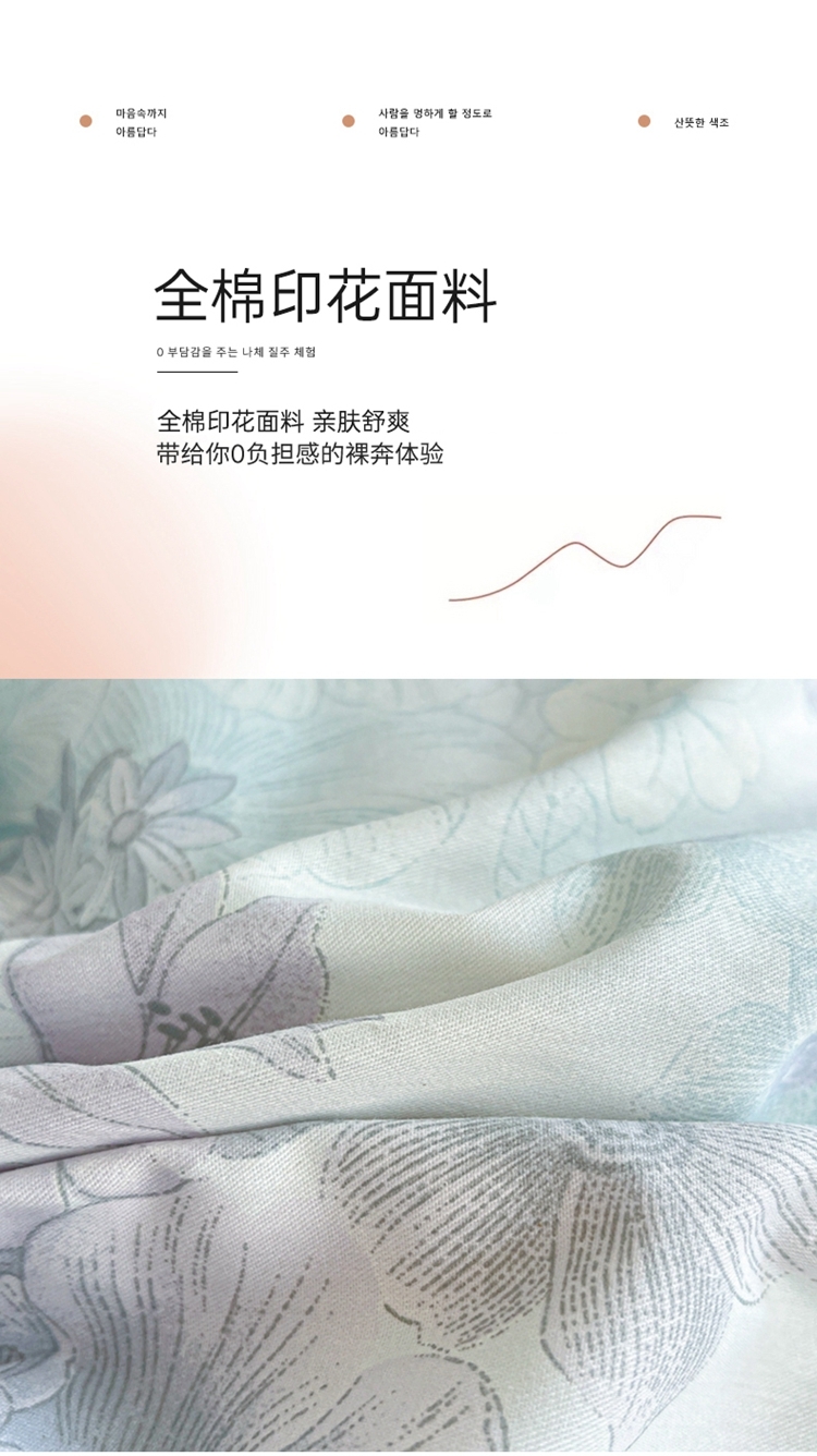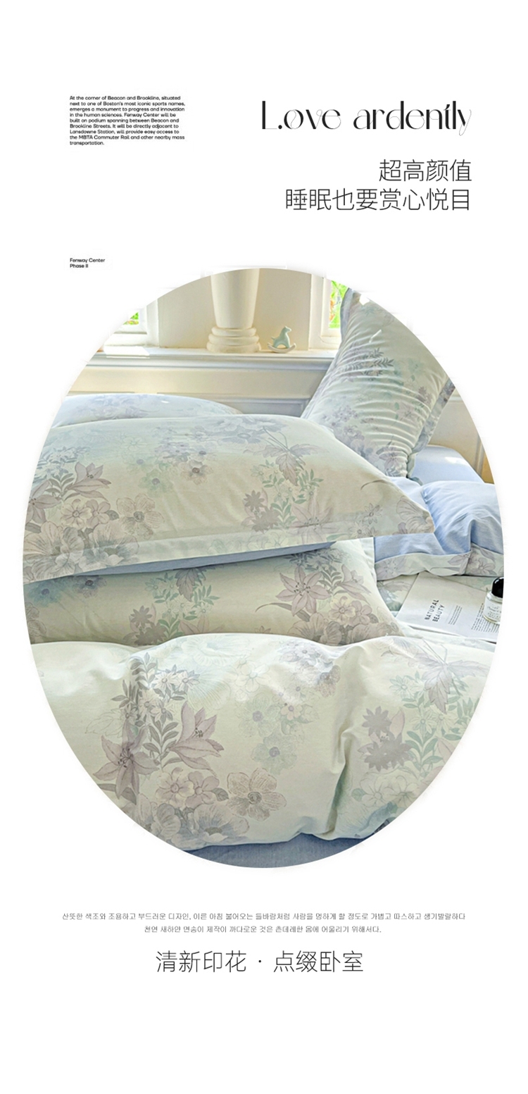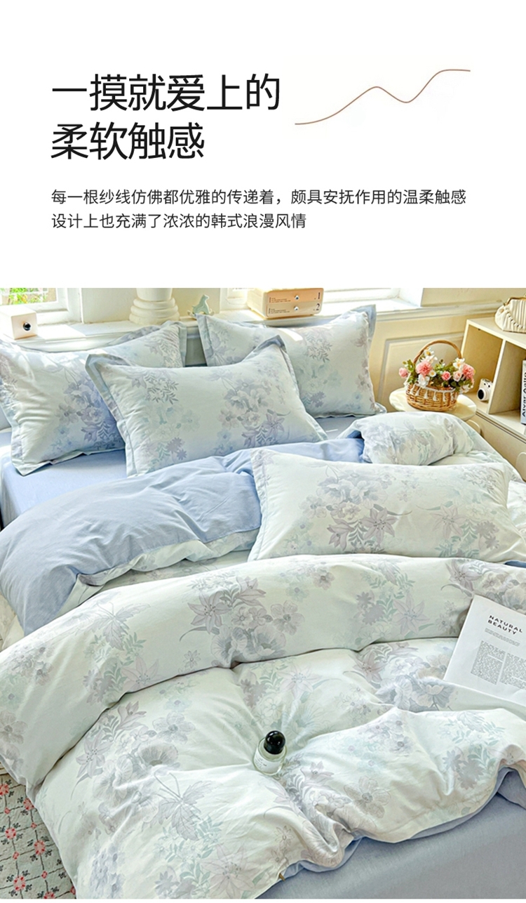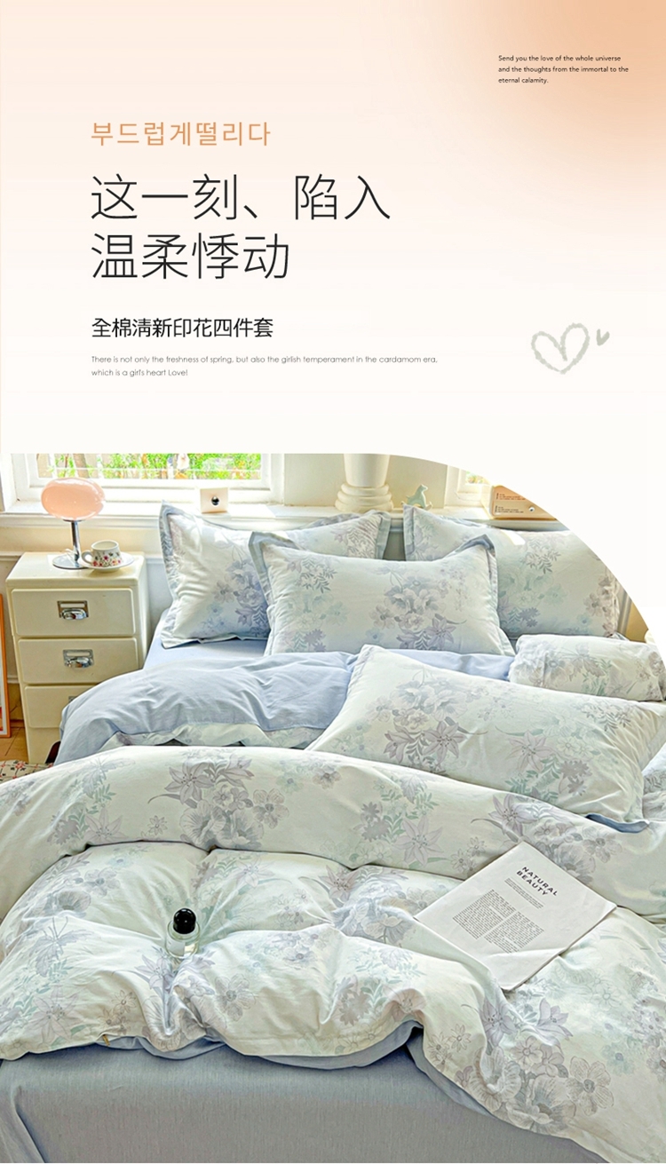 这一刻、陷入温柔悸动 全棉清新印花四件套;亲肤舒爽带给你0负担感的裸奔体验;甄选纤维柔长棉朵硕大的棉花纤维挑剔是为了配得上骄傲