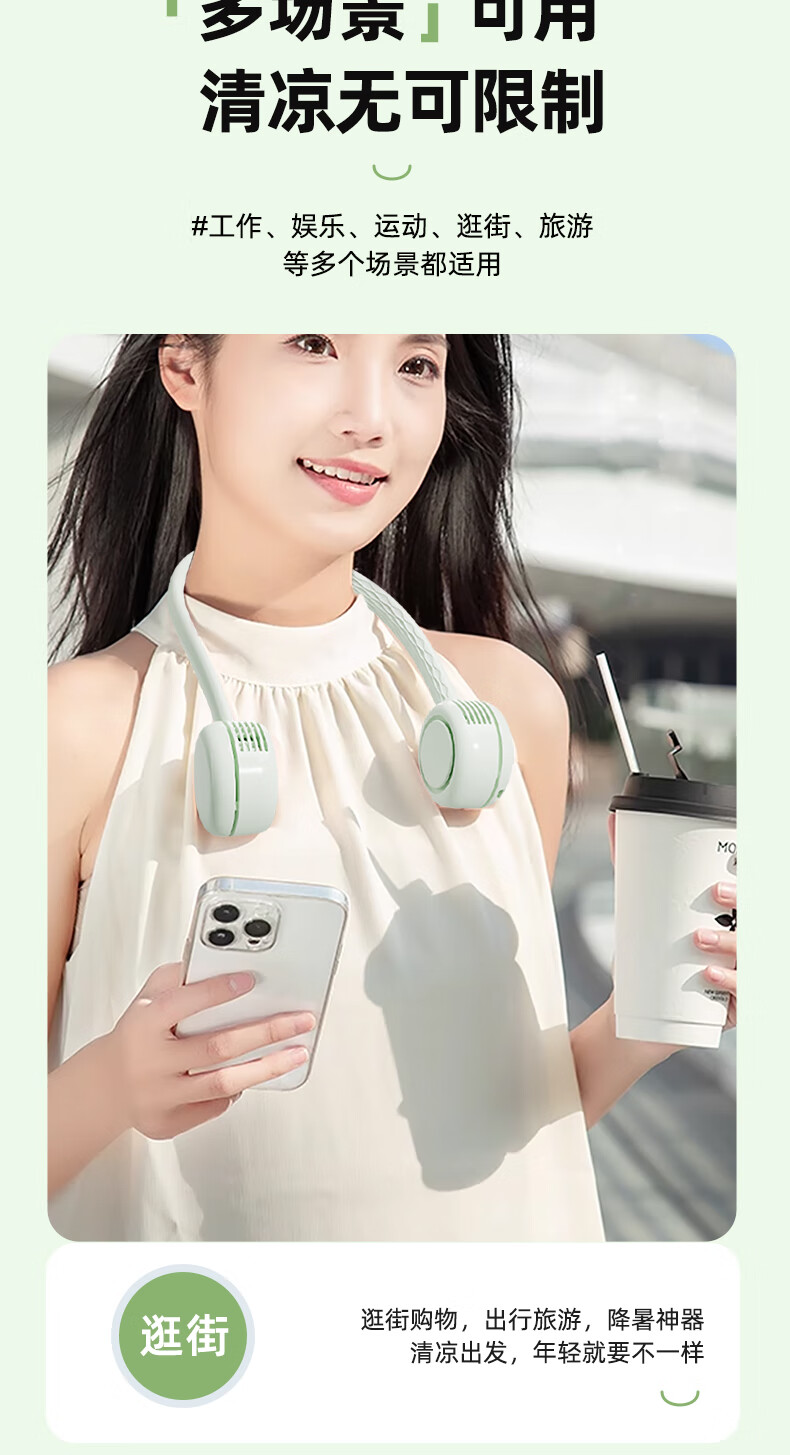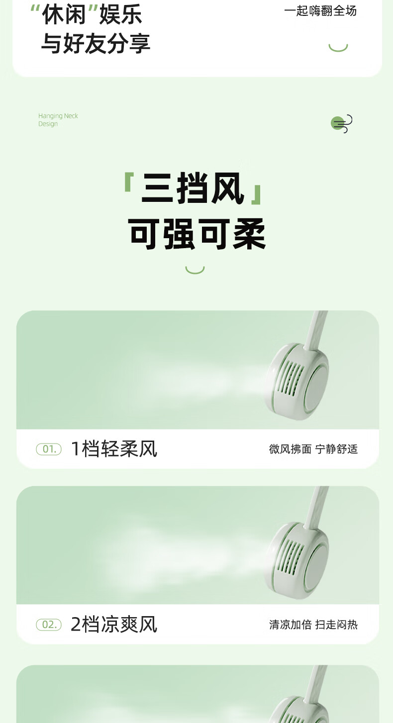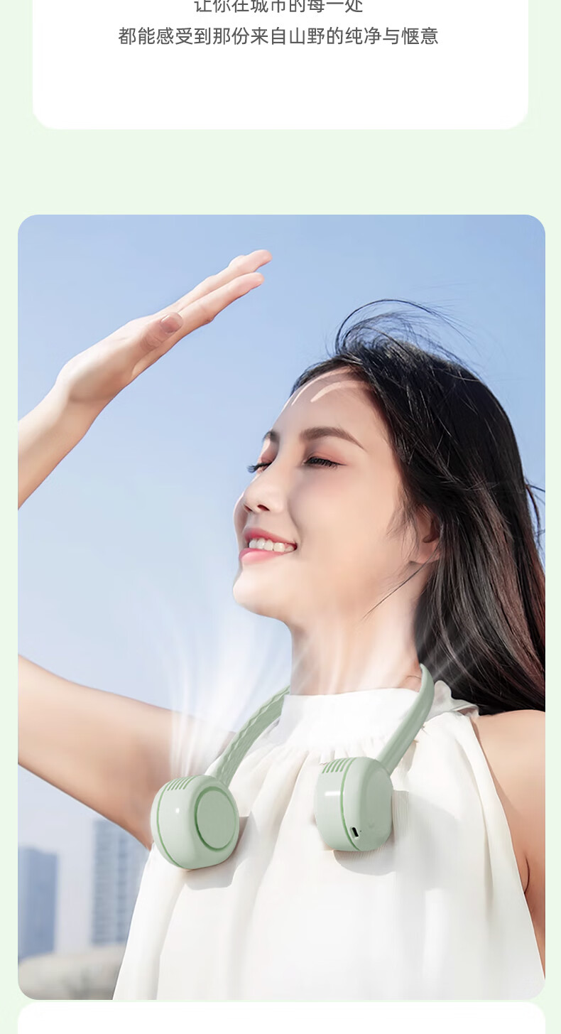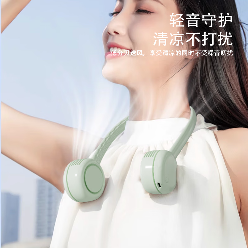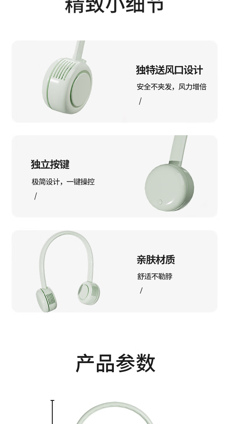 柔软硅胶,体积轻、无重力佩戴三档风力;风口设计(安全不夹发)无线持久续航;无刷电机双涡轮风道设计