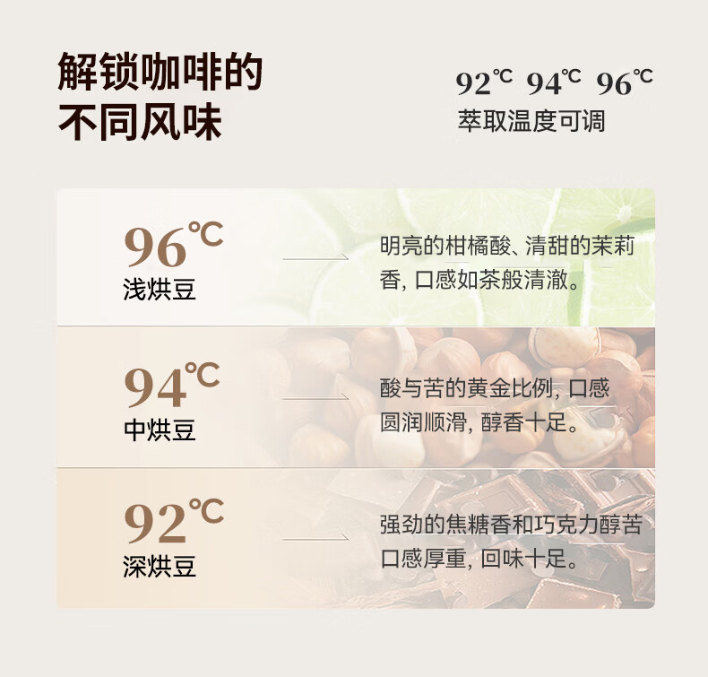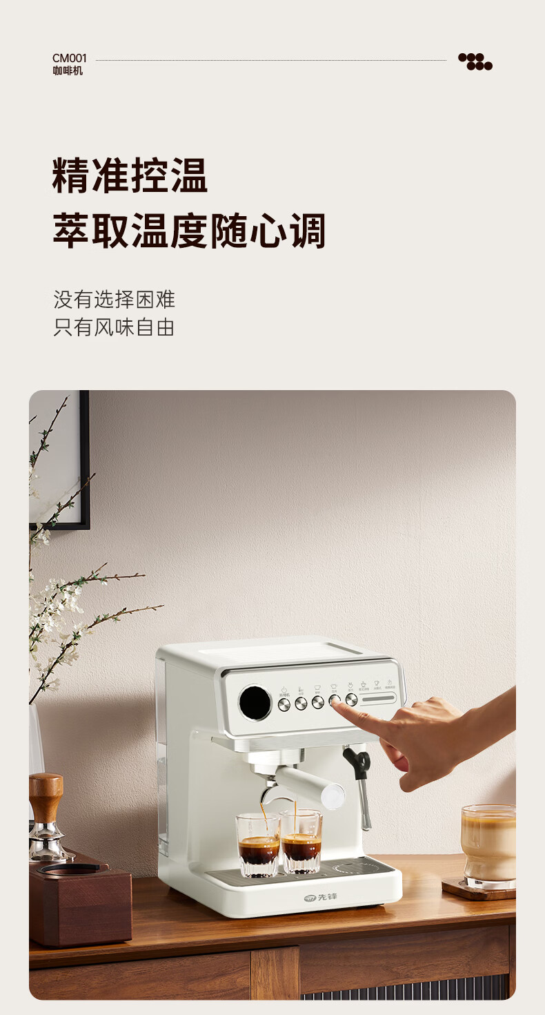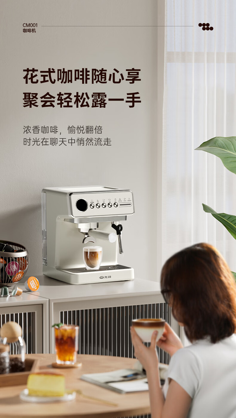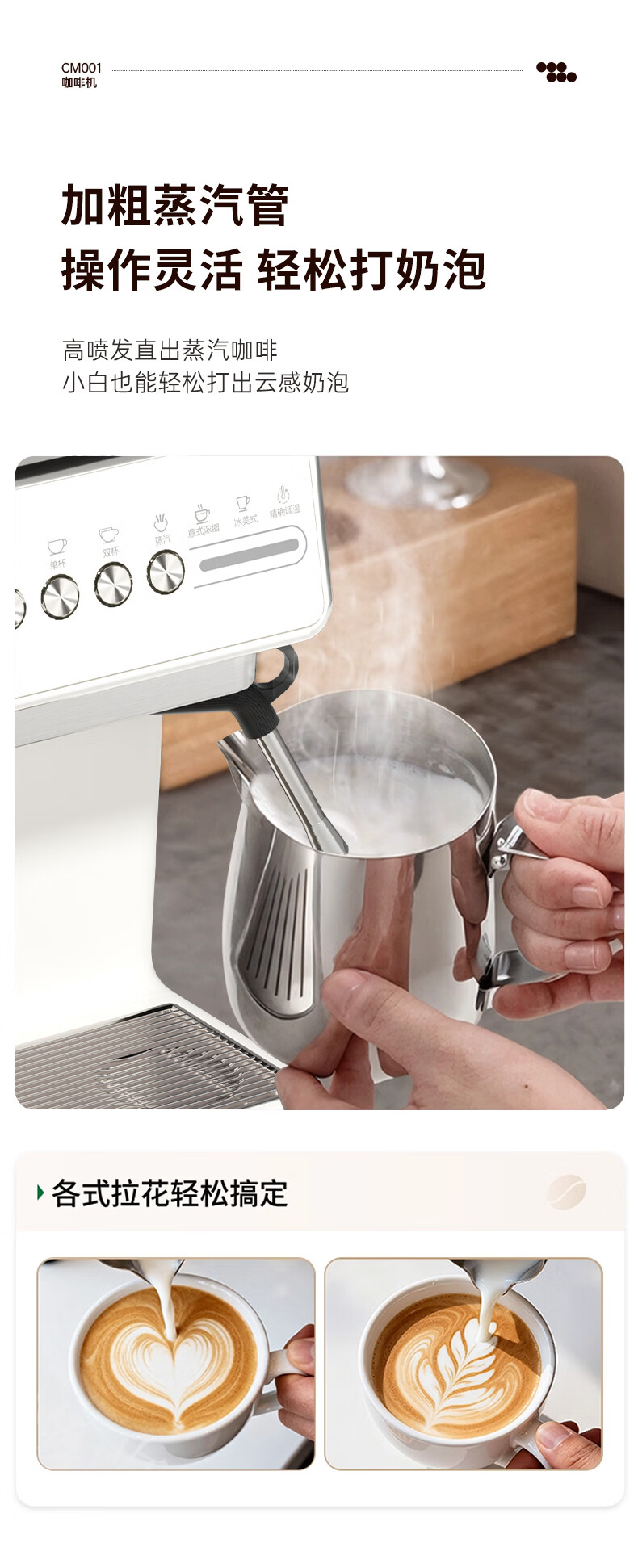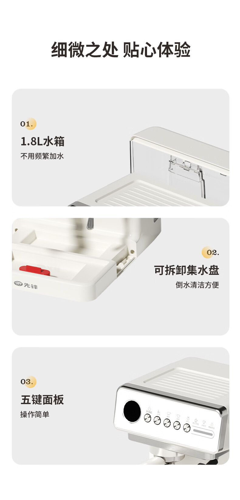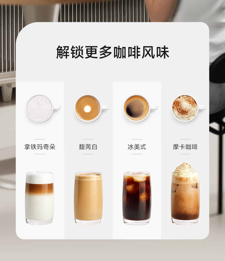 1.8L大容量水箱,无需频繁加水,可拆卸,易洗易装;搭配可拆卸积水盘,清洁维护轻松省心;冷热双萃系统,特调冰咖,清爽顺滑,换醒味蕾