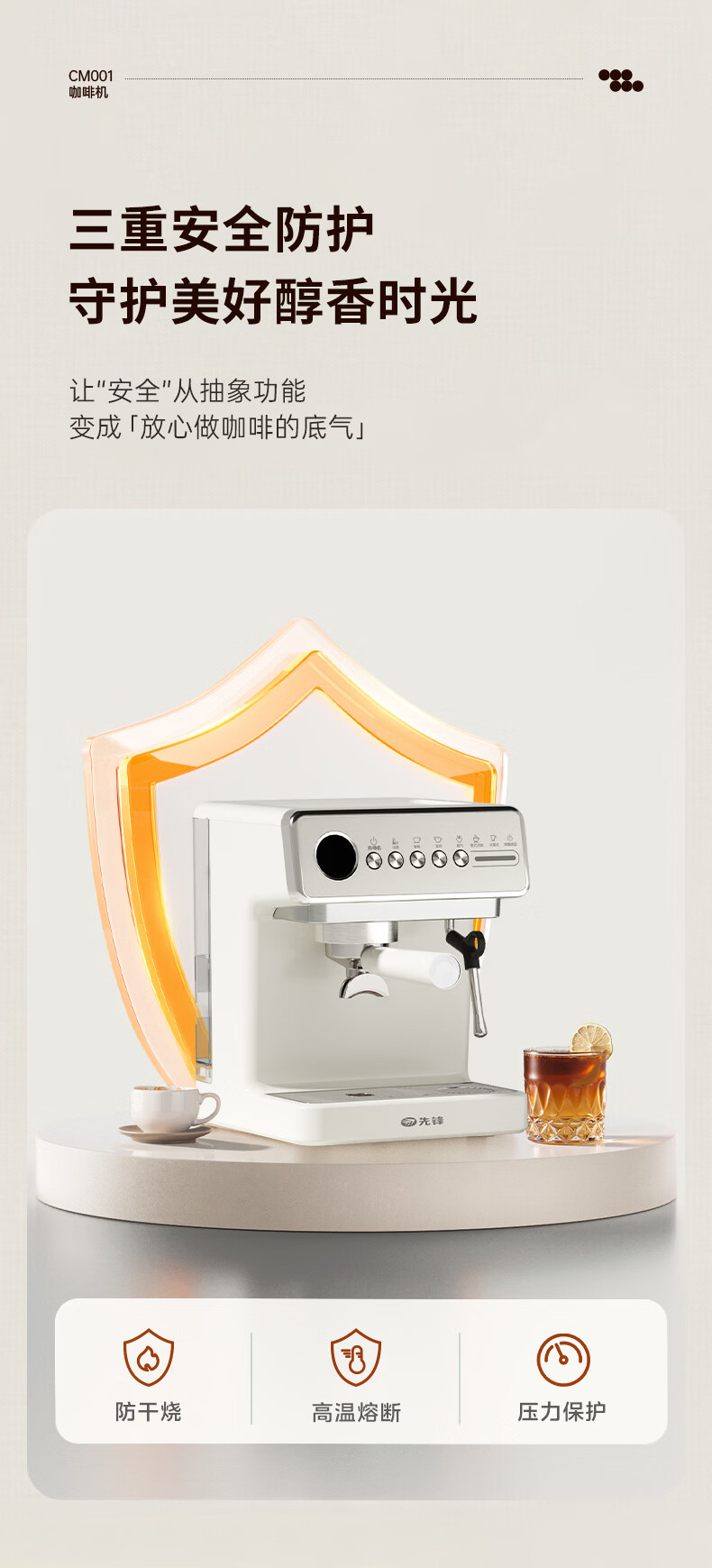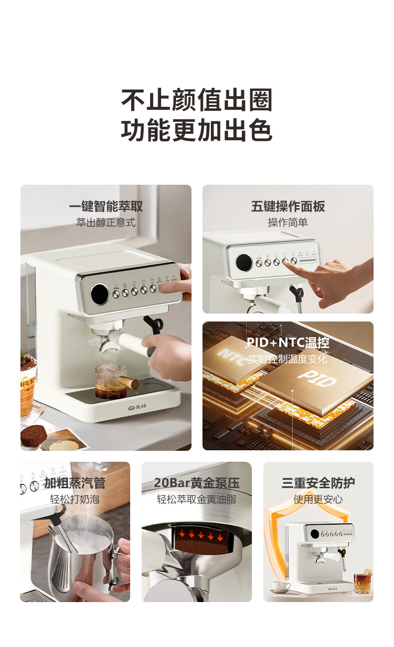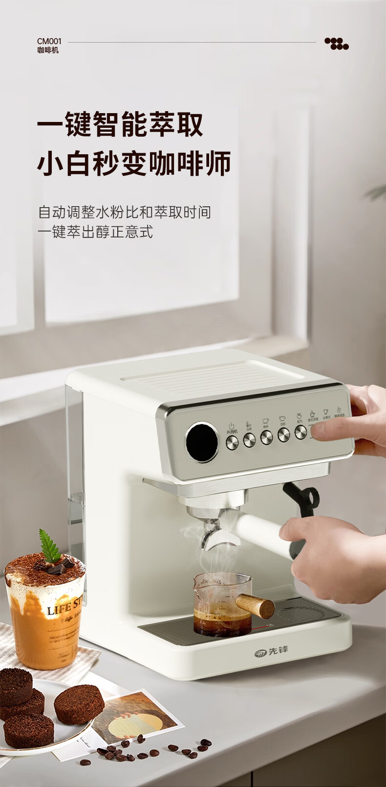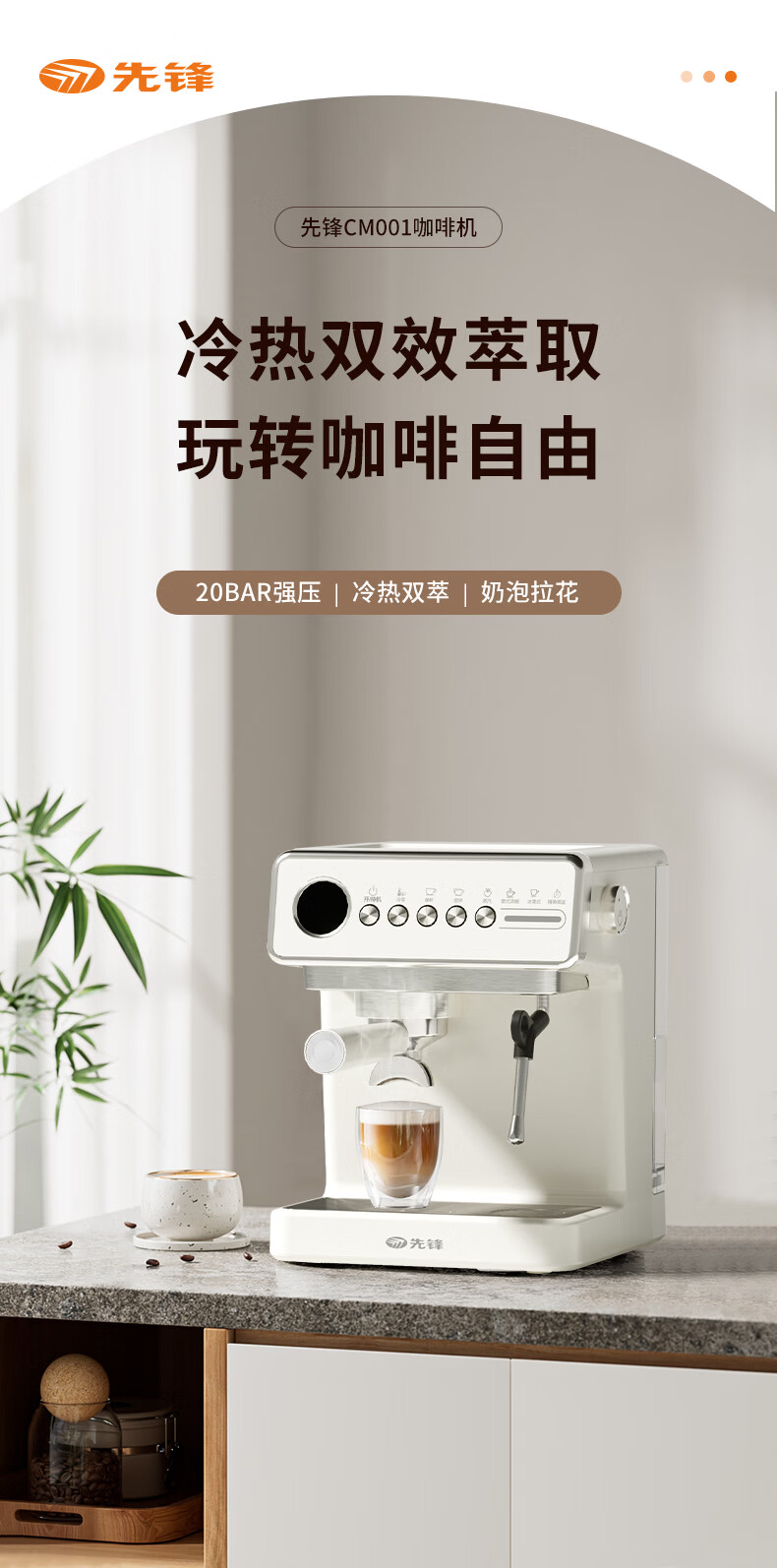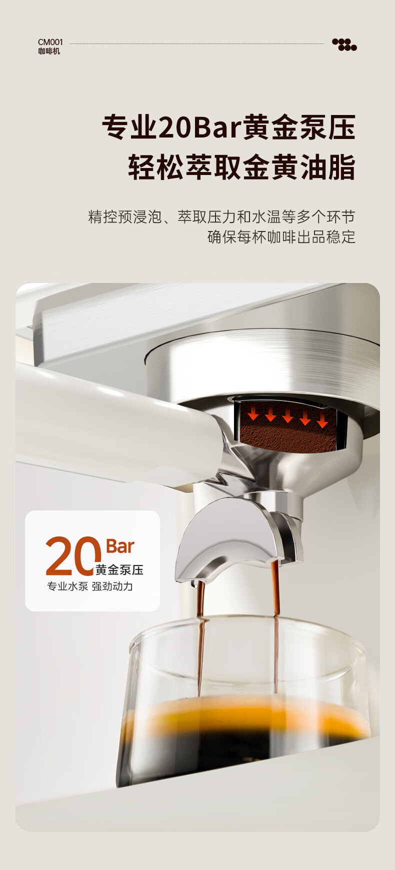 1.8L大容量水箱,无需频繁加水,可拆卸,易洗易装;搭配可拆卸积水盘,清洁维护轻松省心;冷热双萃系统,特调冰咖,清爽顺滑,换醒味蕾