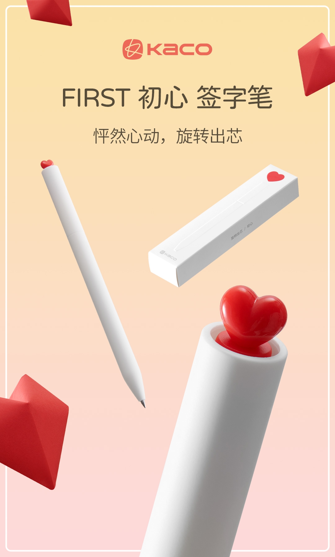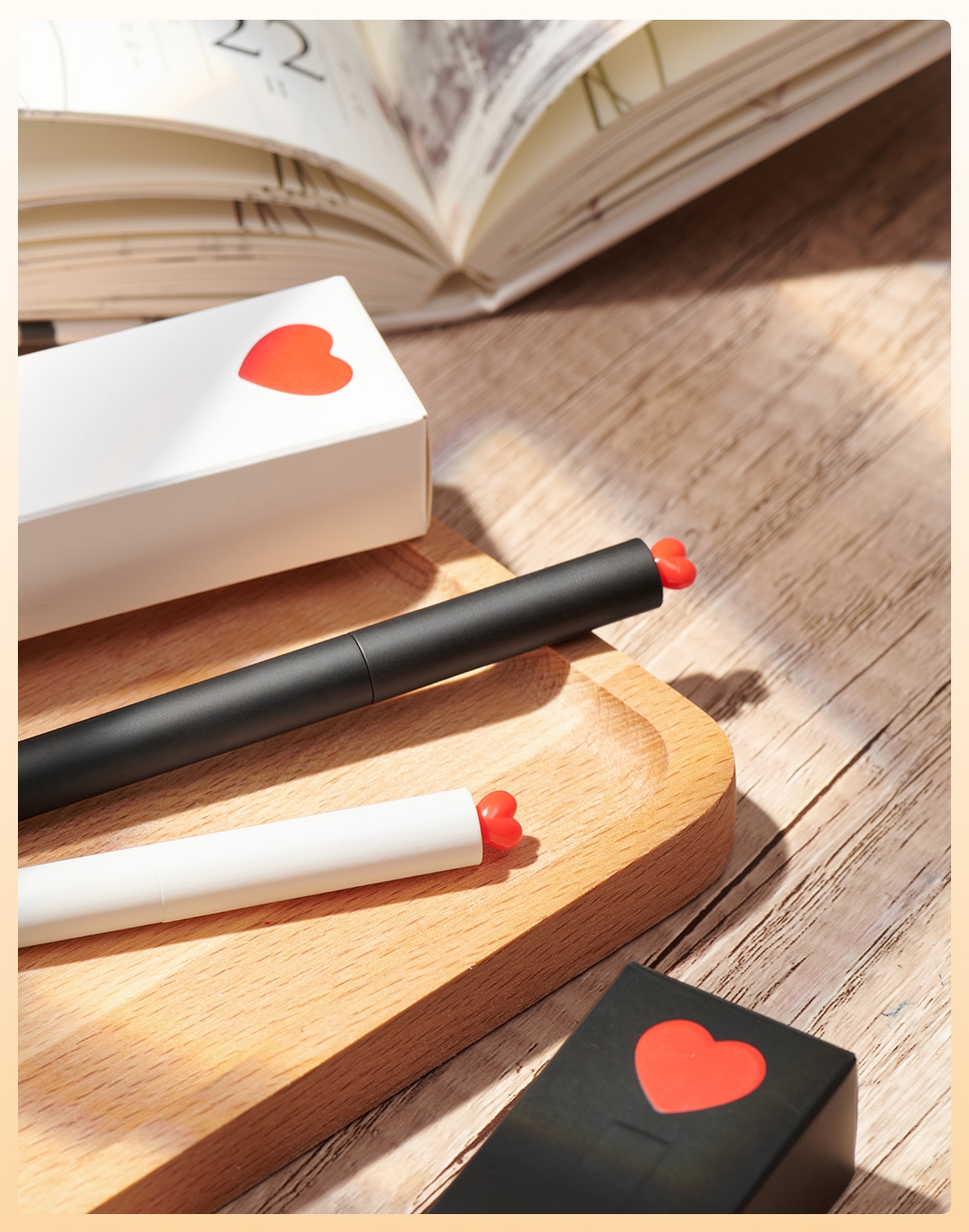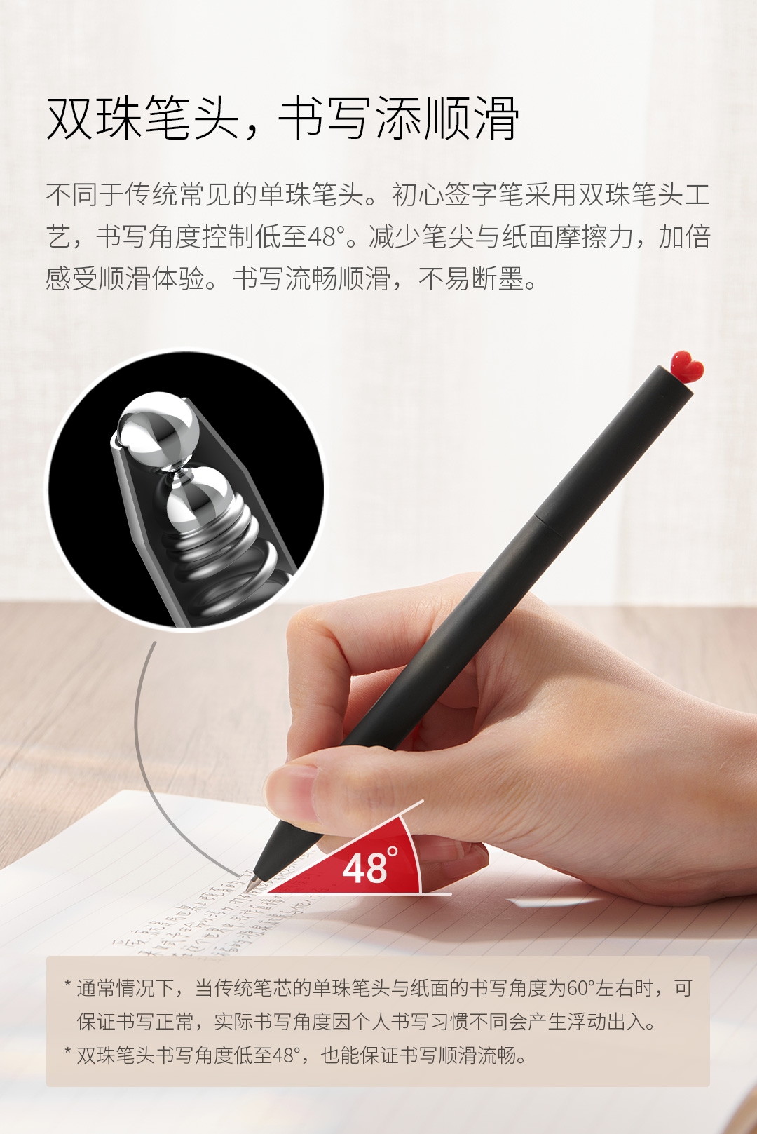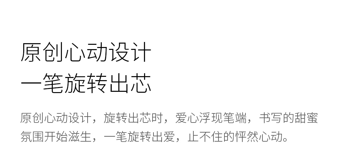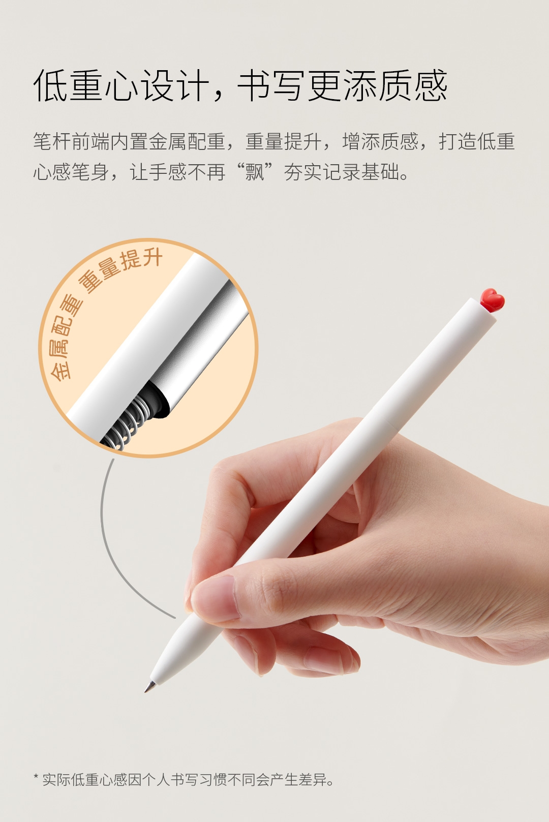 原创心动设计,旋转出芯时,爱心浮现笔端;采用低重心设计,笔杆前端内置金属配重,重量提升;采用双珠笔头,书写添顺滑,书写长度约为 600 米