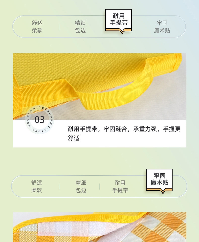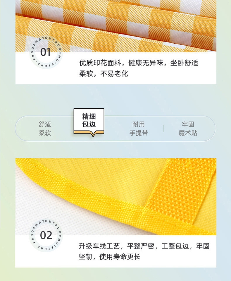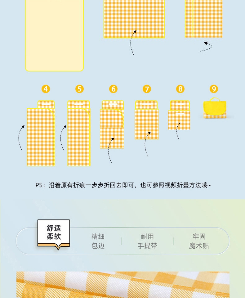 折叠不足A4大小,好收纳不占空间;带手提袋,携带方便;无纺布防潮防尘;黄白格颜色百搭,充满活力