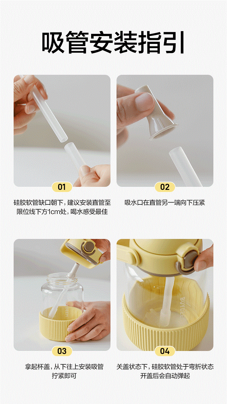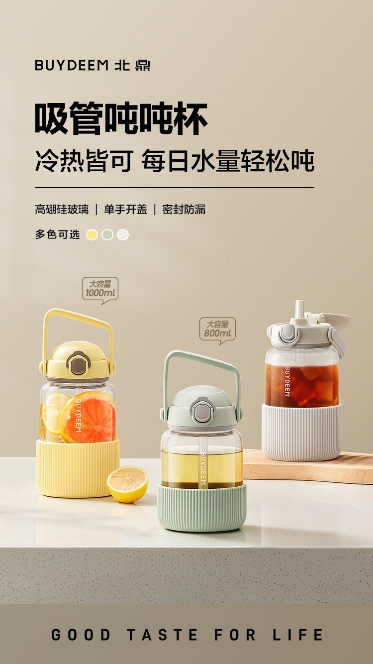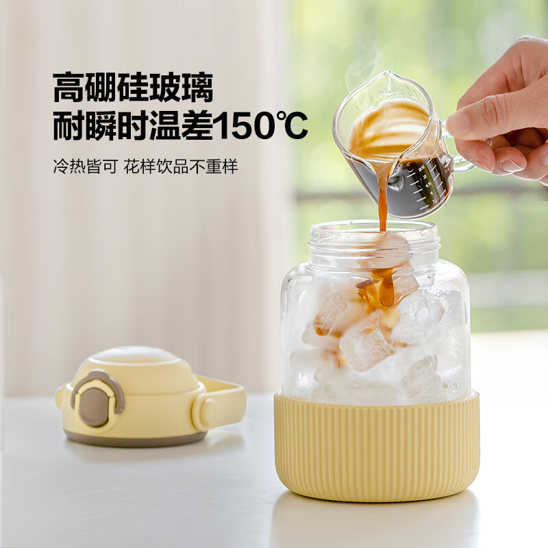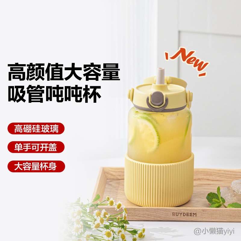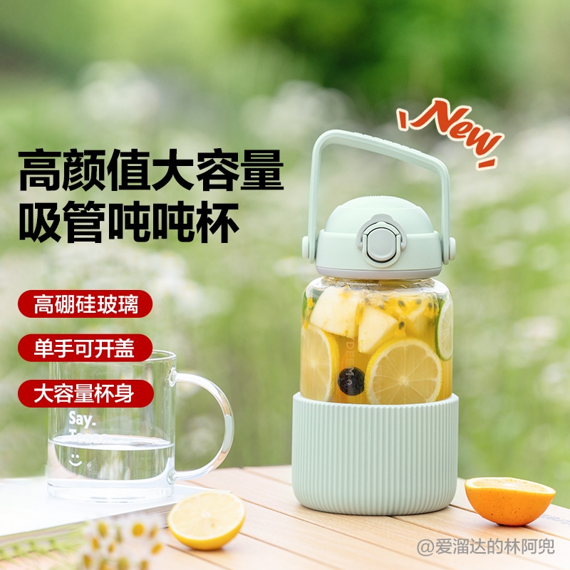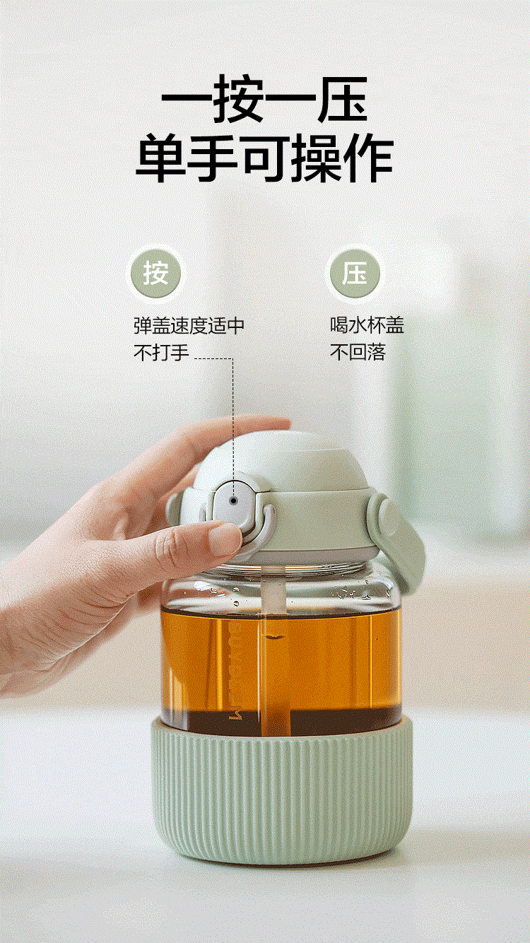 高硼硅玻璃冷热皆宜四季能用,耐瞬时温差150℃;;大容量畅快吨,轻松喝水(办公/居家/户外均适用);;轻松吸畅快饮,单手开盖轻松喝水;