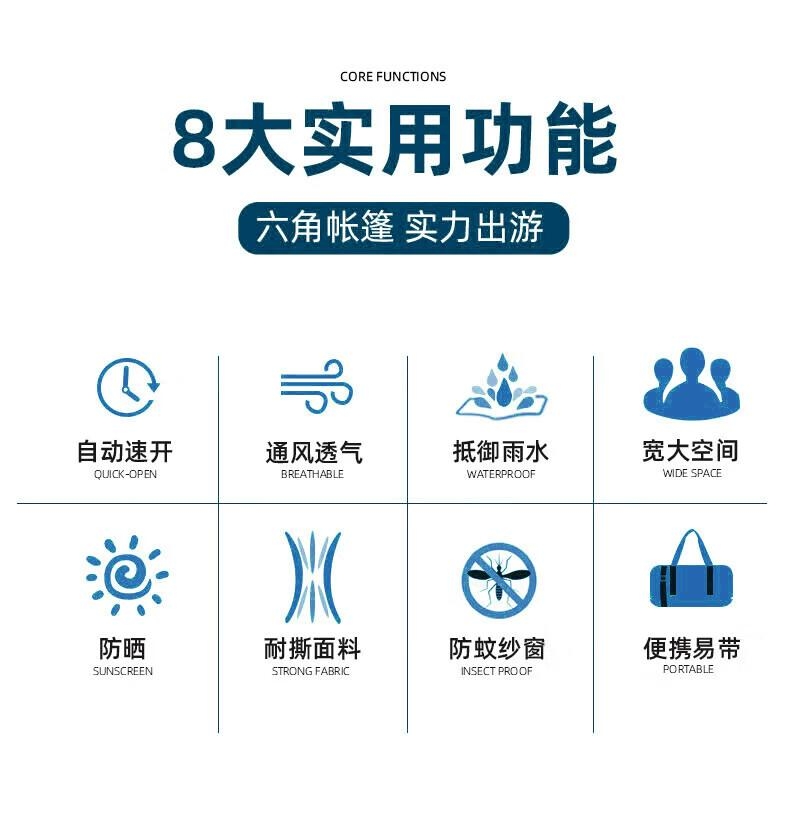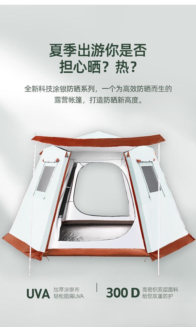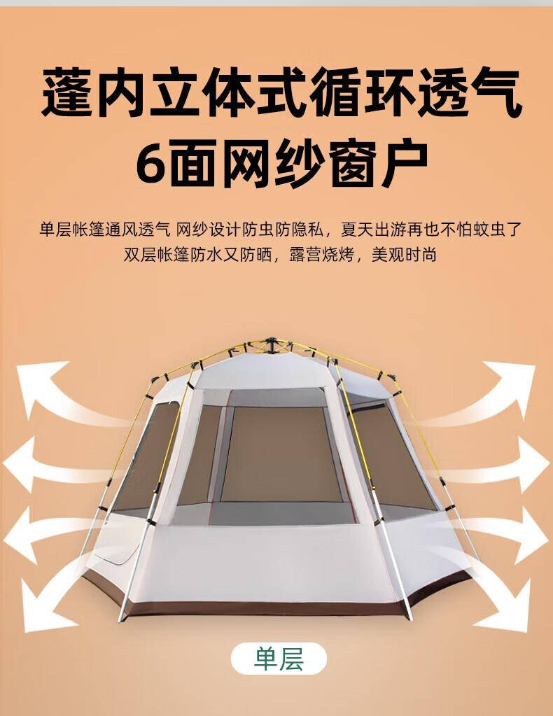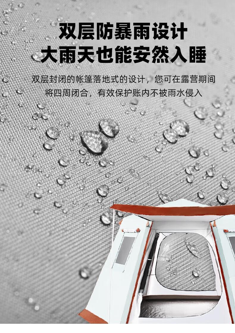 8 级强风防护,专业级户外抗造;双重深度压胶,PU8000 暴雨级防水;六角双层结构,四季通用保暖防潮;超大旅居空间,5-6 人舒适共处;UPF50 + 高倍防晒,全波段紫外线阻隔