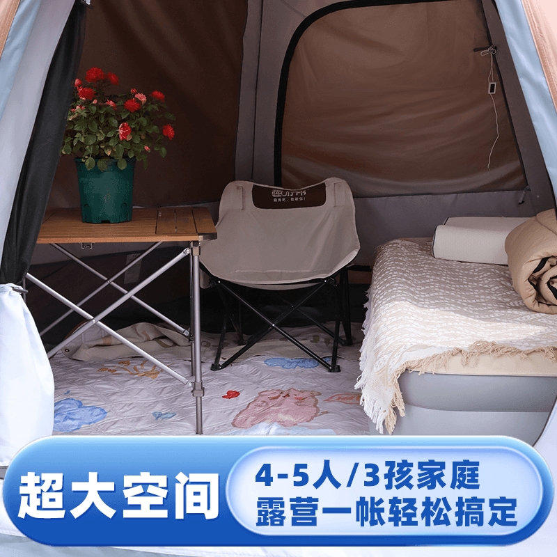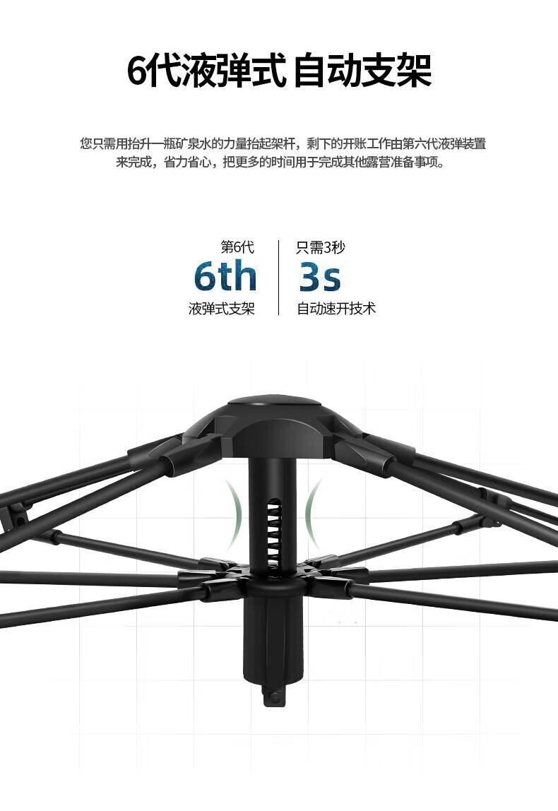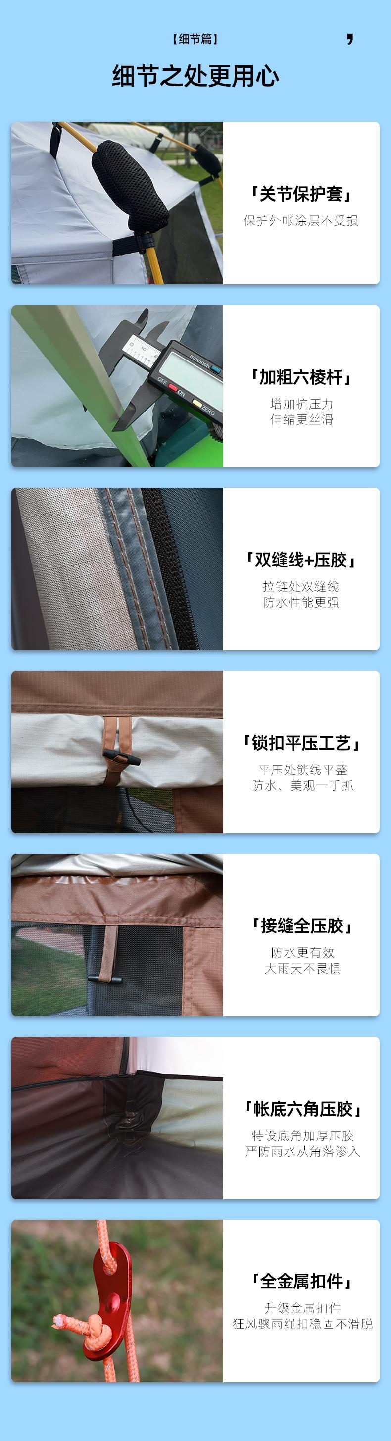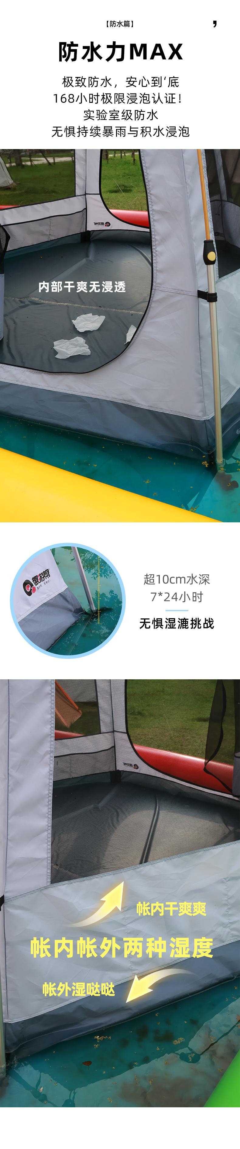 8 级强风防护,专业级户外抗造;双重深度压胶,PU8000 暴雨级防水;六角双层结构,四季通用保暖防潮;超大旅居空间,5-6 人舒适共处;UPF50 + 高倍防晒,全波段紫外线阻隔
