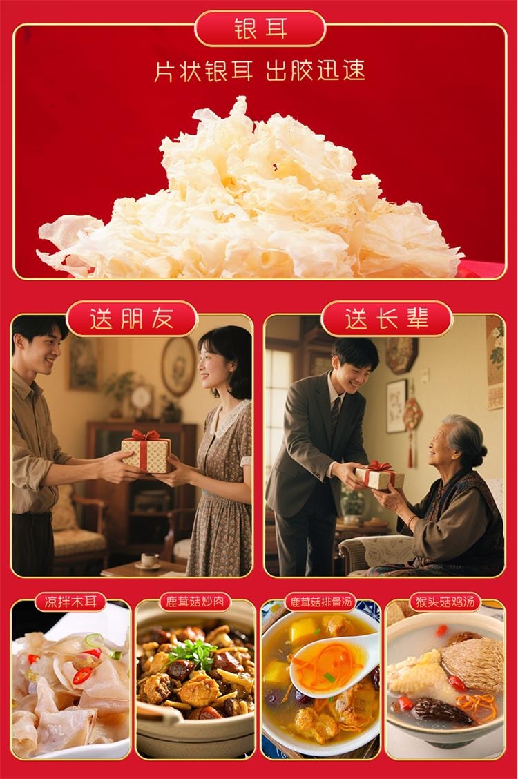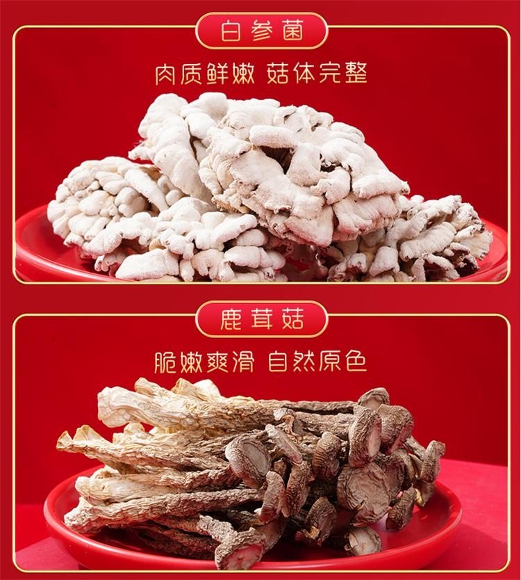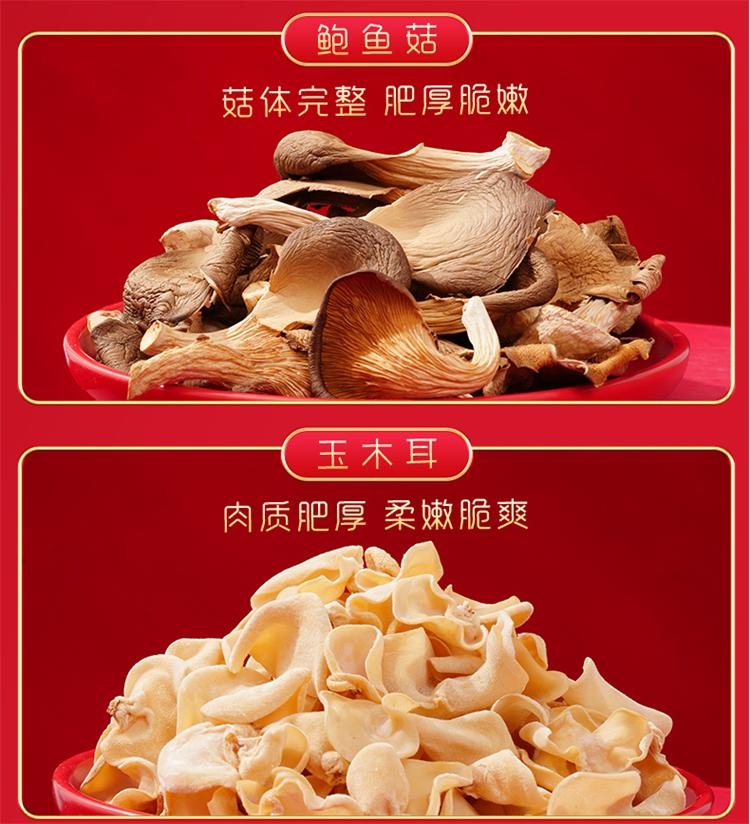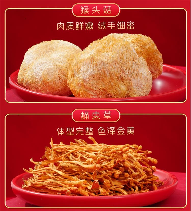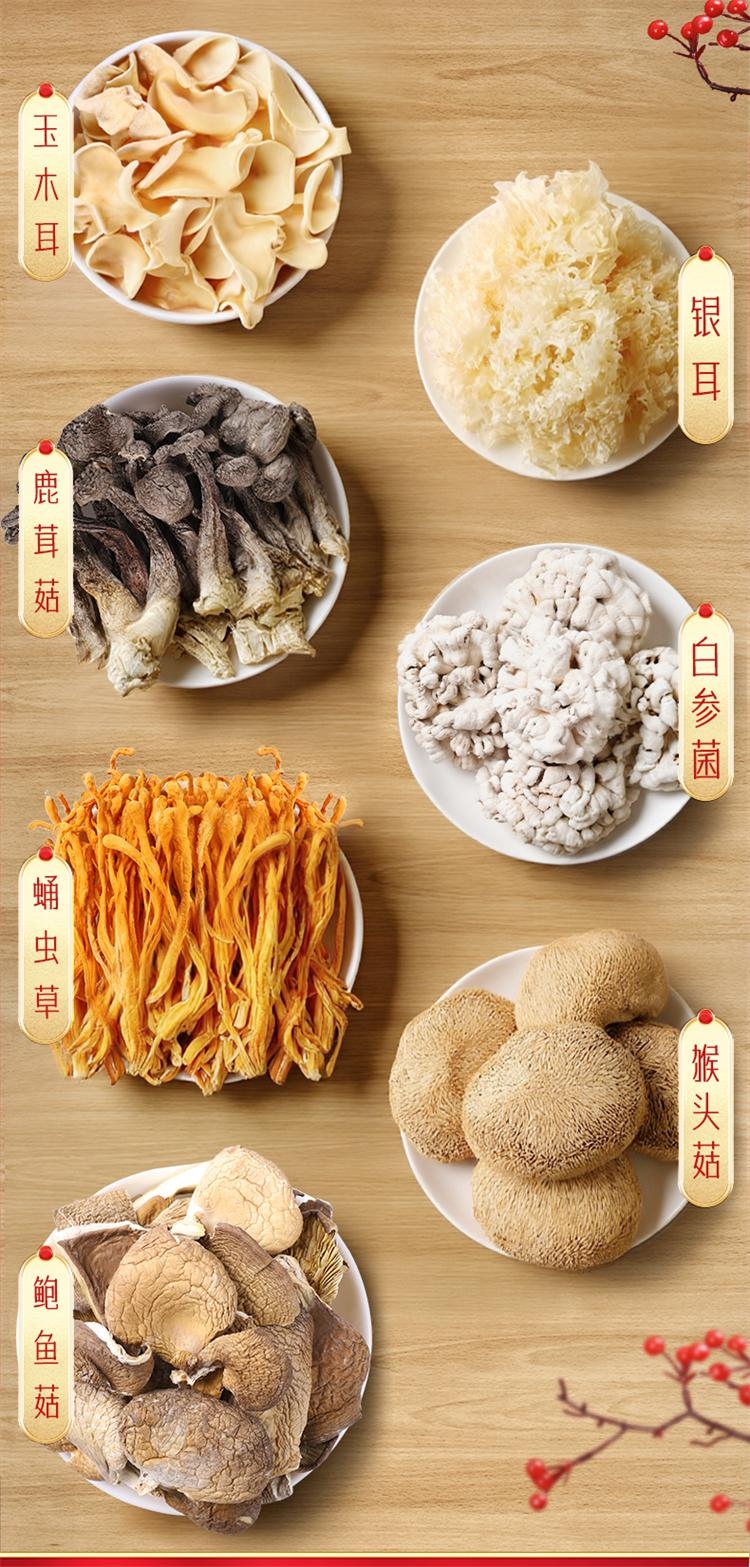 配置清单:玉木耳75g 鹿茸菇50g 鲍鱼菇40g 白参菌50g 蛹虫草70g 猴头菇50g 银耳(片状)30g