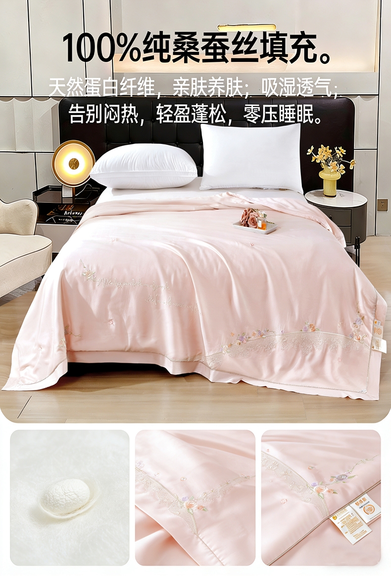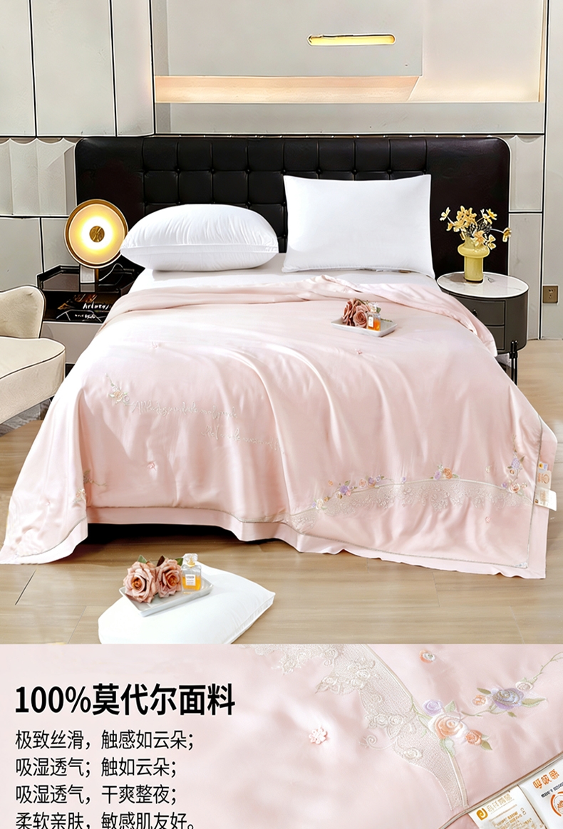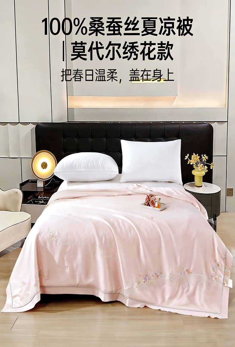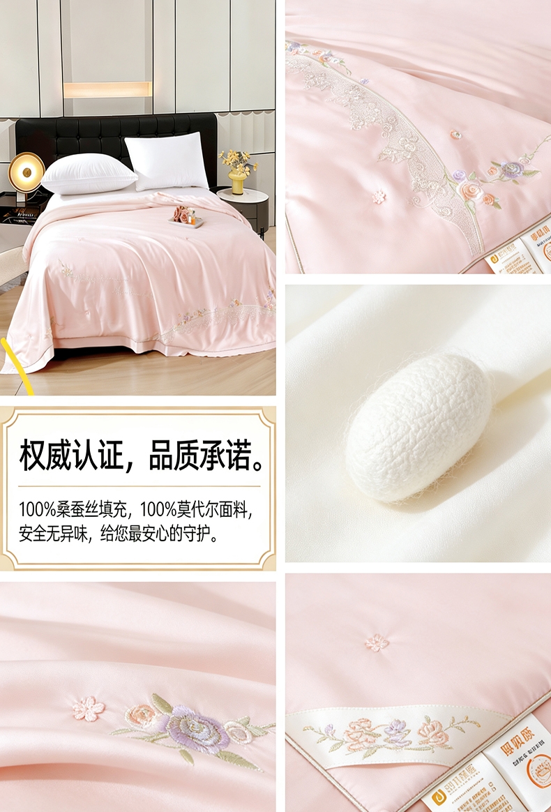 100%莫代尔面料,舒适柔软;100%蚕丝填充,天然环保,吸湿透气;绣花工艺,彰显尊贵