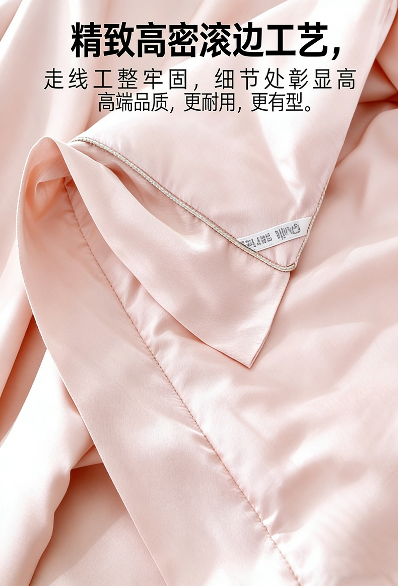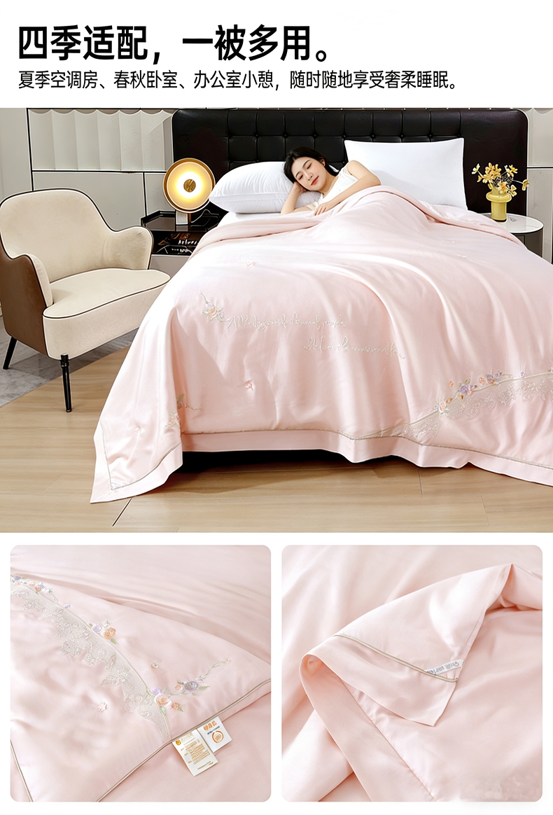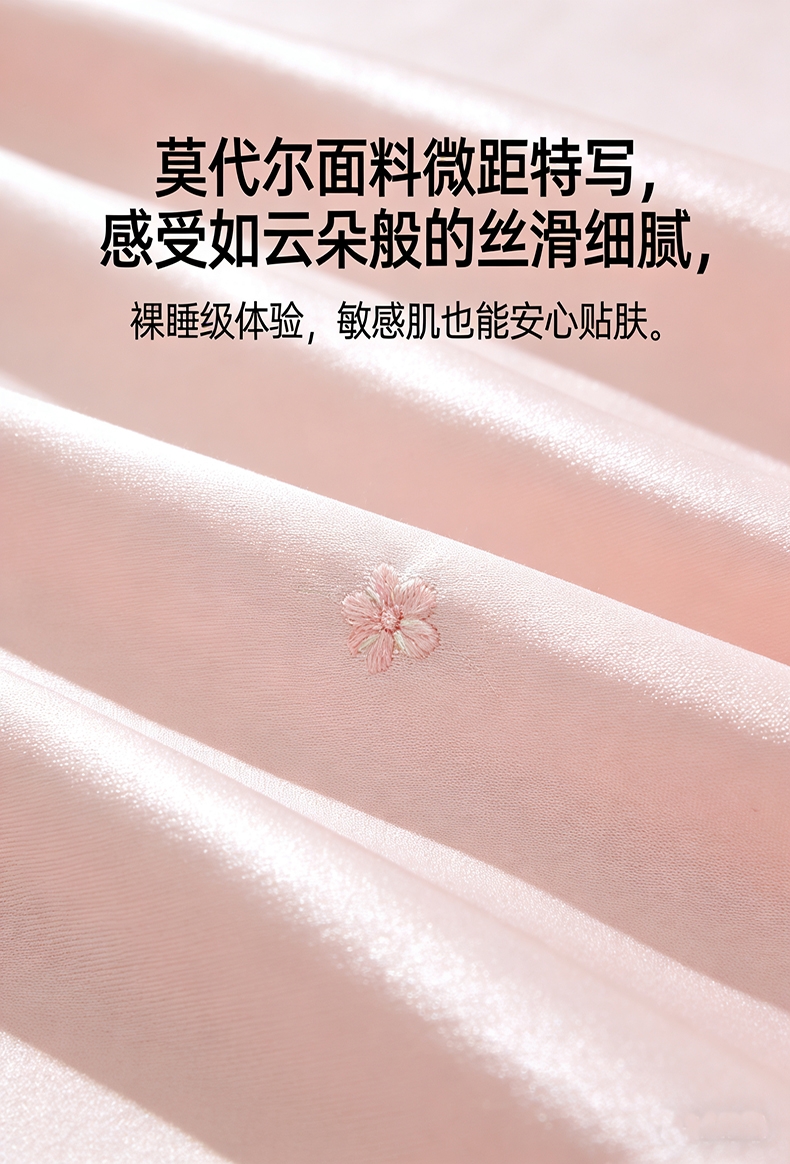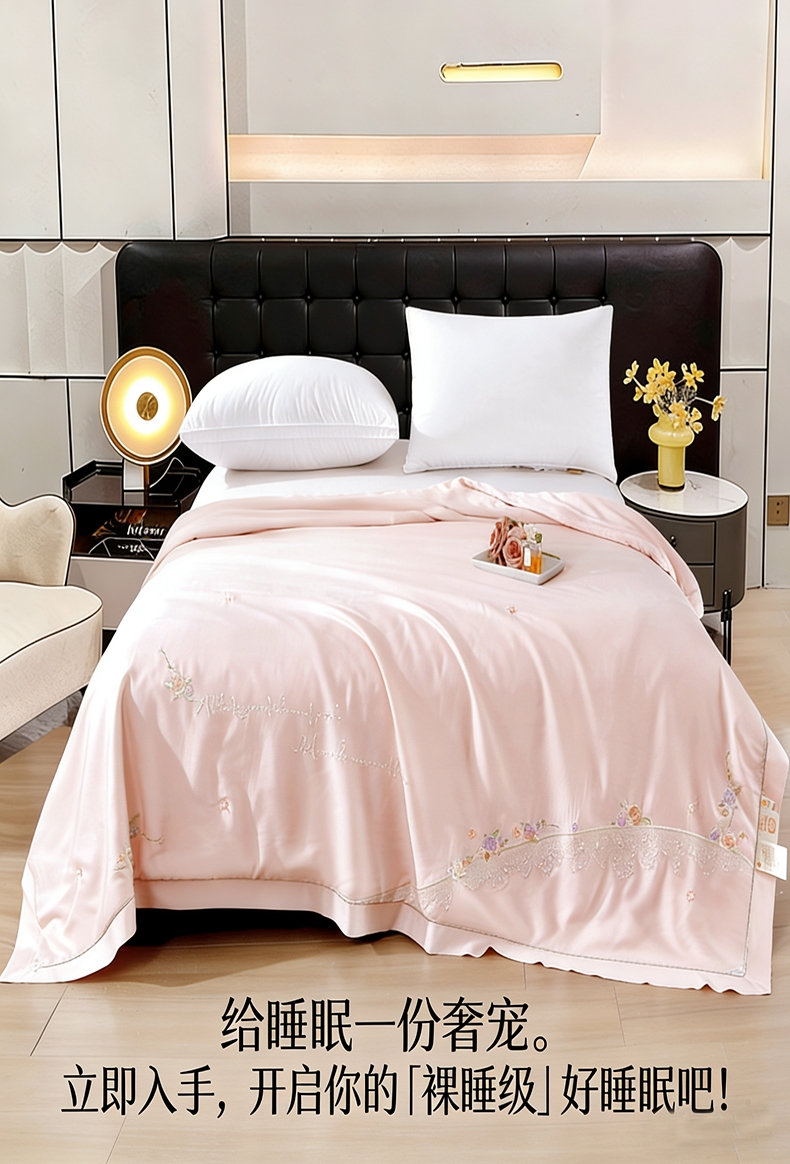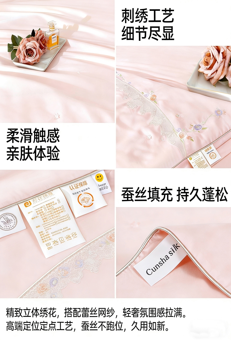 100%莫代尔面料,舒适柔软;100%蚕丝填充,天然环保,吸湿透气;绣花工艺,彰显尊贵