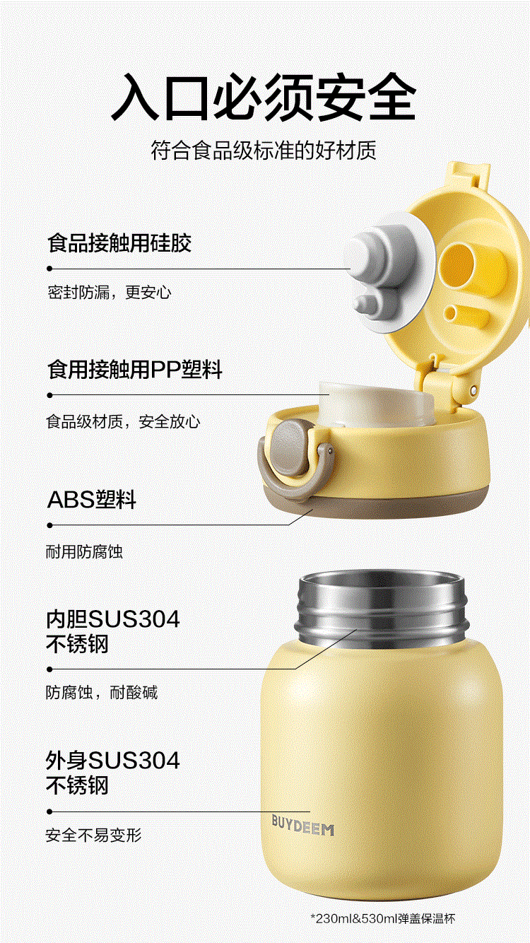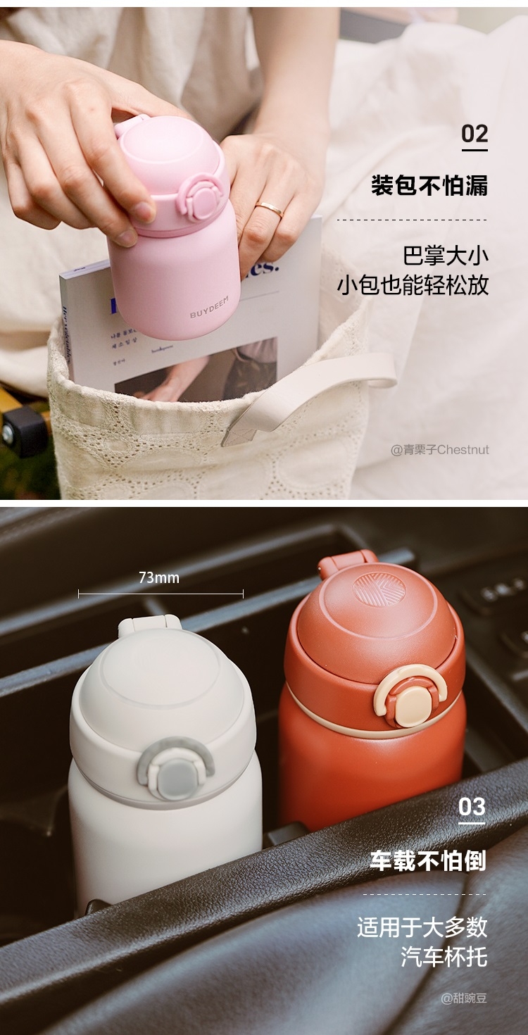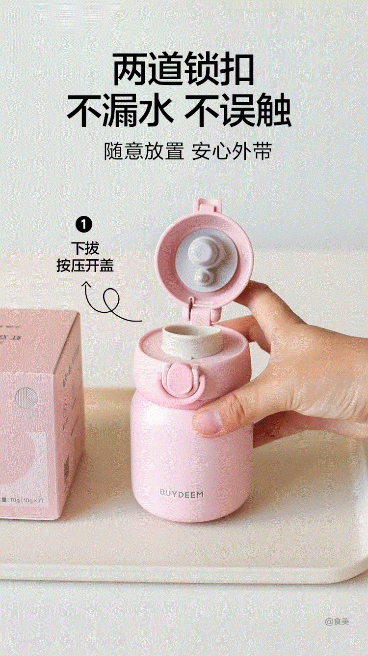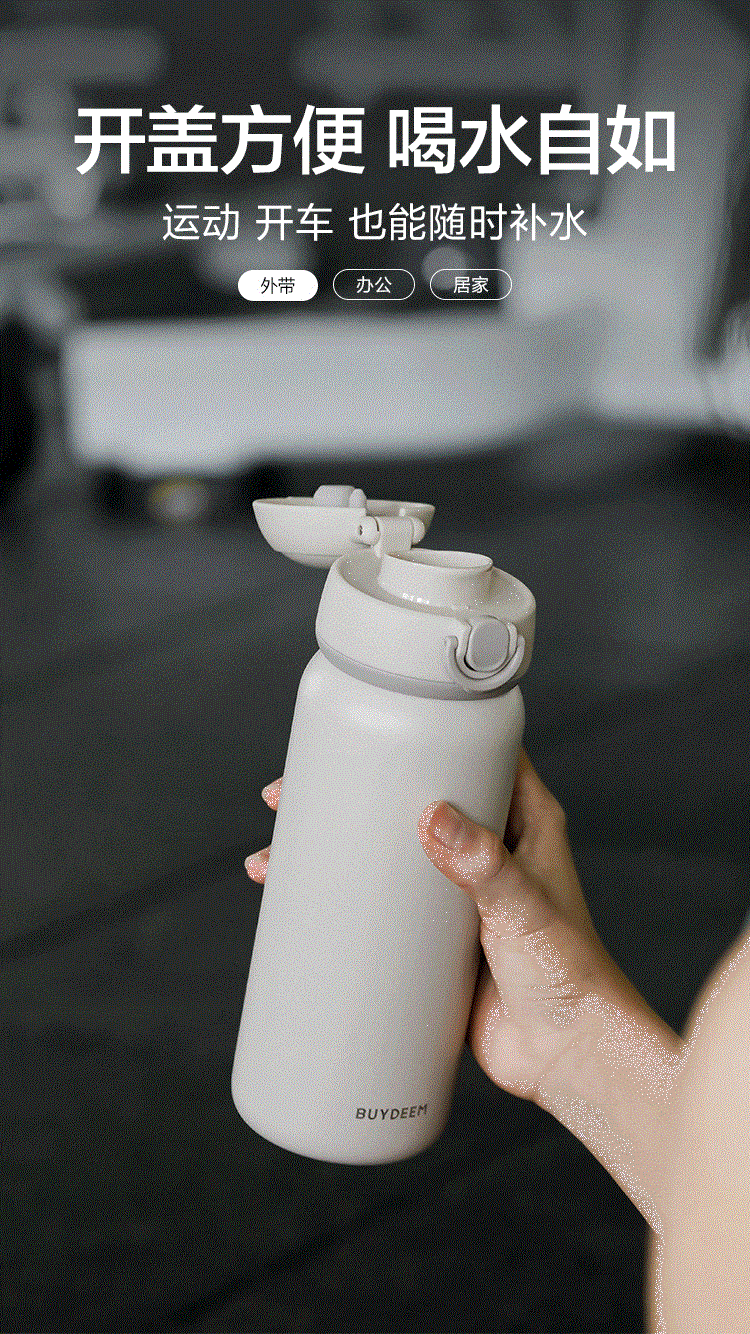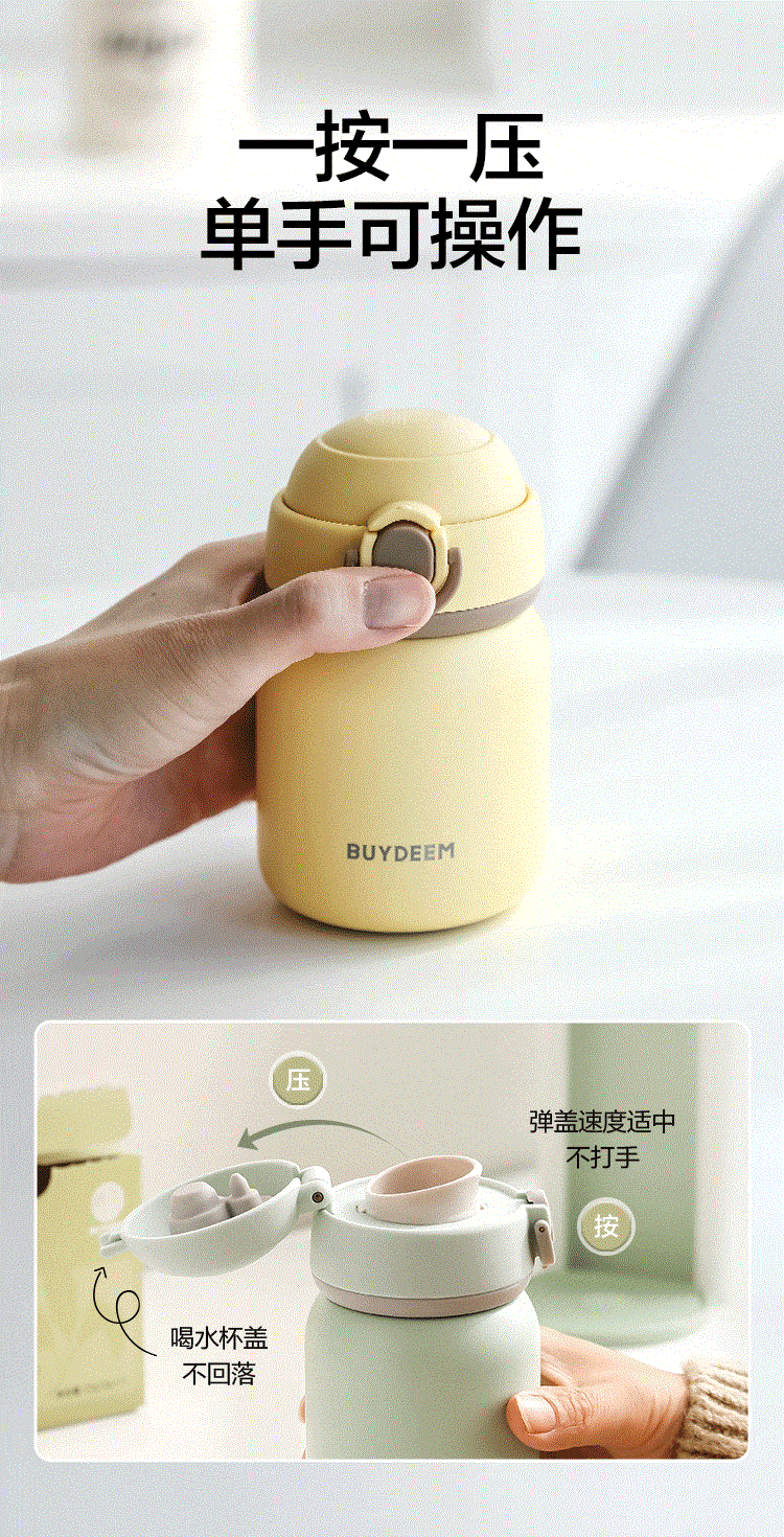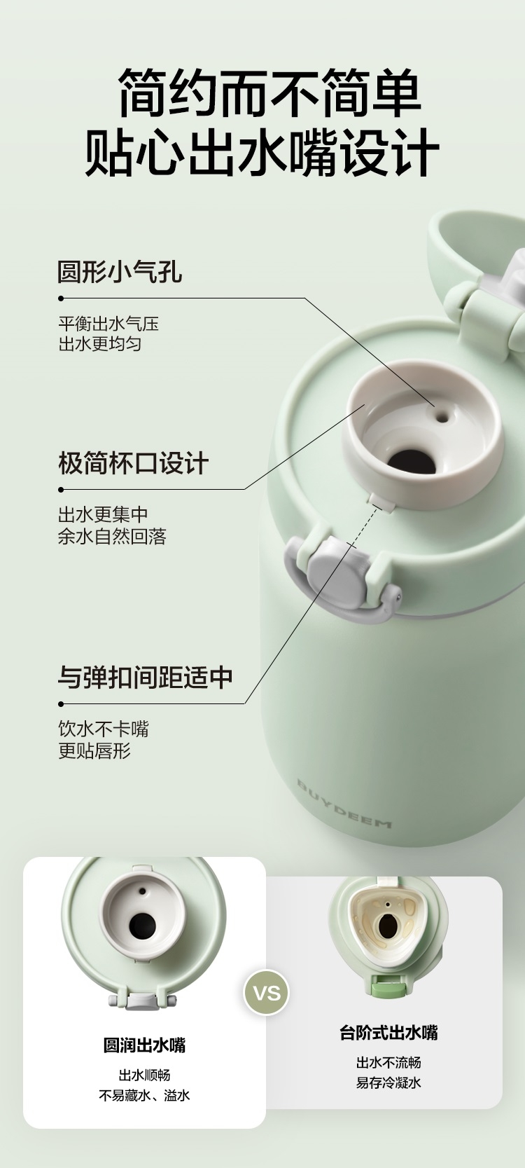 开盖方便,一按一压单手可操作;;贴心出水嘴设计,出水更流畅喝水不卡嘴;;两道锁扣,不漏水防误触安心外带;