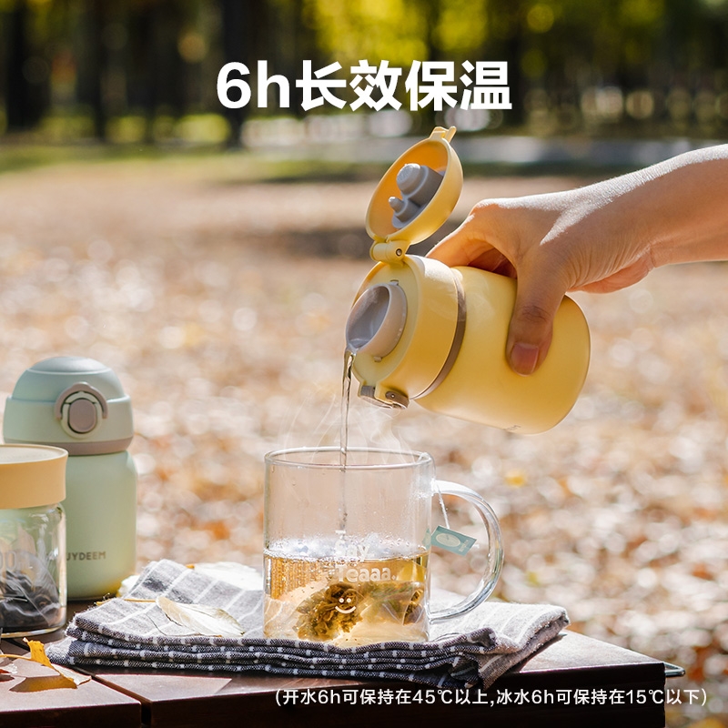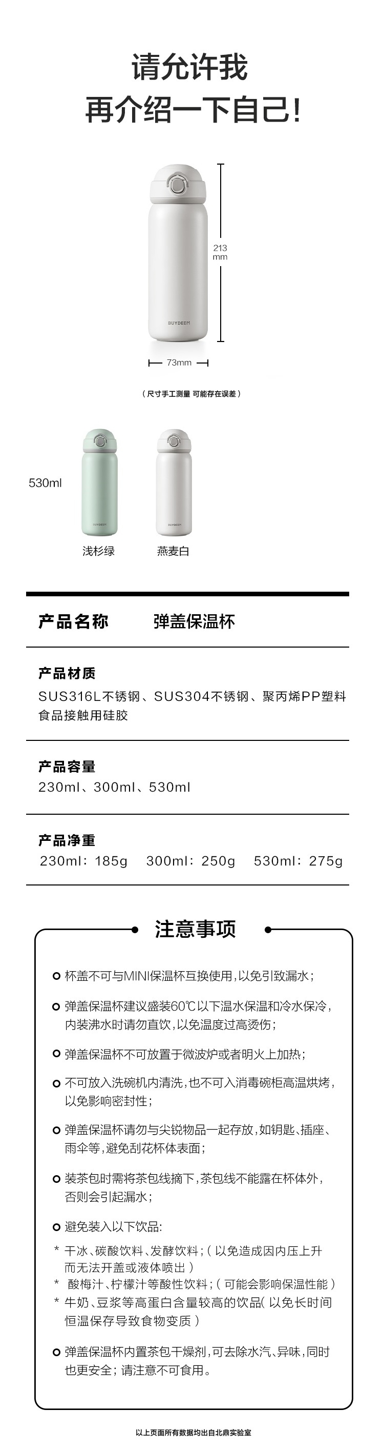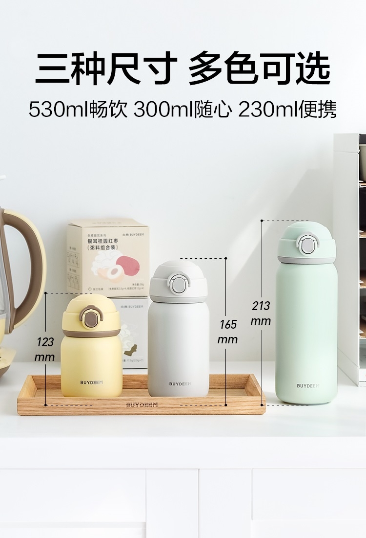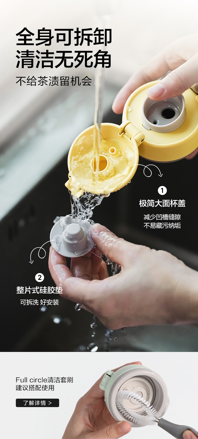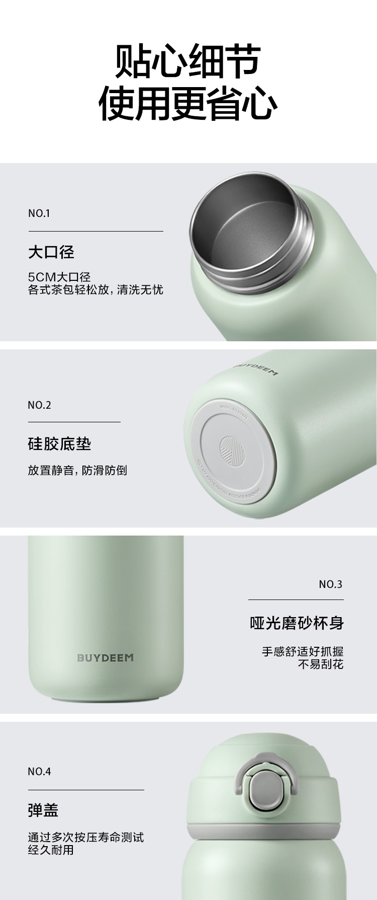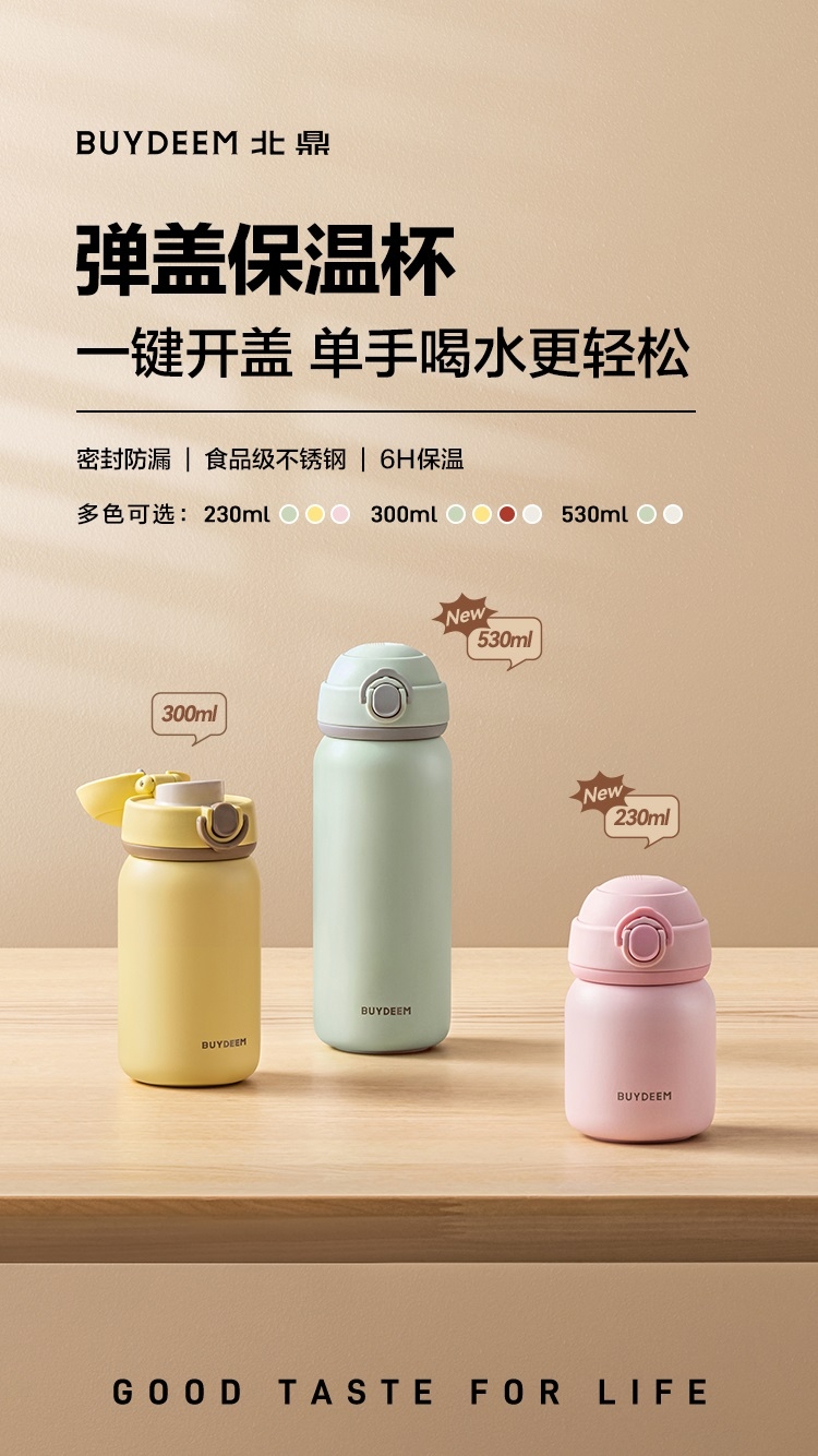 开盖方便,一按一压单手可操作;;贴心出水嘴设计,出水更流畅喝水不卡嘴;;两道锁扣,不漏水防误触安心外带;