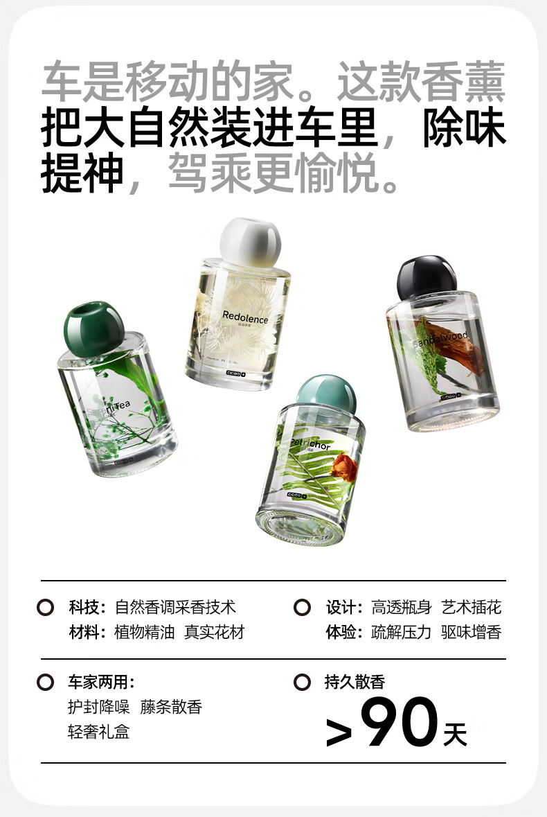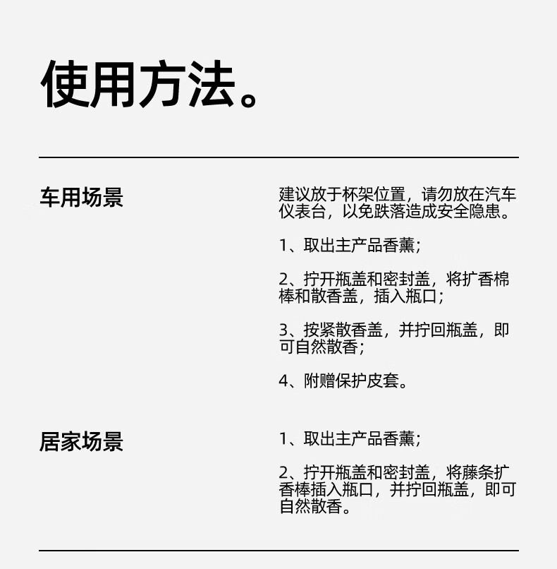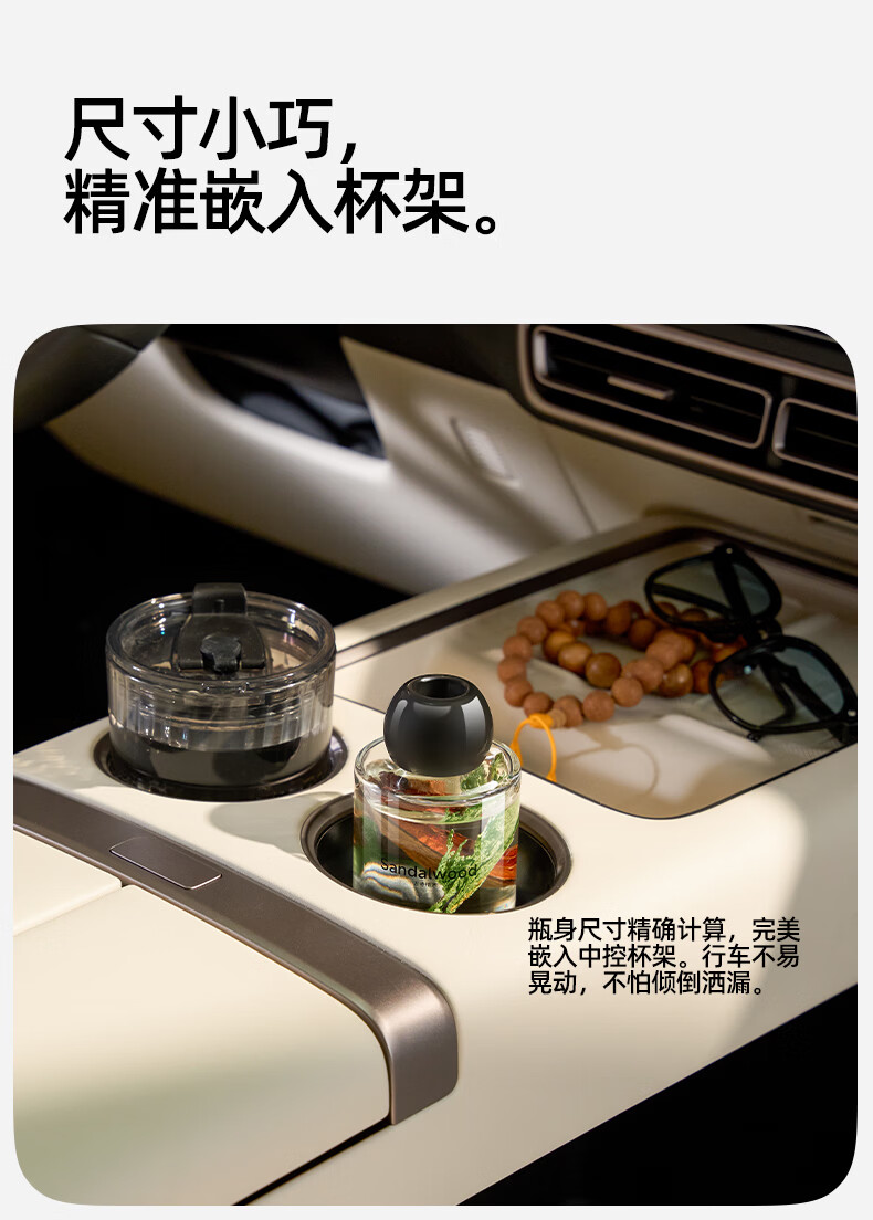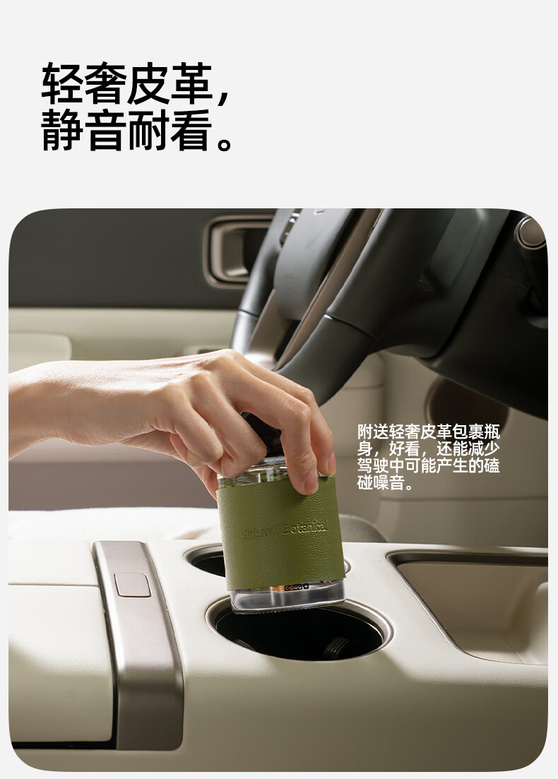 汽车、家用、办公都可用,自带专业扩香藤条,即插即用;附送轻奢皮革包裹瓶身,好看同时能减少驾驶中可能产生;瓶身尺寸精确计算,完美嵌入中控杯架。行车不易晃动