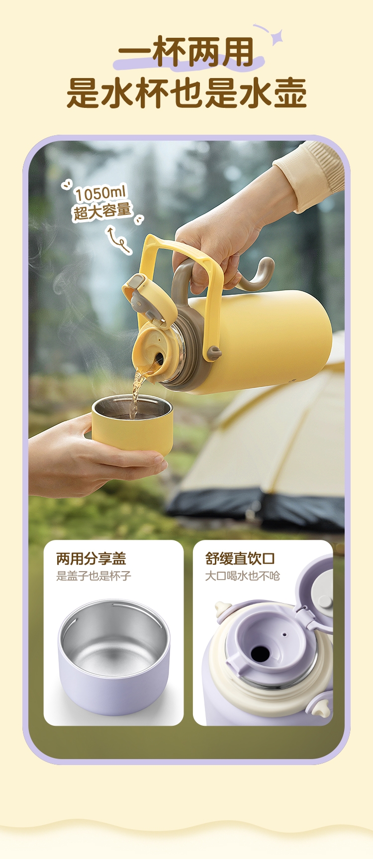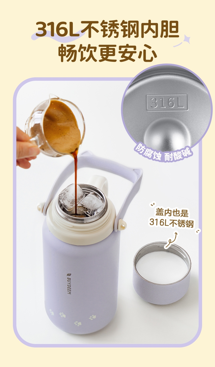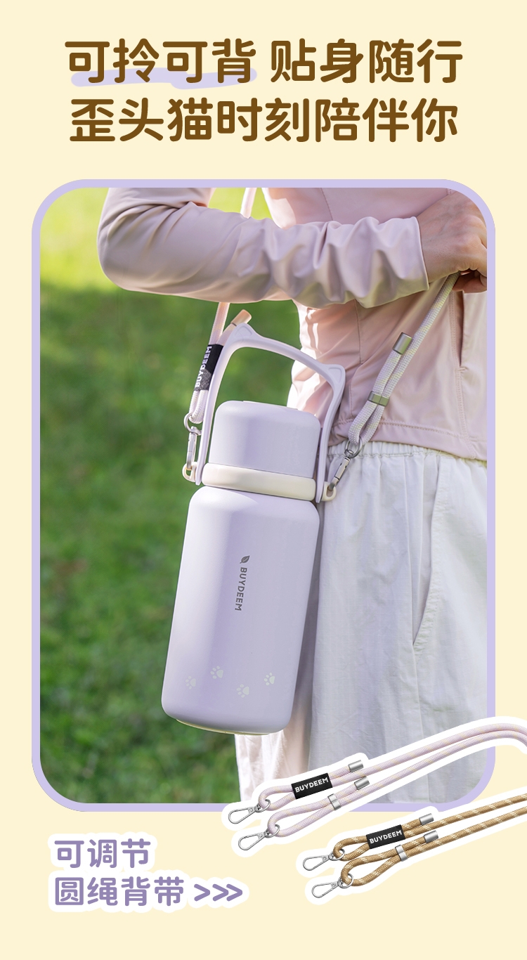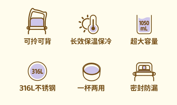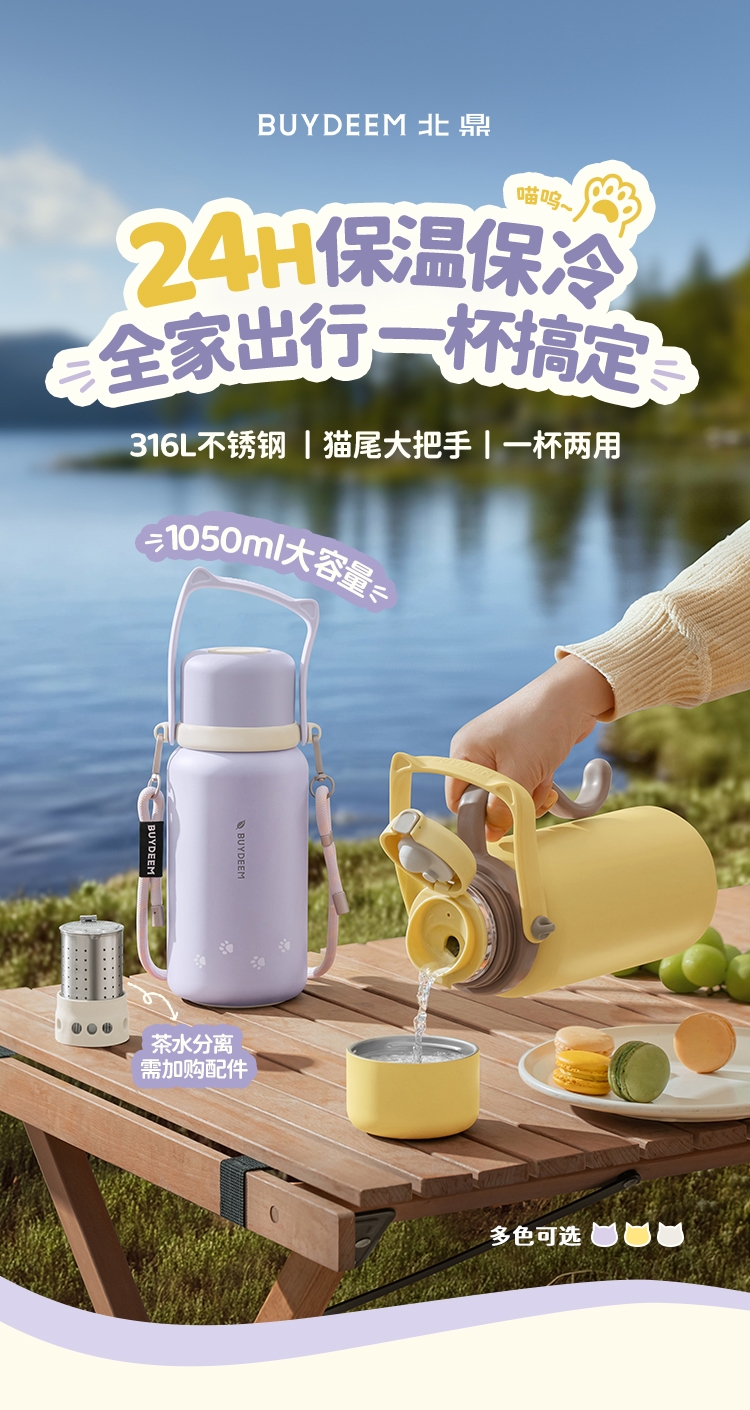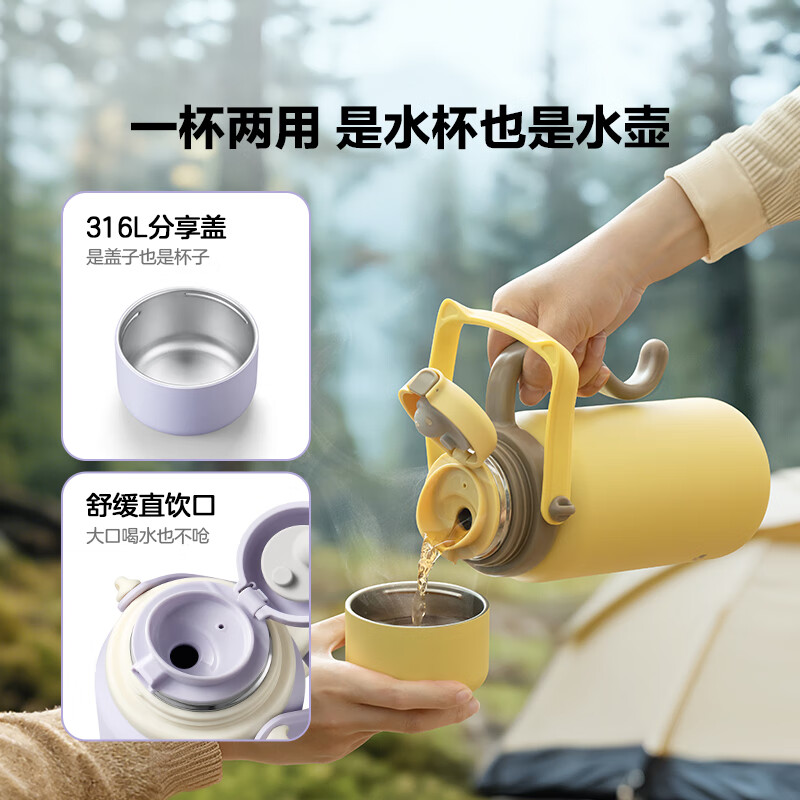 一杯两用,是水杯也是水壶,一倒一立,可闷茶,可泡茶;可拎可背,背带可调节;;三道锁扣,不漏水防误触安心外带;