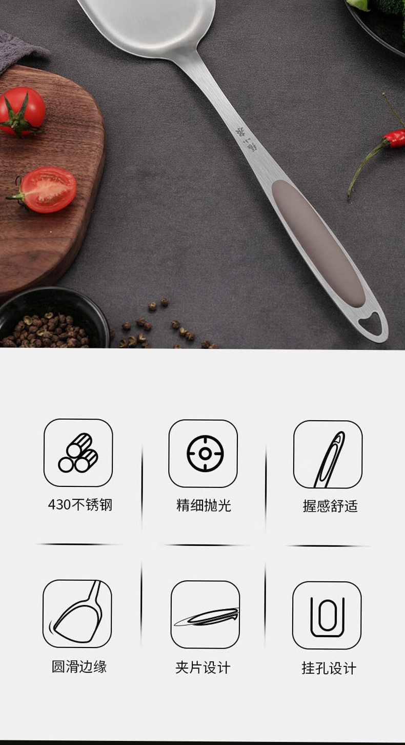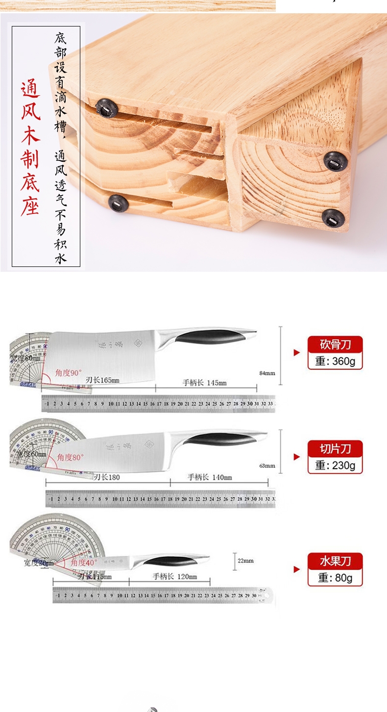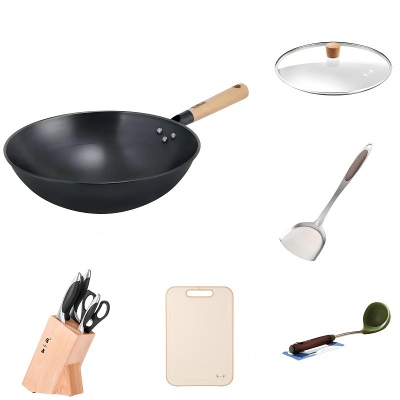 耐用防锈铁锅,品质不锈钢铲;银离子抗菌砧板,双面可用,生熟分切,料理不串味;优选30Cr13不锈钢套刀,通风木质底座