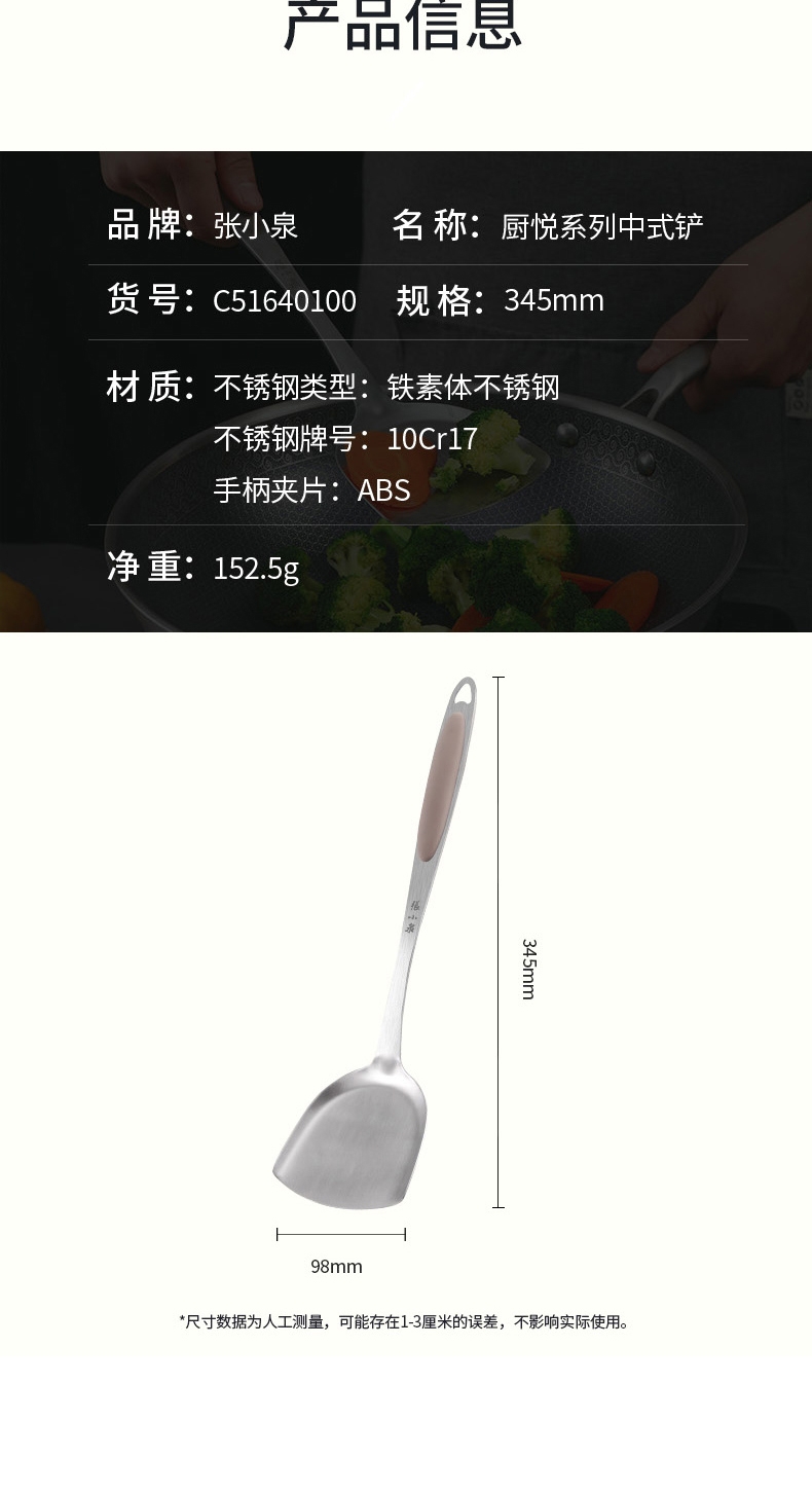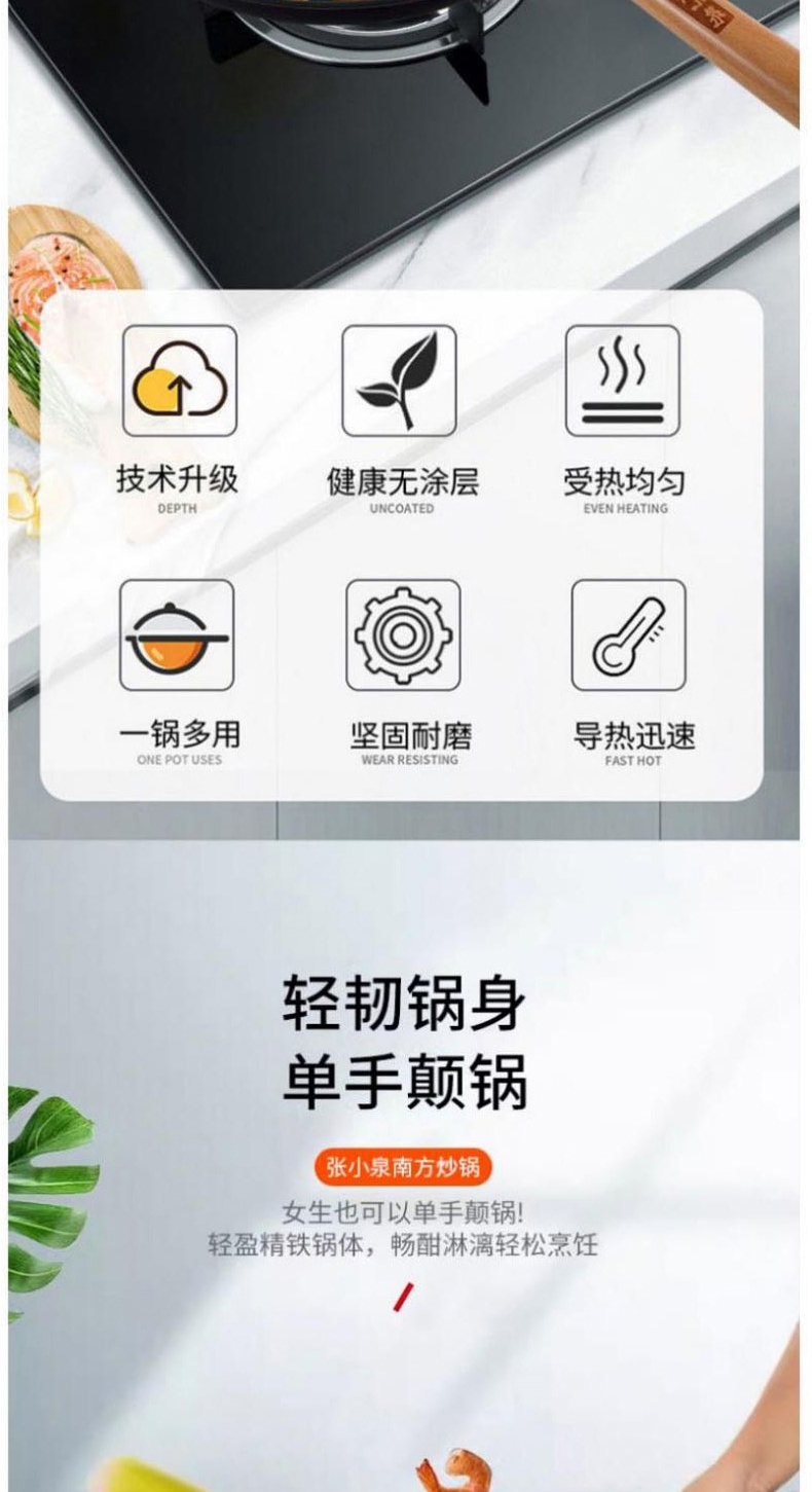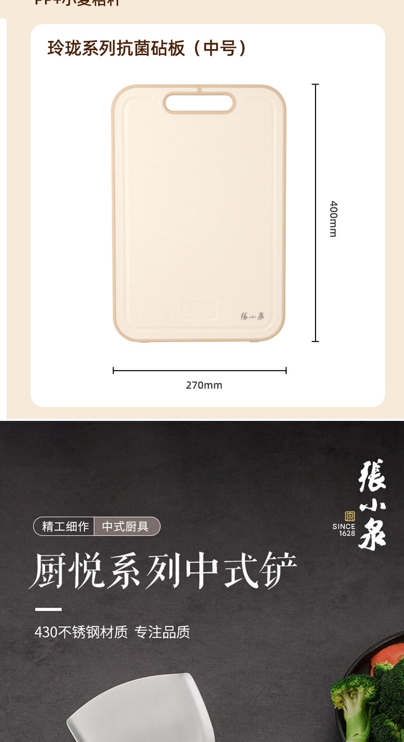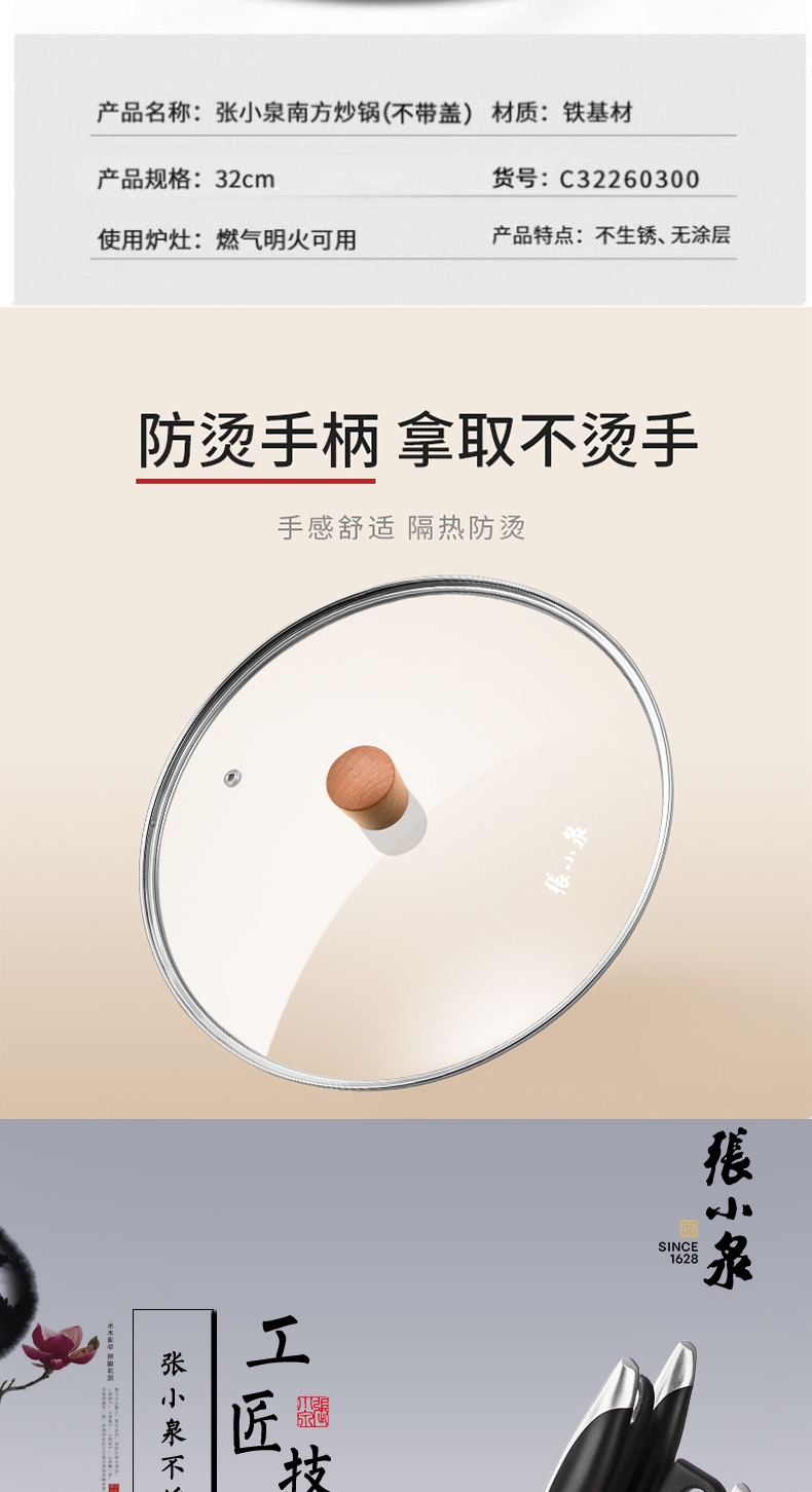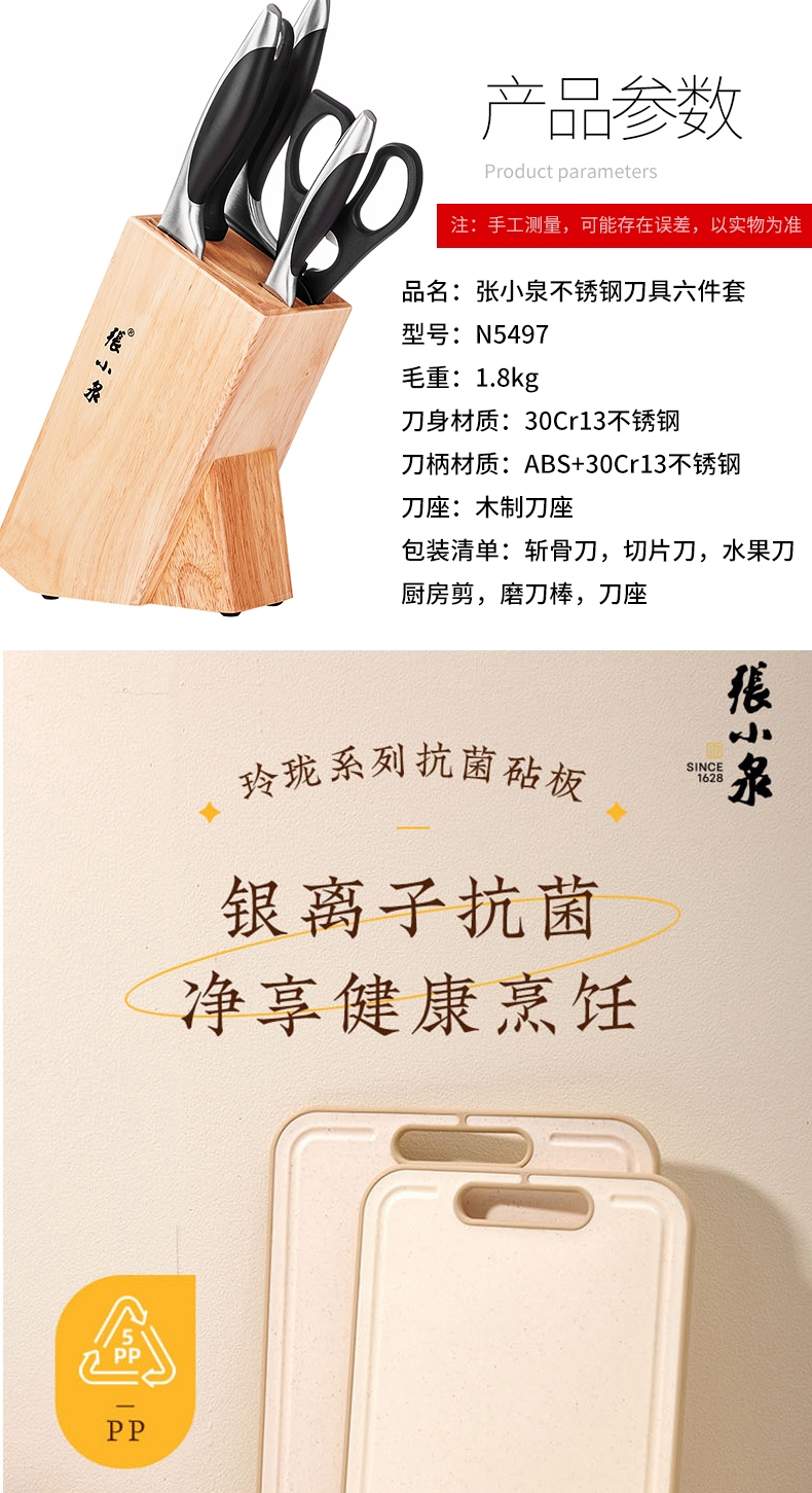 配置清单:张小泉南方铁锅C32260300*1 张小泉304钢化玻璃盖 C33200200*1 张小泉厨悦系列中式铲C51640100*1 张小泉庖膳系列硅胶汤勺C501001*1 张小泉不锈钢刀具六件套N5497*1 张小泉玲珑系列抗菌砧板C500742(中号)*1